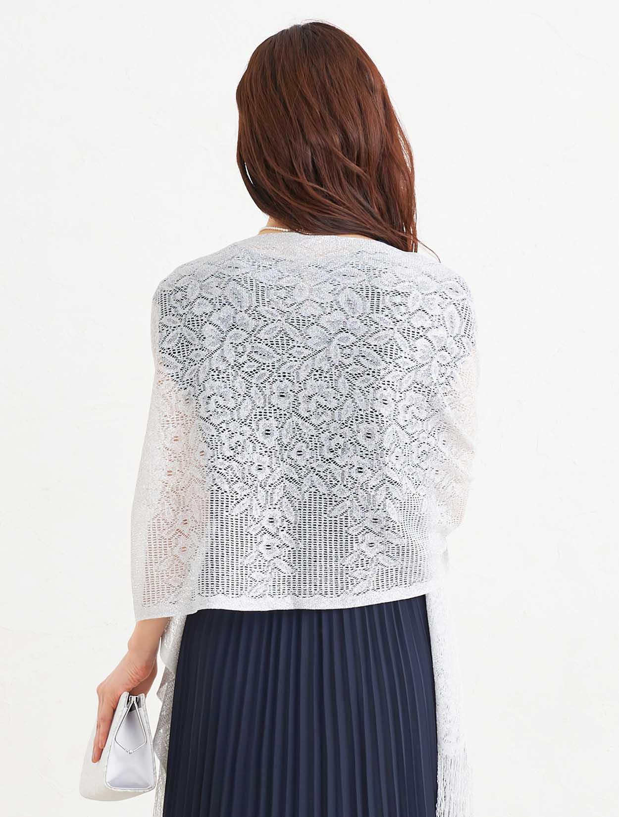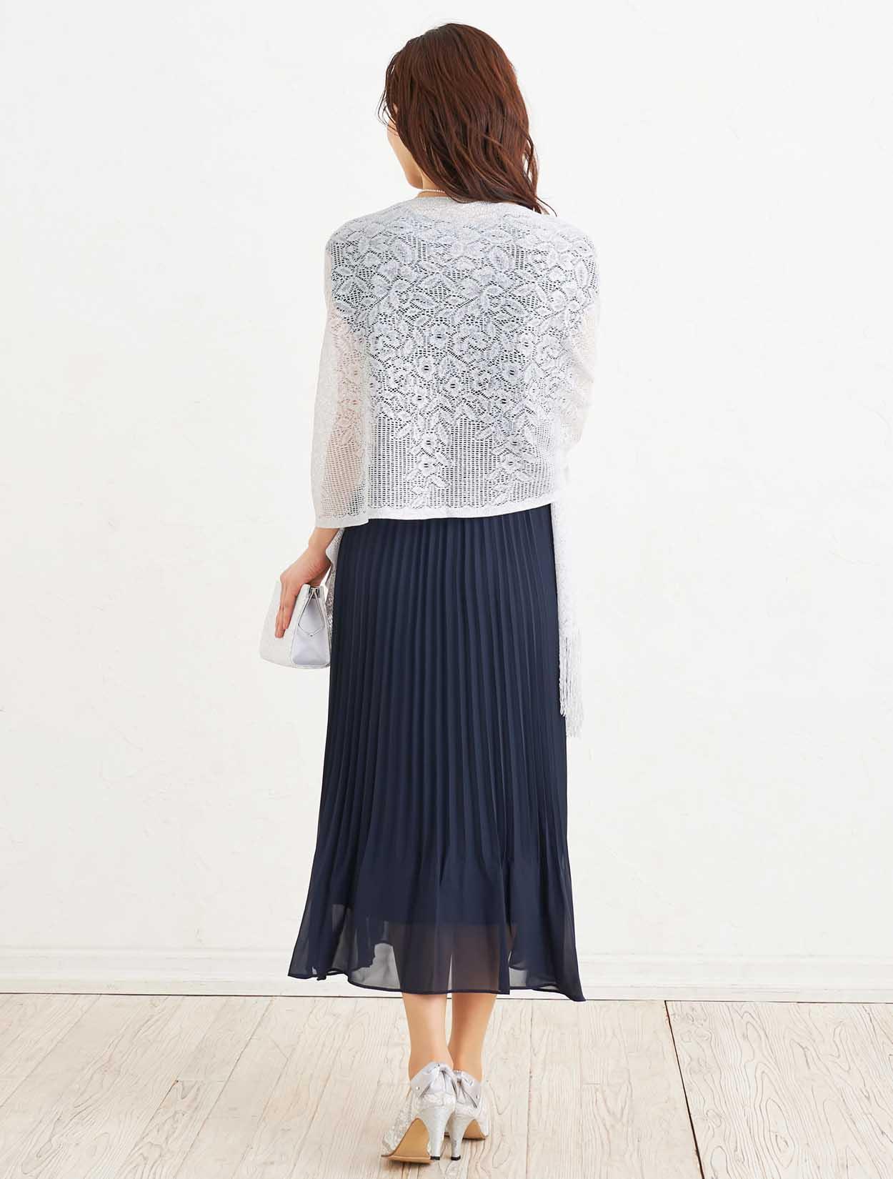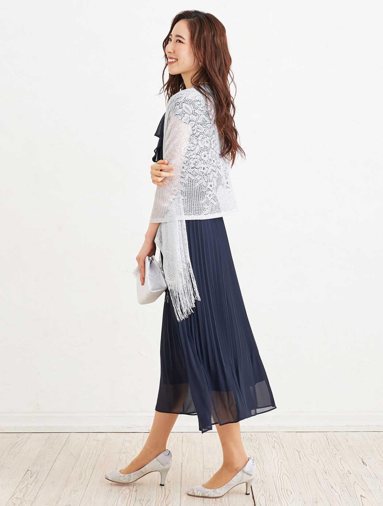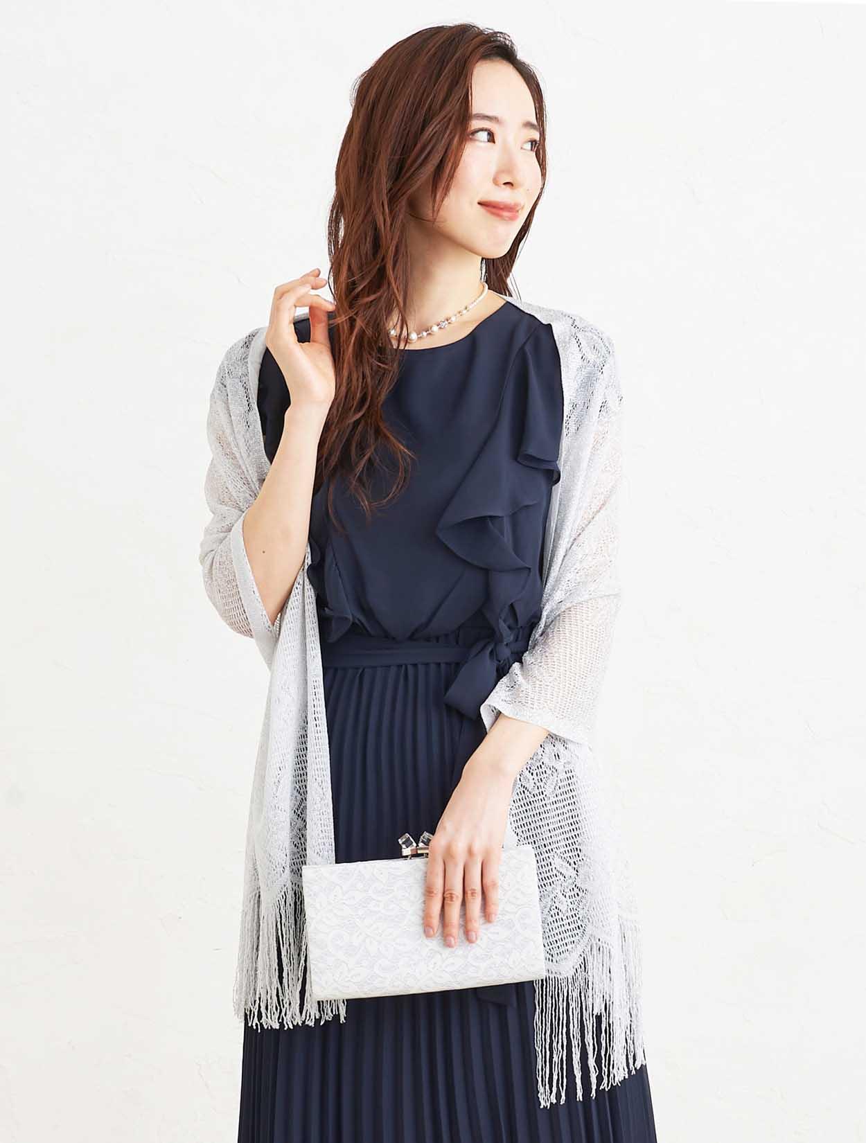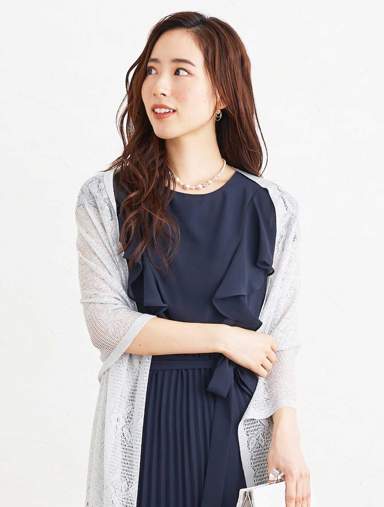 ■大人っぽい清楚な印象のネイビーのドレスにシルバーのストールで清潔感のあるコーディネート。