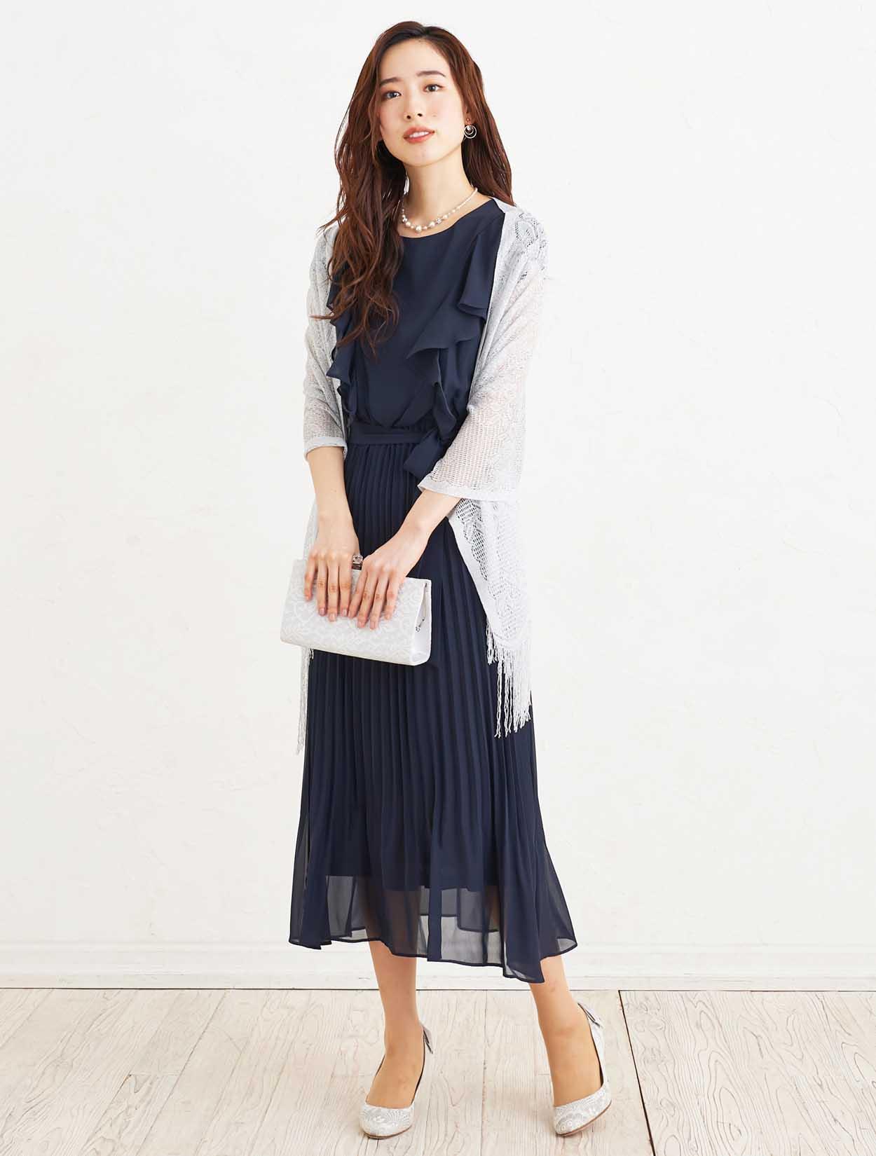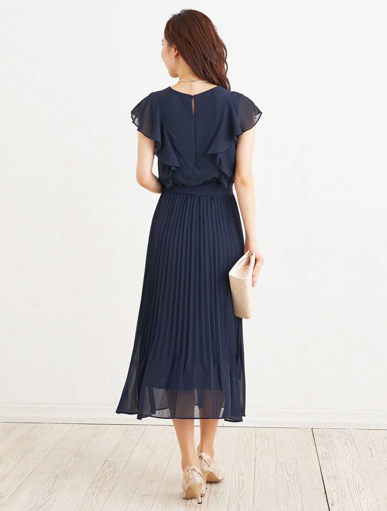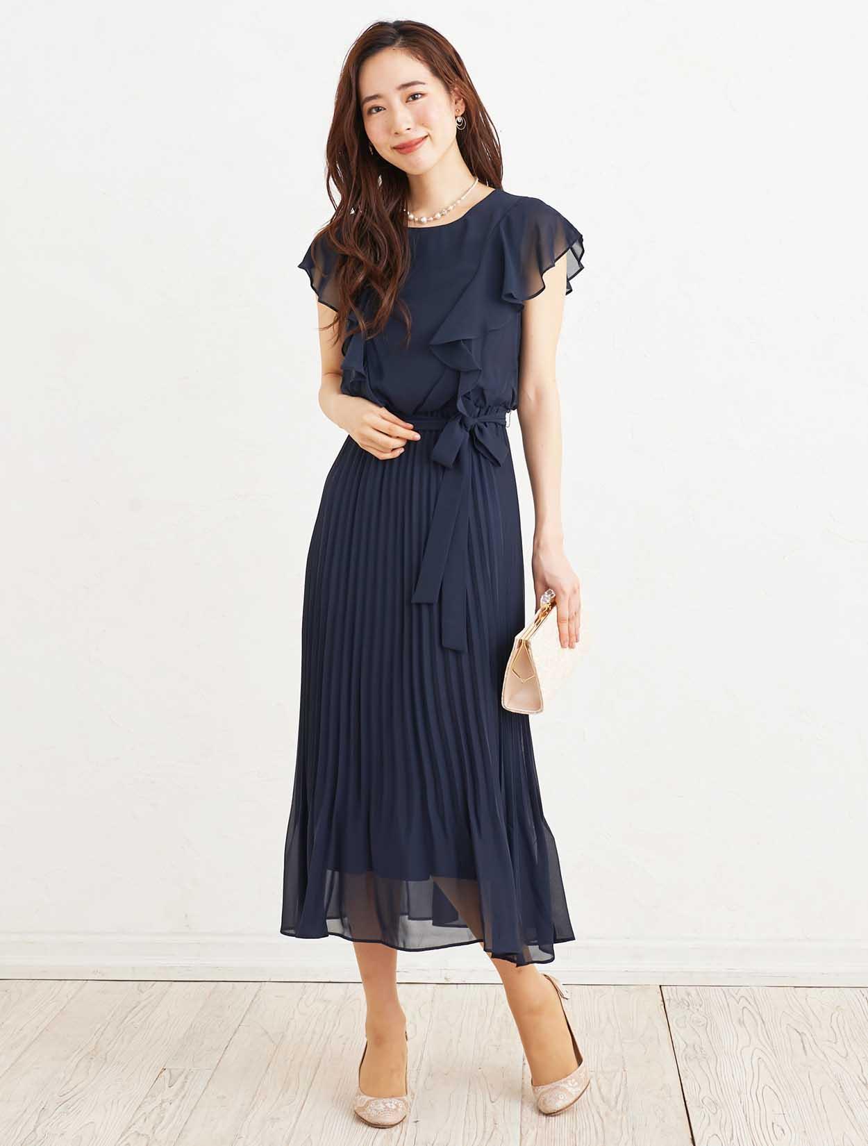 ■落ち着いた定番カラーのネイビーのドレスは、たっぷりのラッフルとプリーツで華やかな印象に。