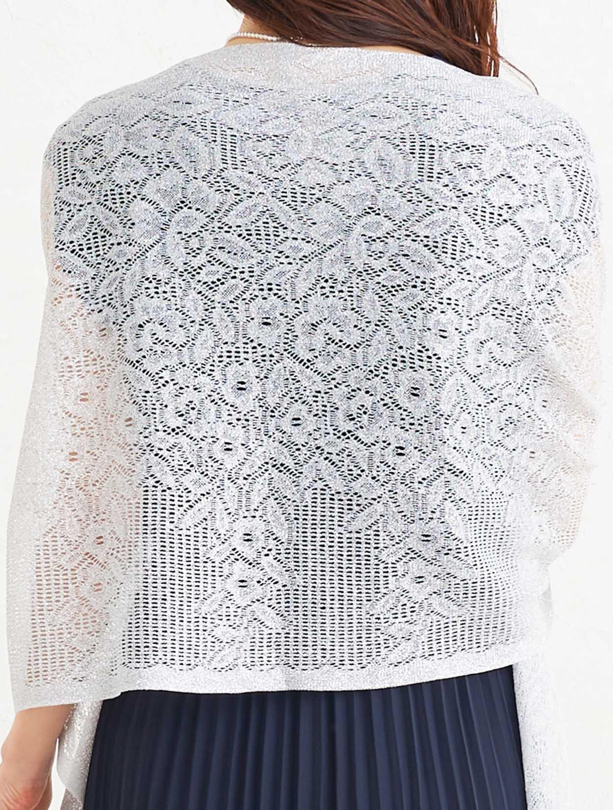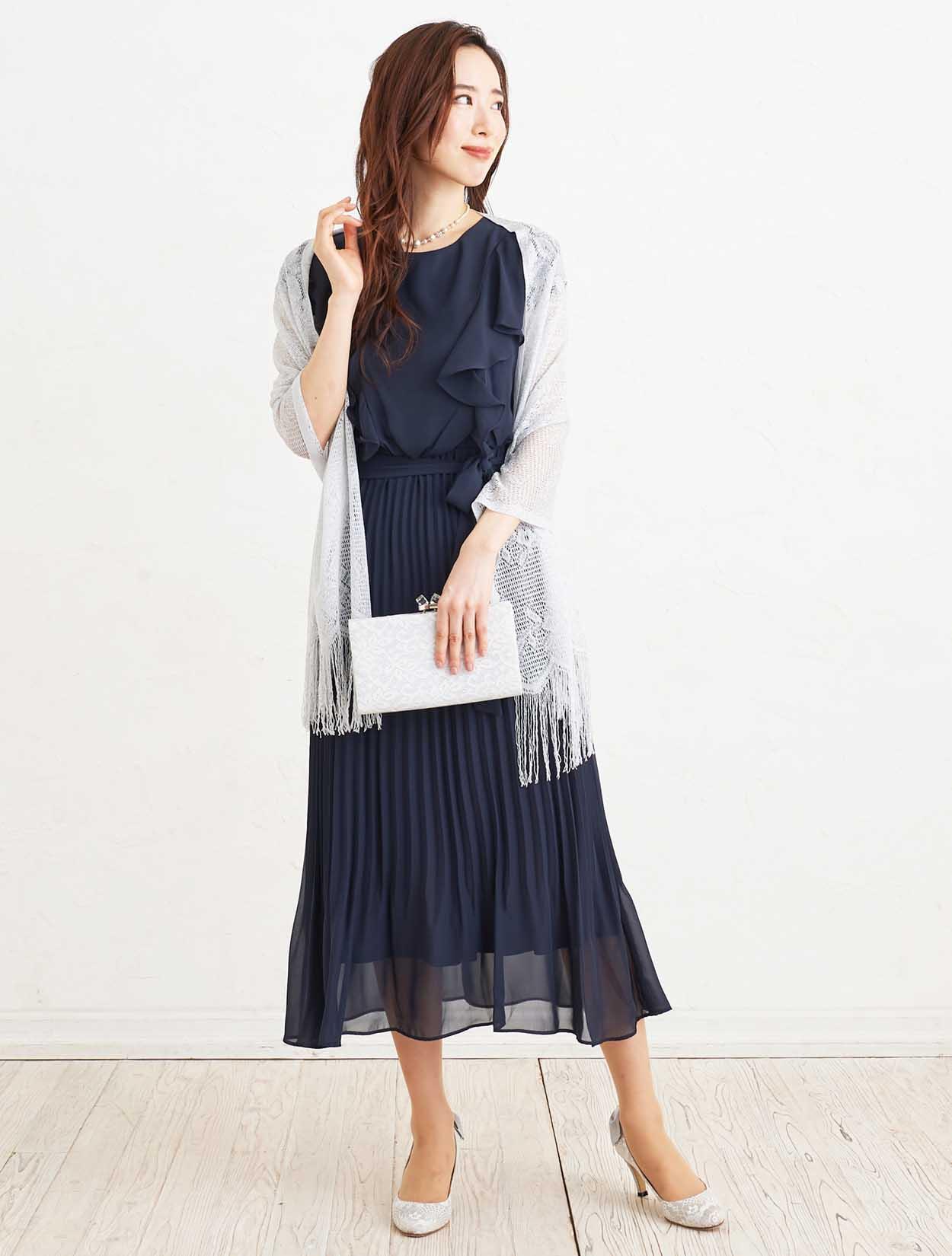 ■大人っぽい清楚な印象のネイビーのドレスにシルバーのストールで清潔感のあるコーディネート。
