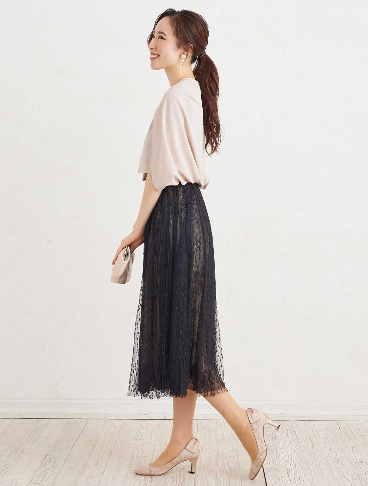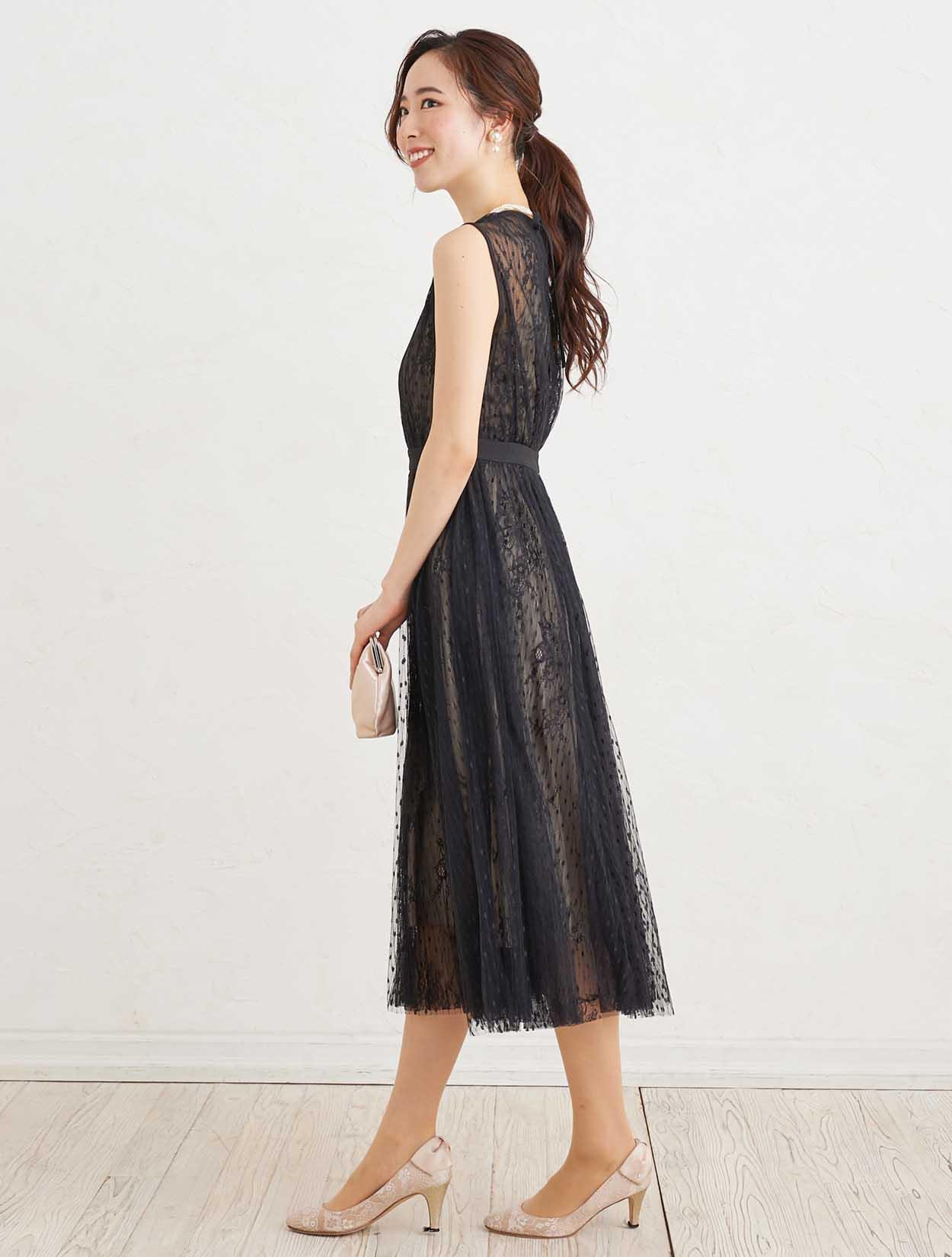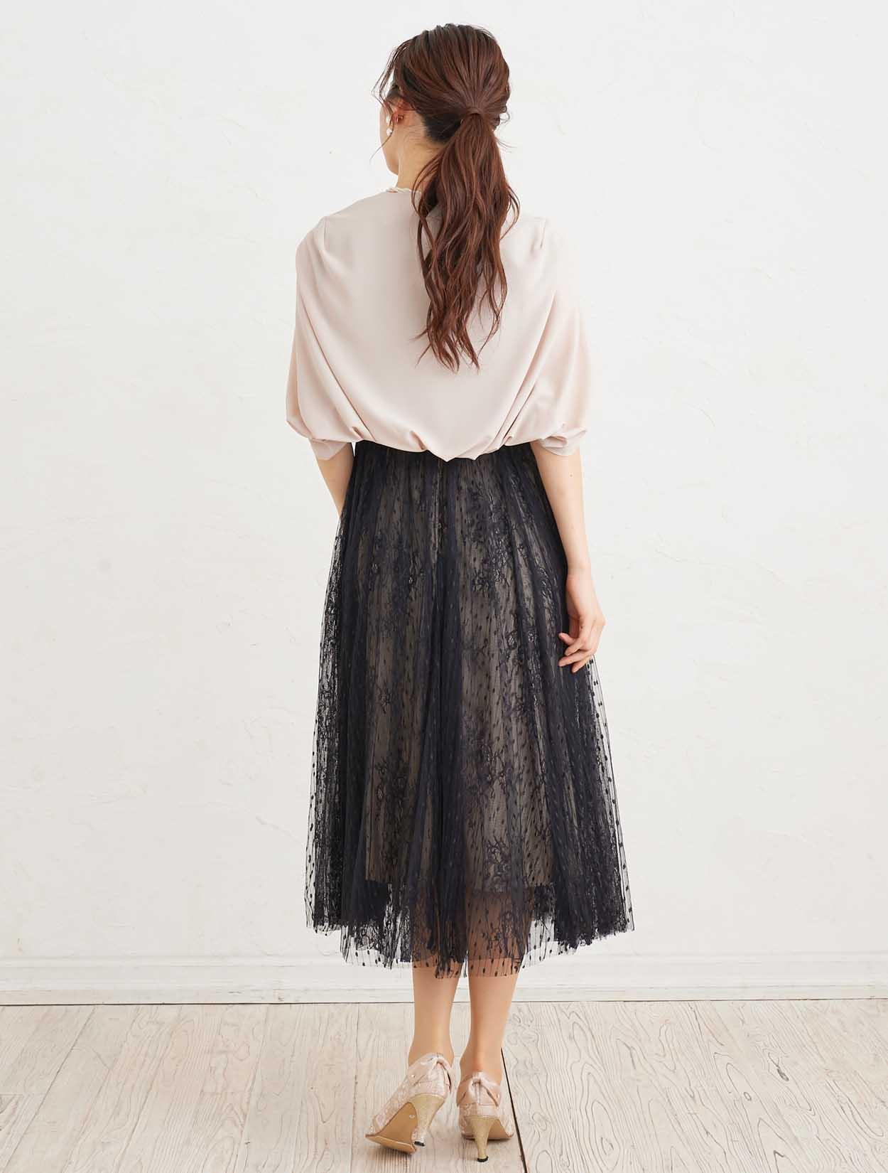 ■キュートなドット柄とエレガントなフラワーレースのチュール素材を2枚重ねた、エアリーなドレス。