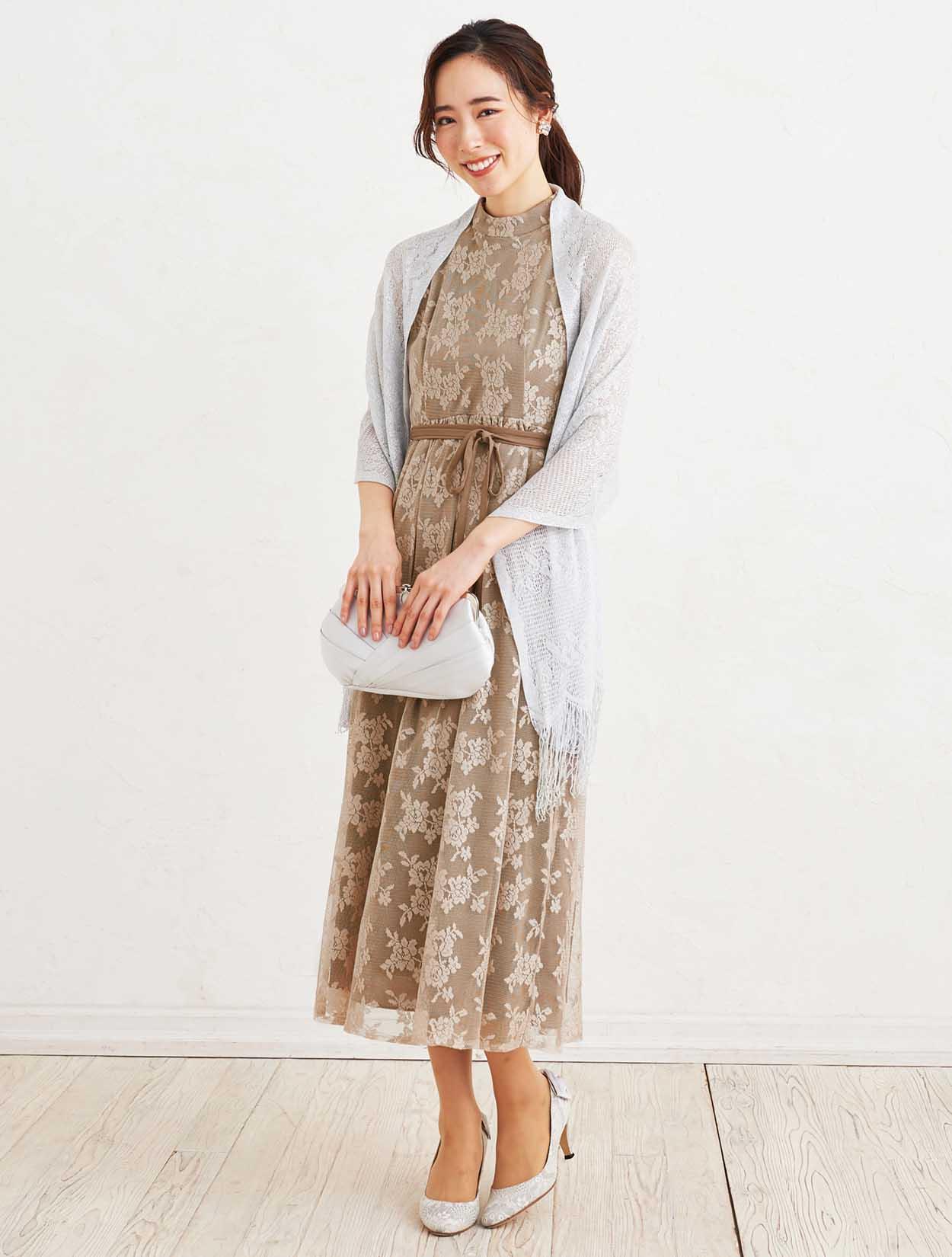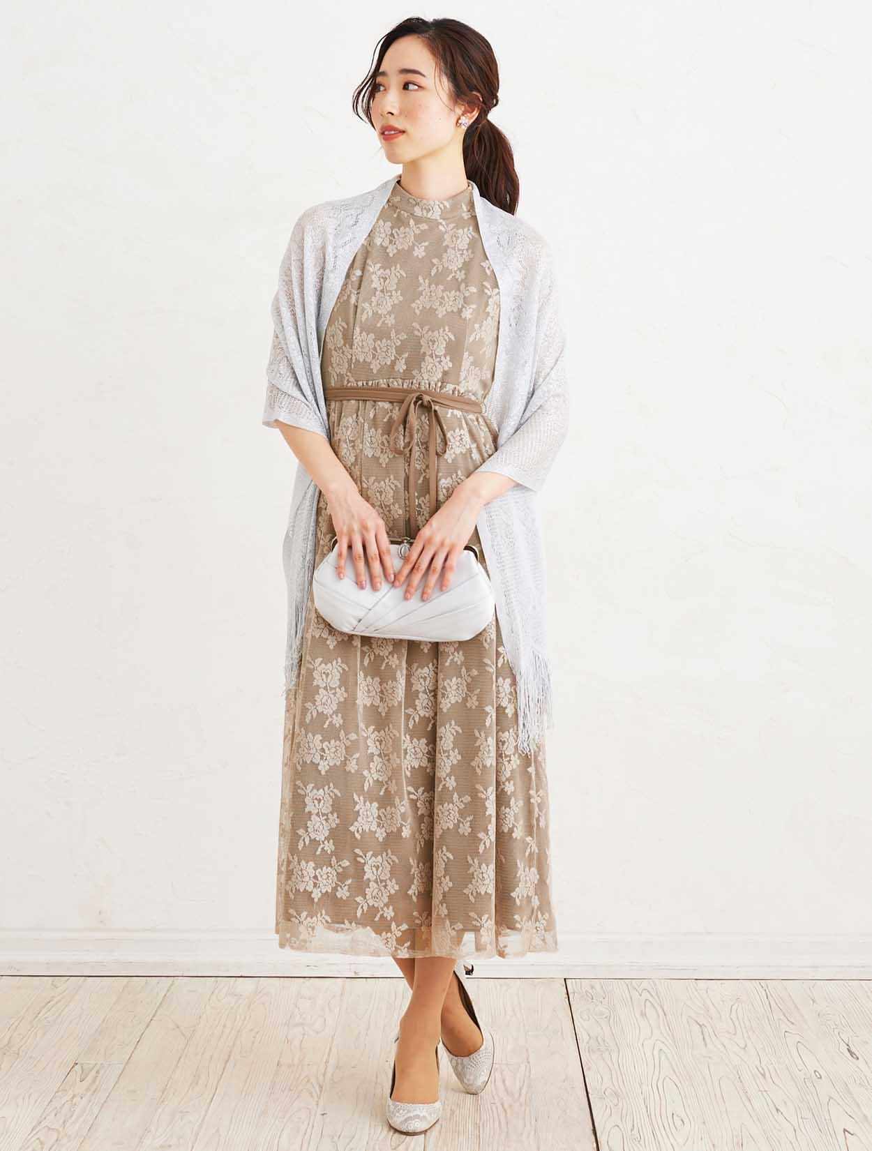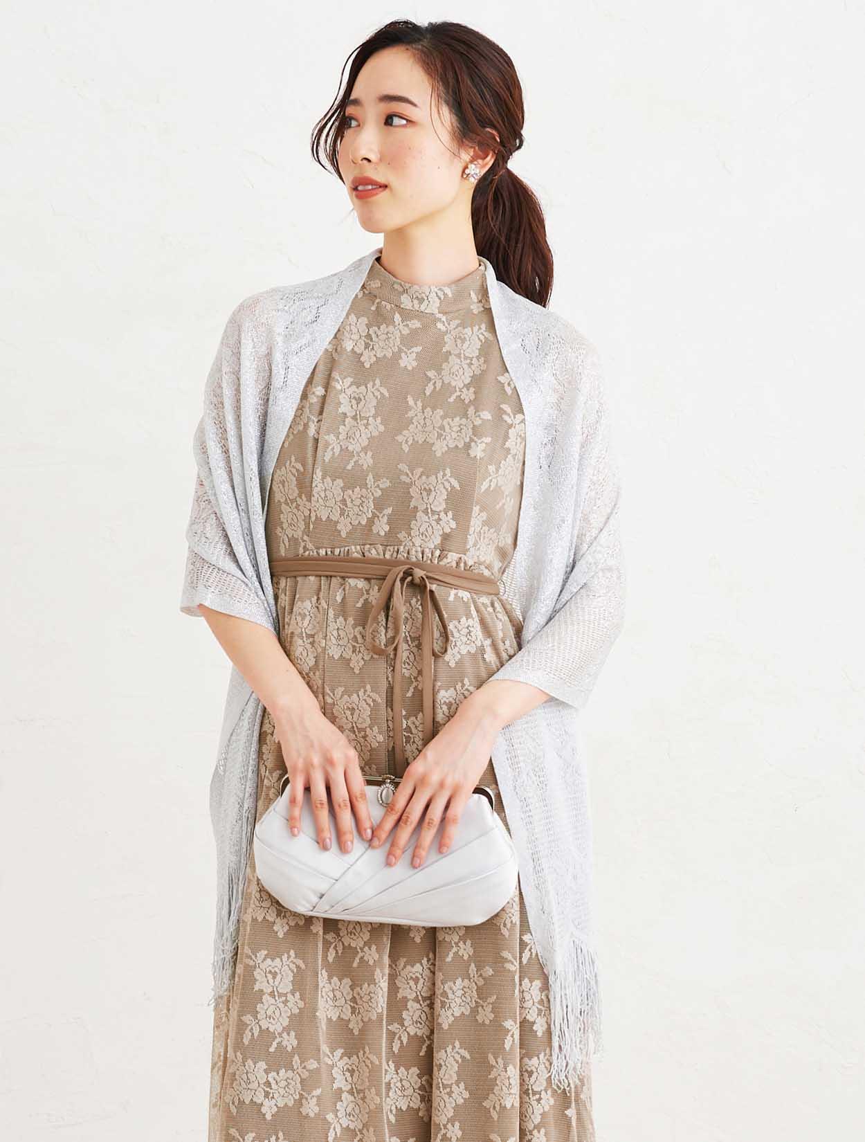■清潔感漂うレースドレスにラメストールが顔周りを華やかにするコーディネート。