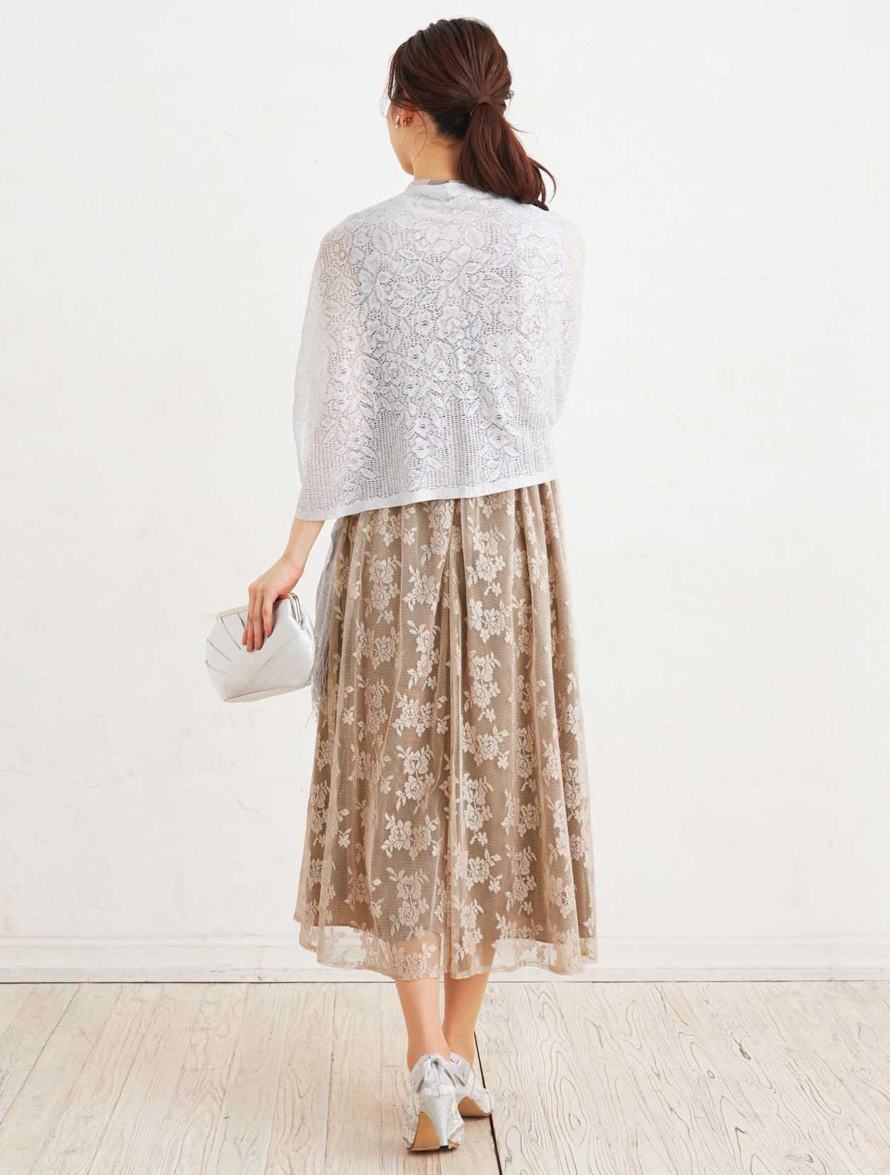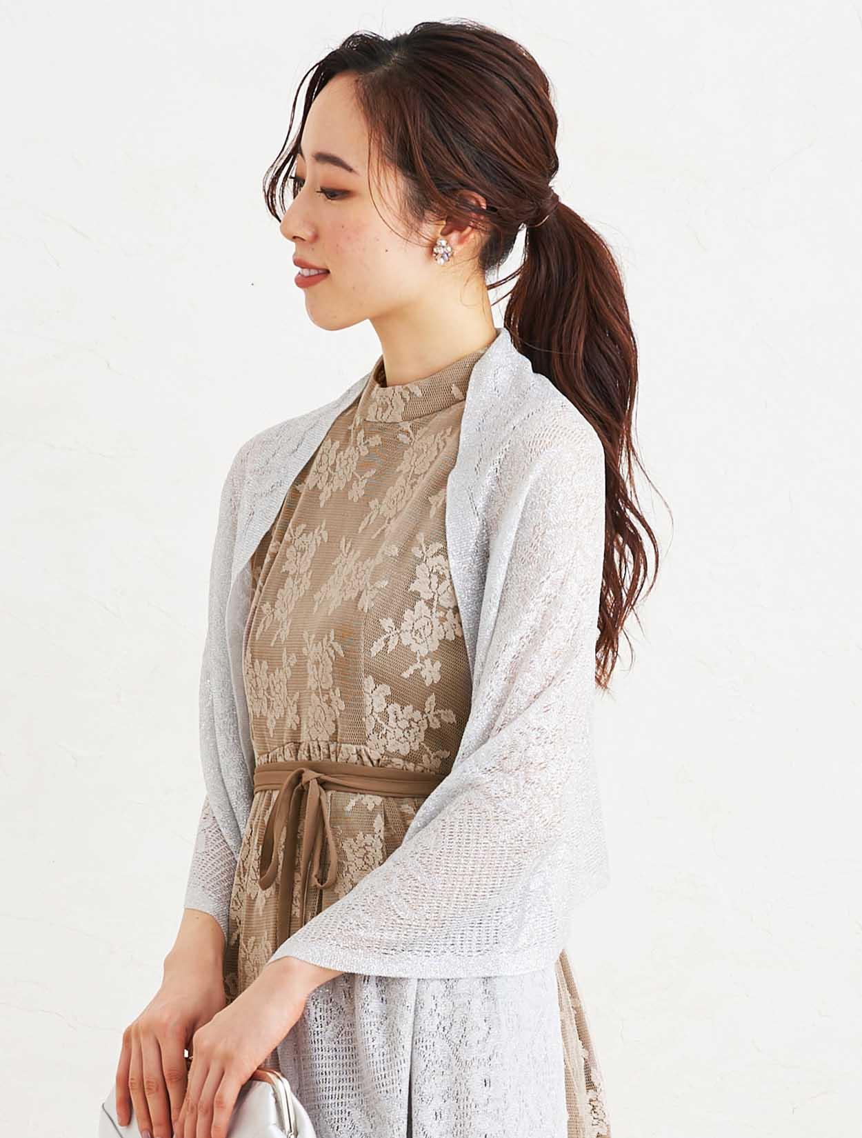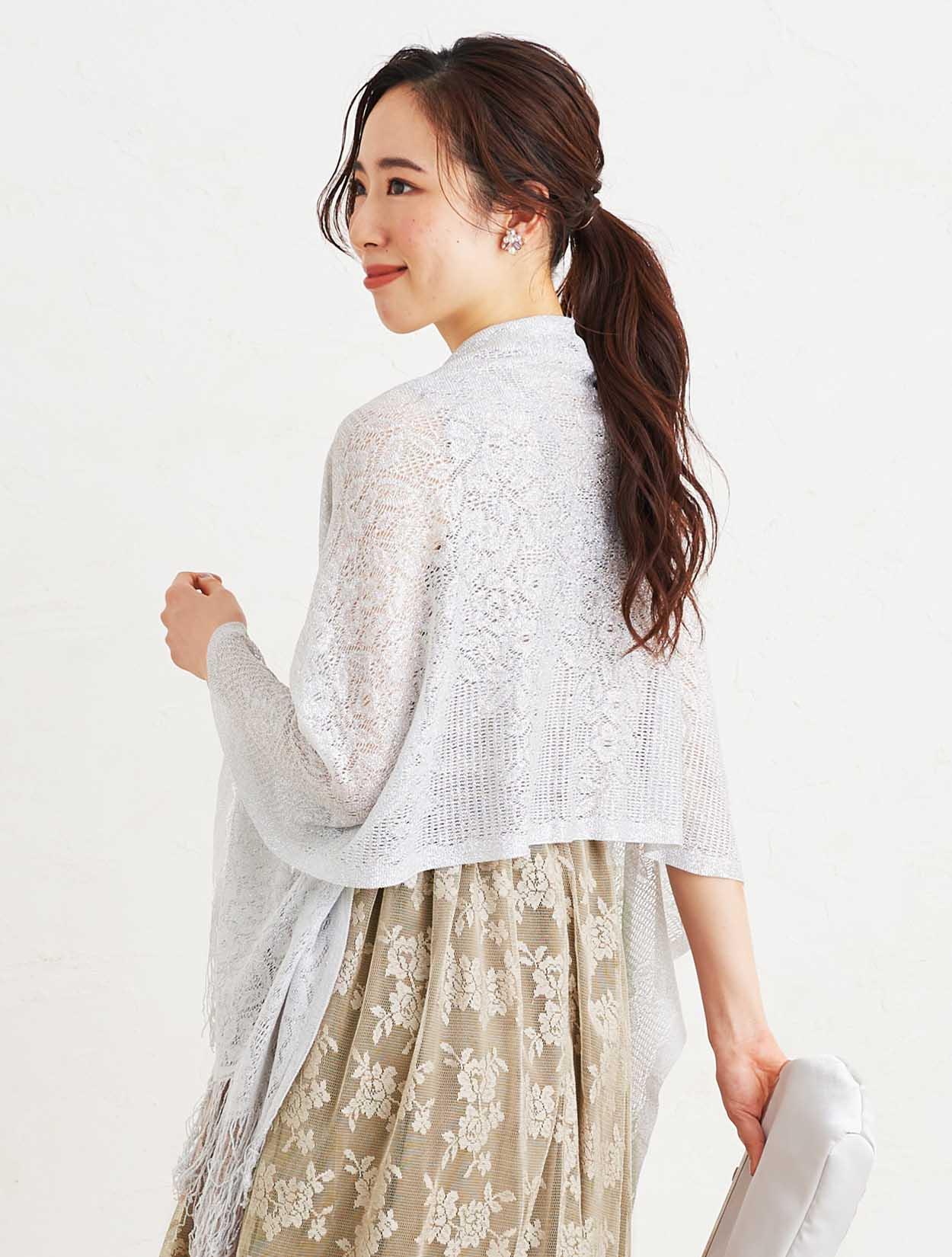 ■清潔感漂うレースドレスにラメストールが顔周りを華やかにするコーディネート。