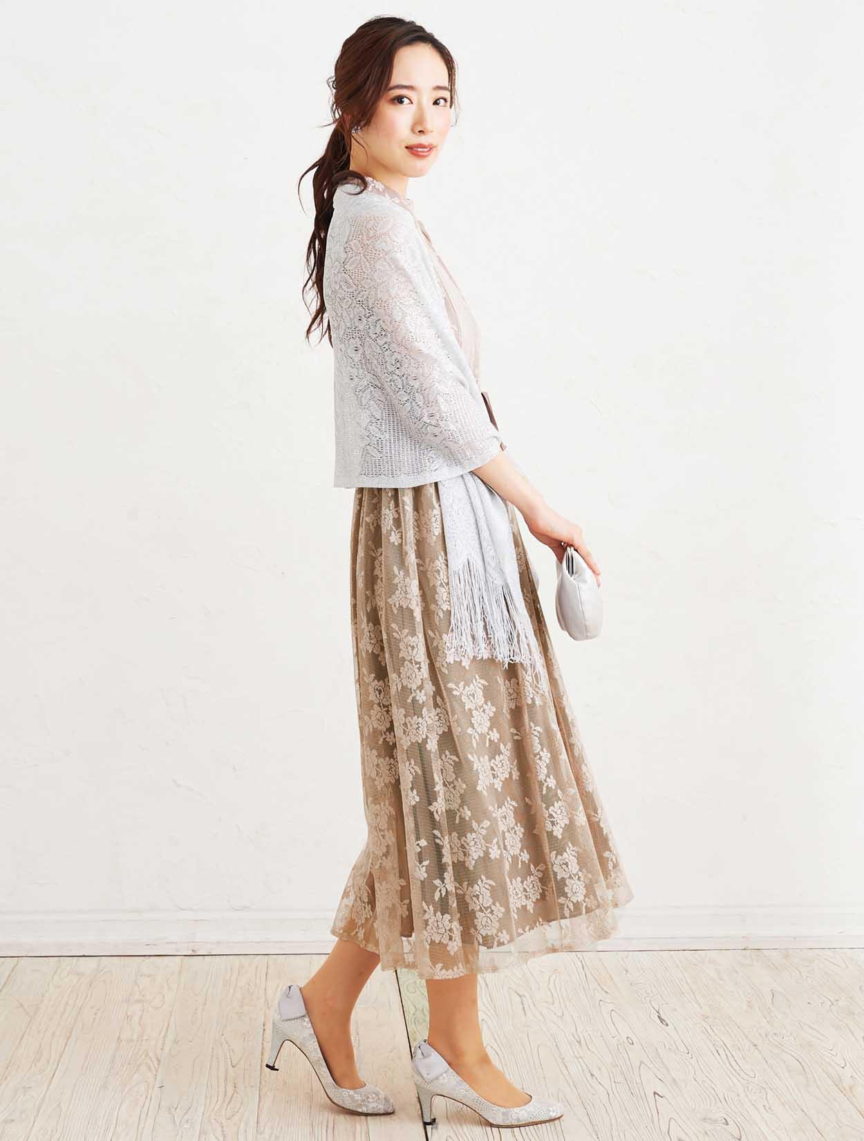 ■ベージュのドレスはアクセサリーや、合わせる小物を華やかに引き立ててくれるアイテムです。