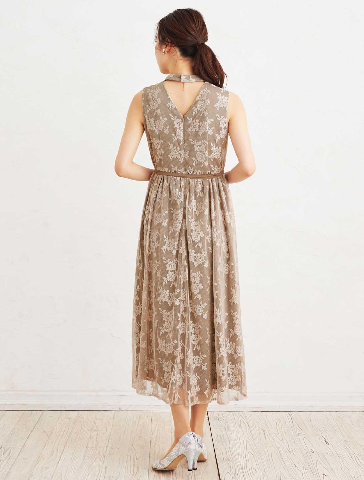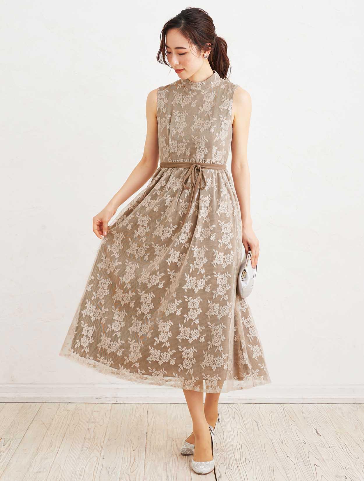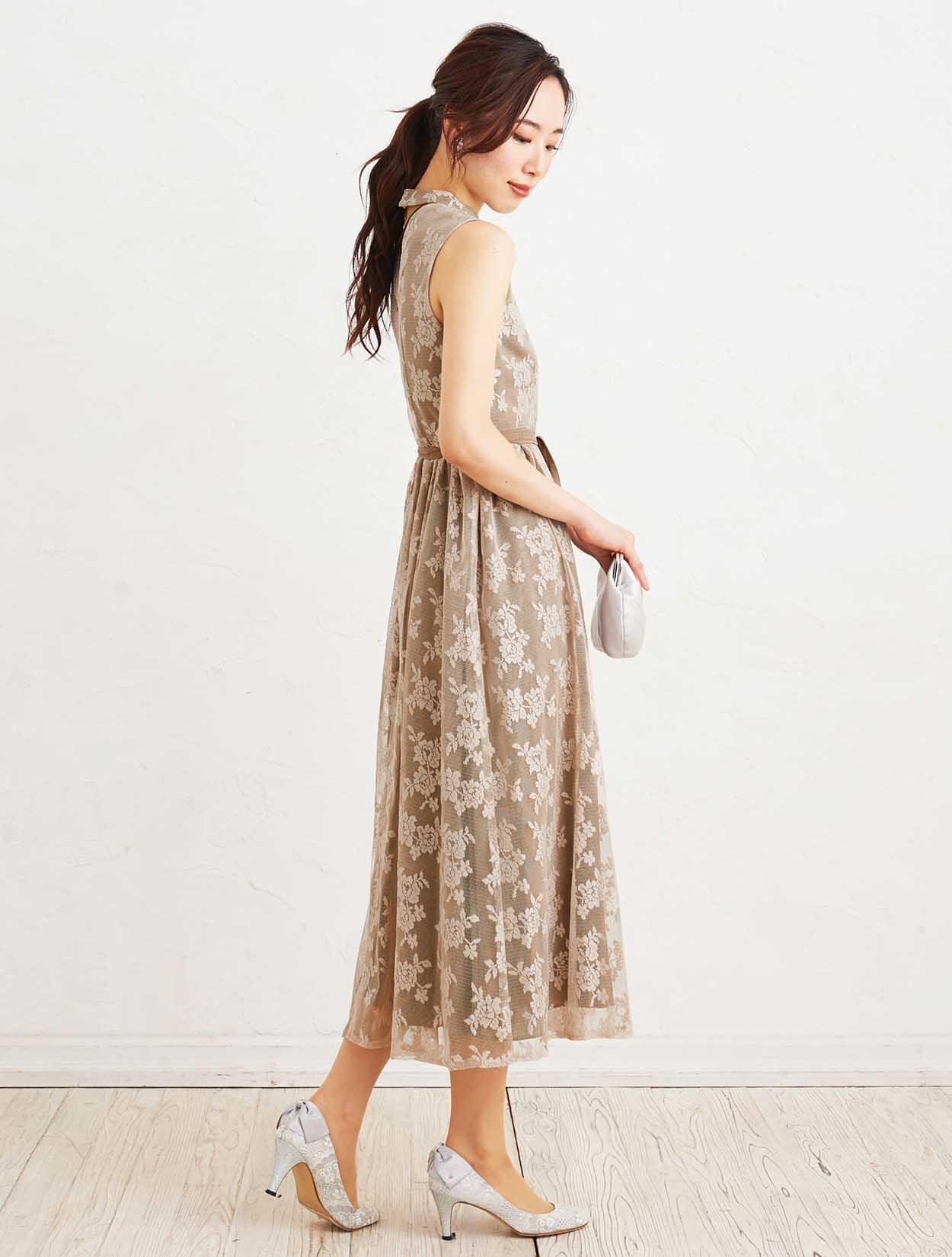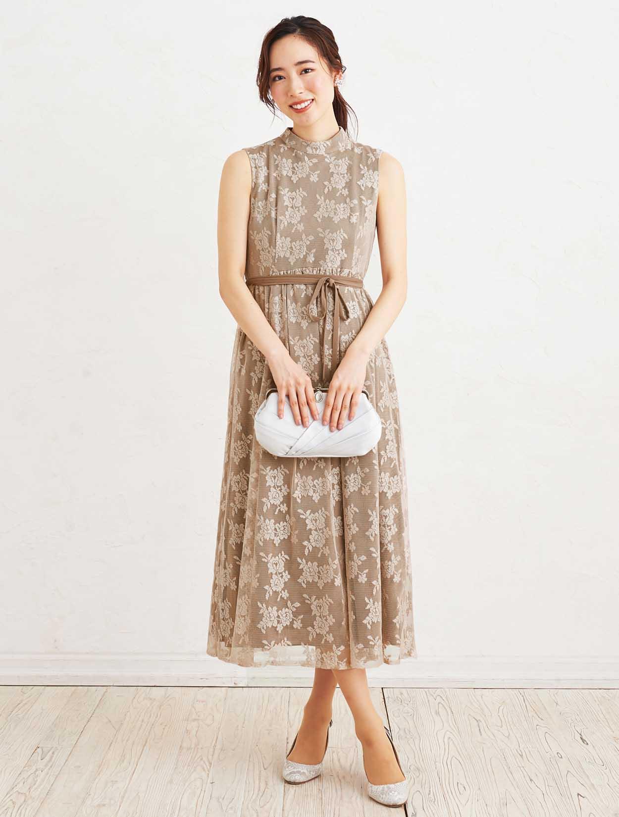 ■無地ライクなメッシュレースにフラワー柄が美しいロングドレス。