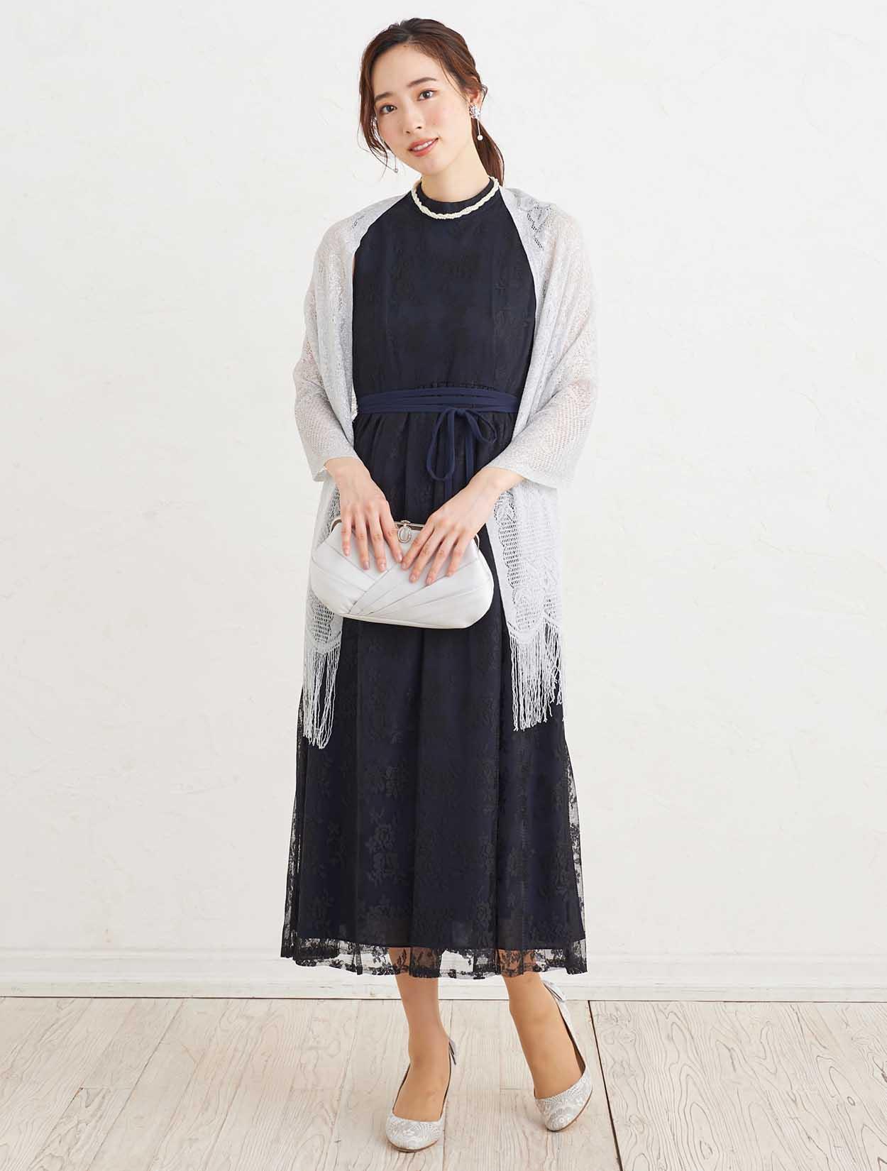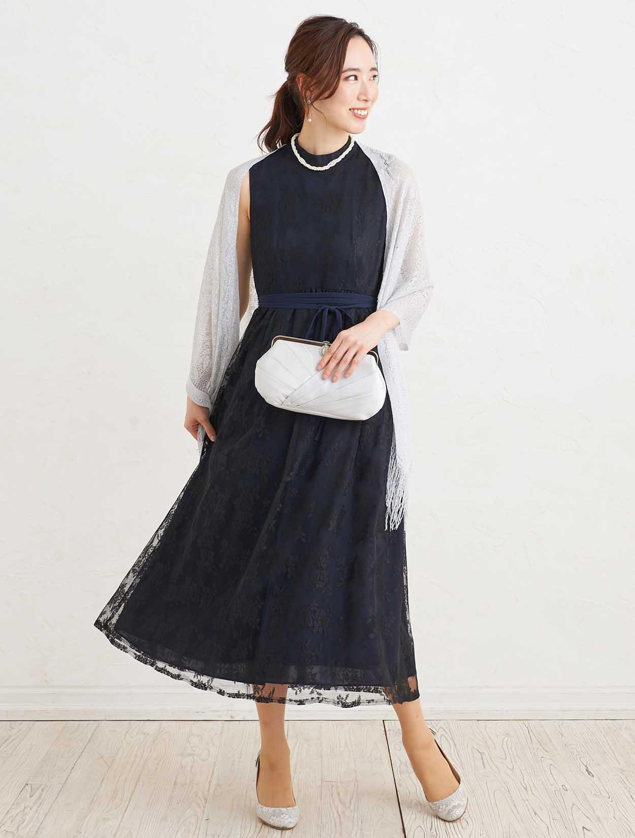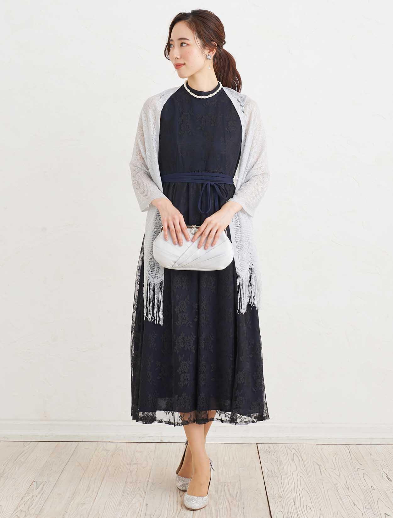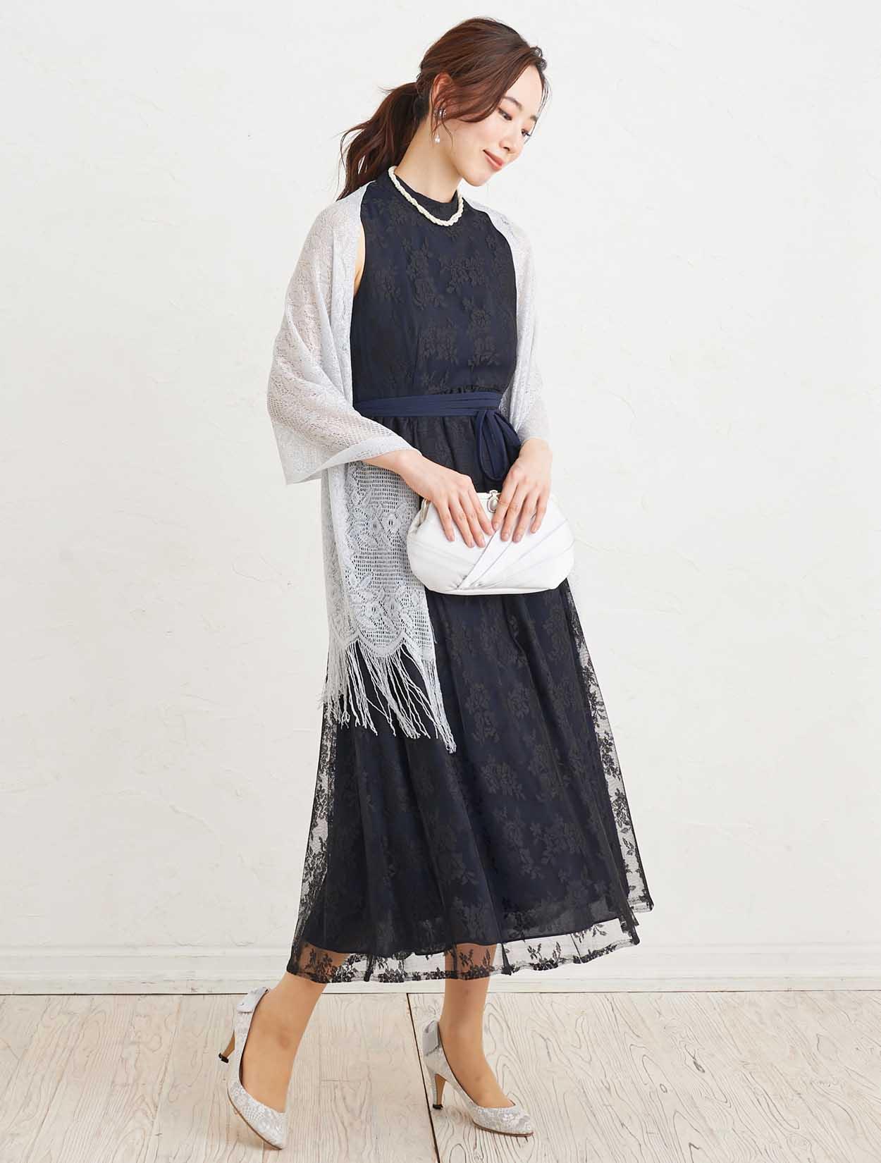 ■上品な総レースのハイネックドレスにストールで抜け感を出したコーディネート。