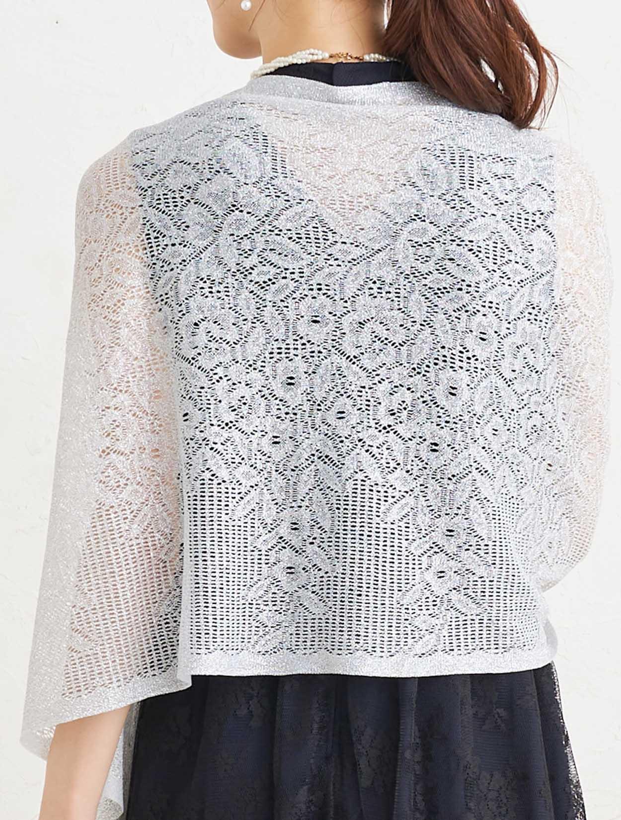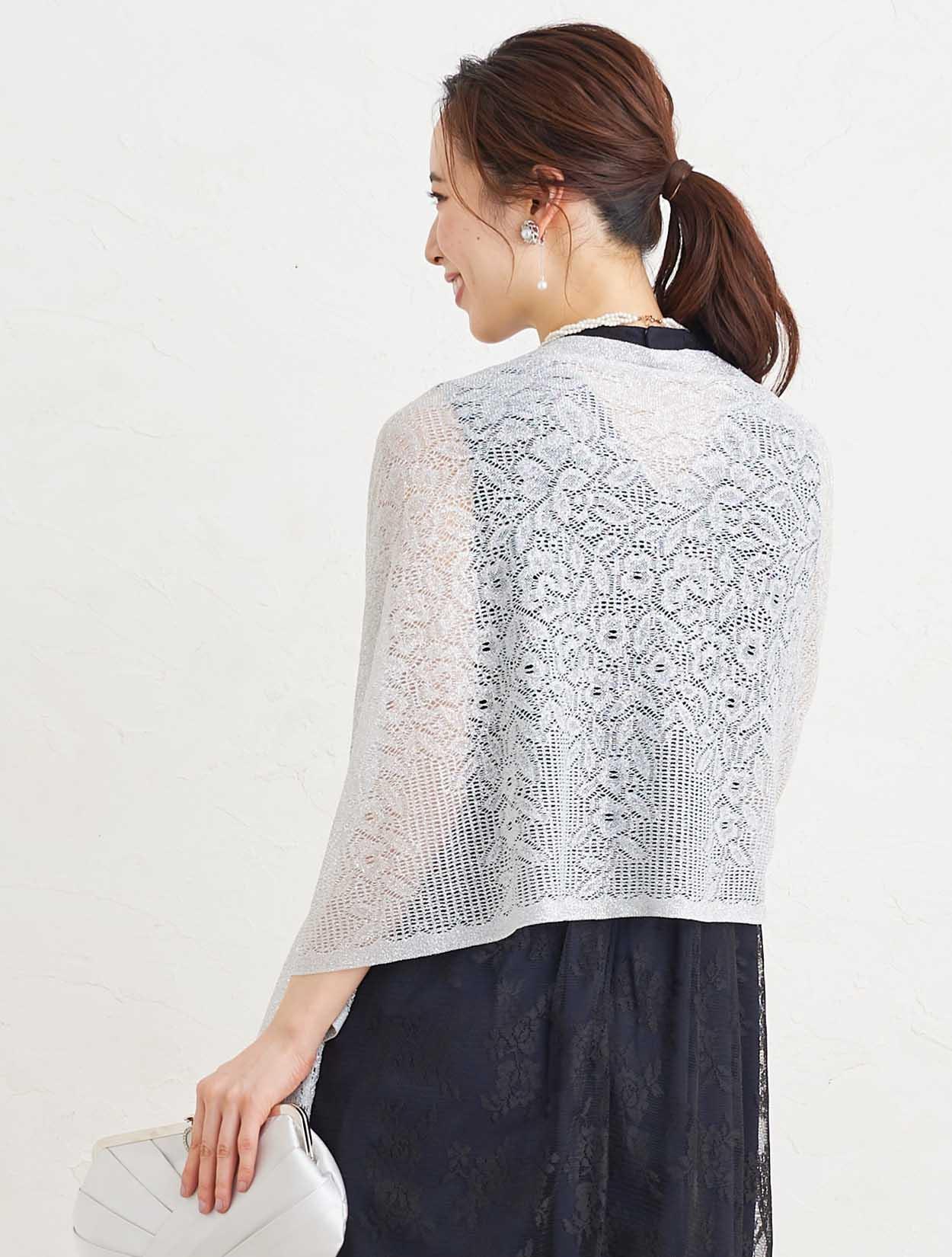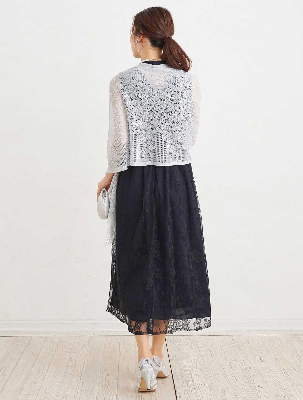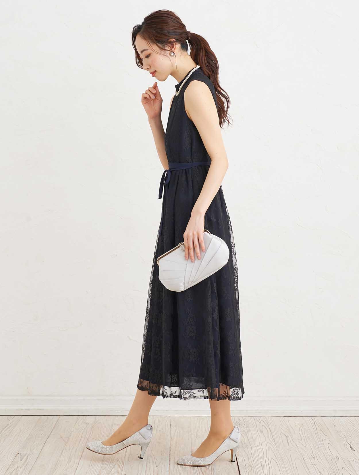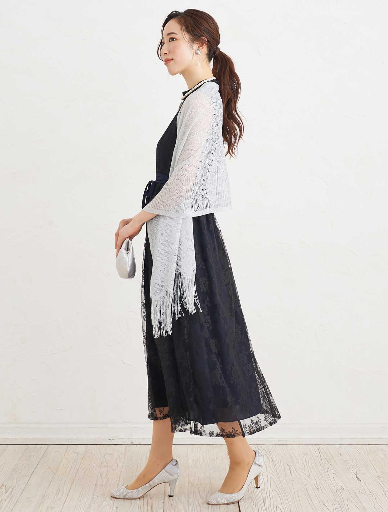 ■上品な総レースのハイネックドレスにストールで抜け感を出したコーディネート。