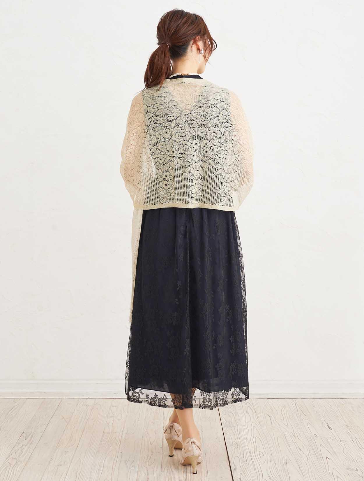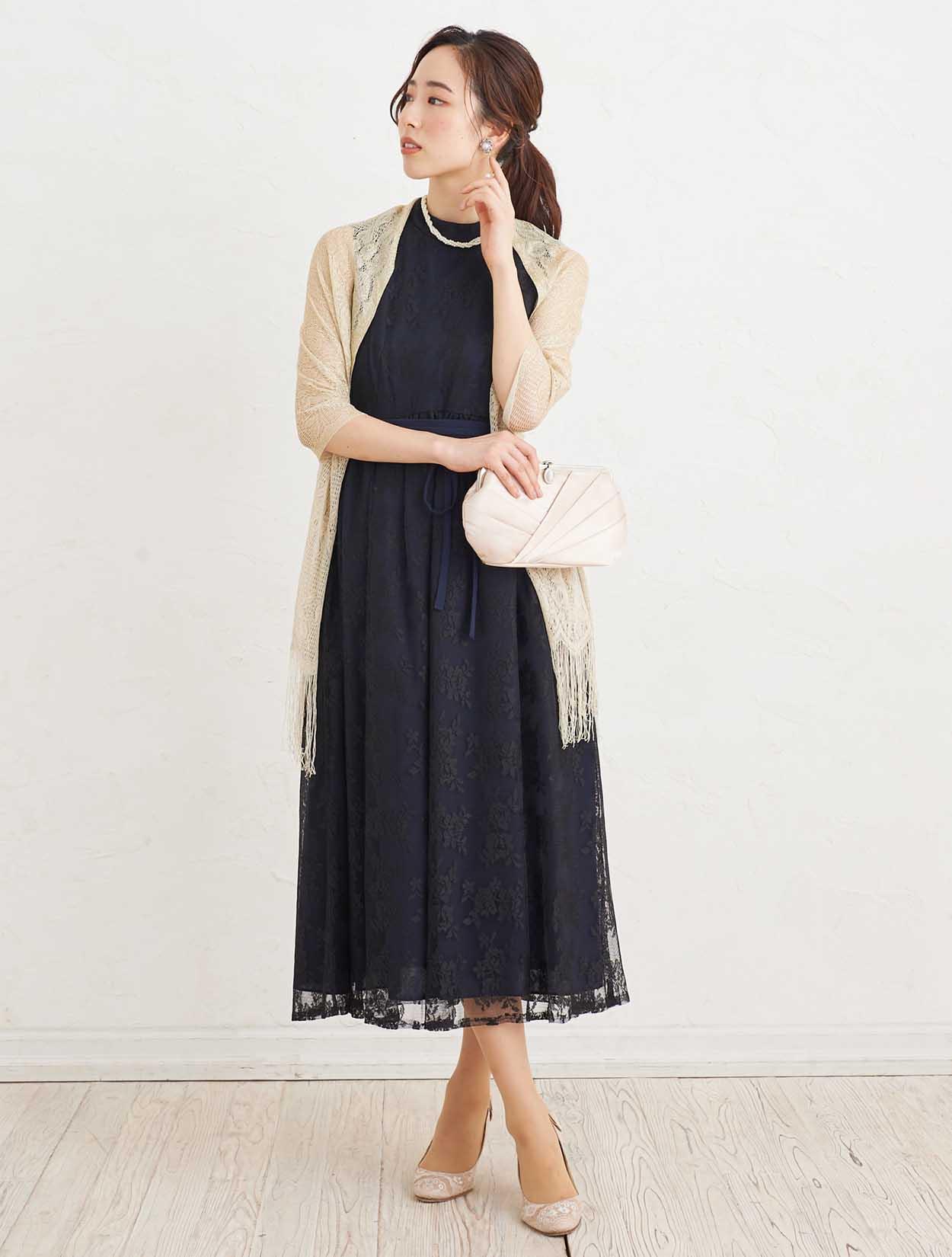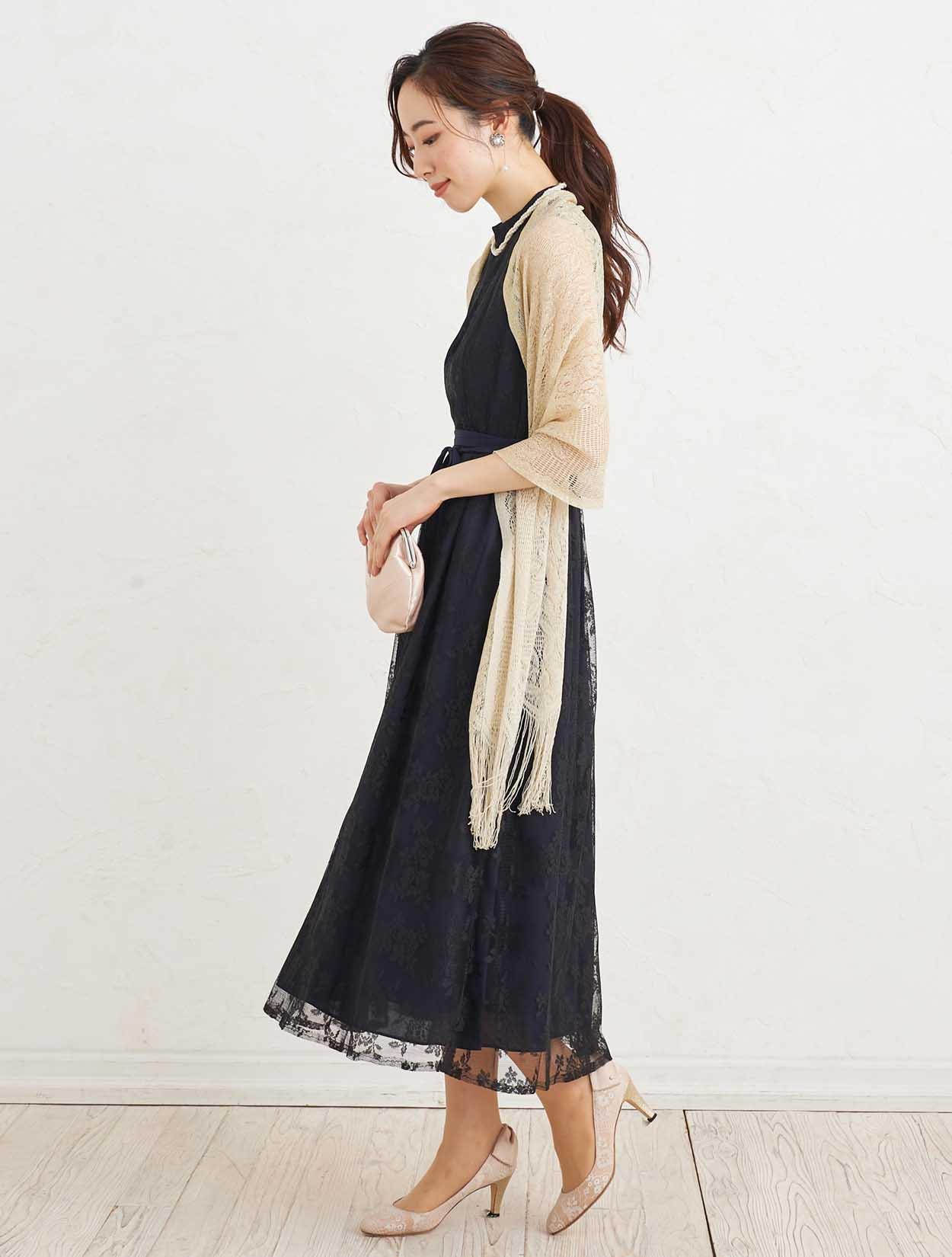 ■上品な総レースのハイネックドレスにラメストールで気になる二の腕をカバーしてくれるコーディネート。