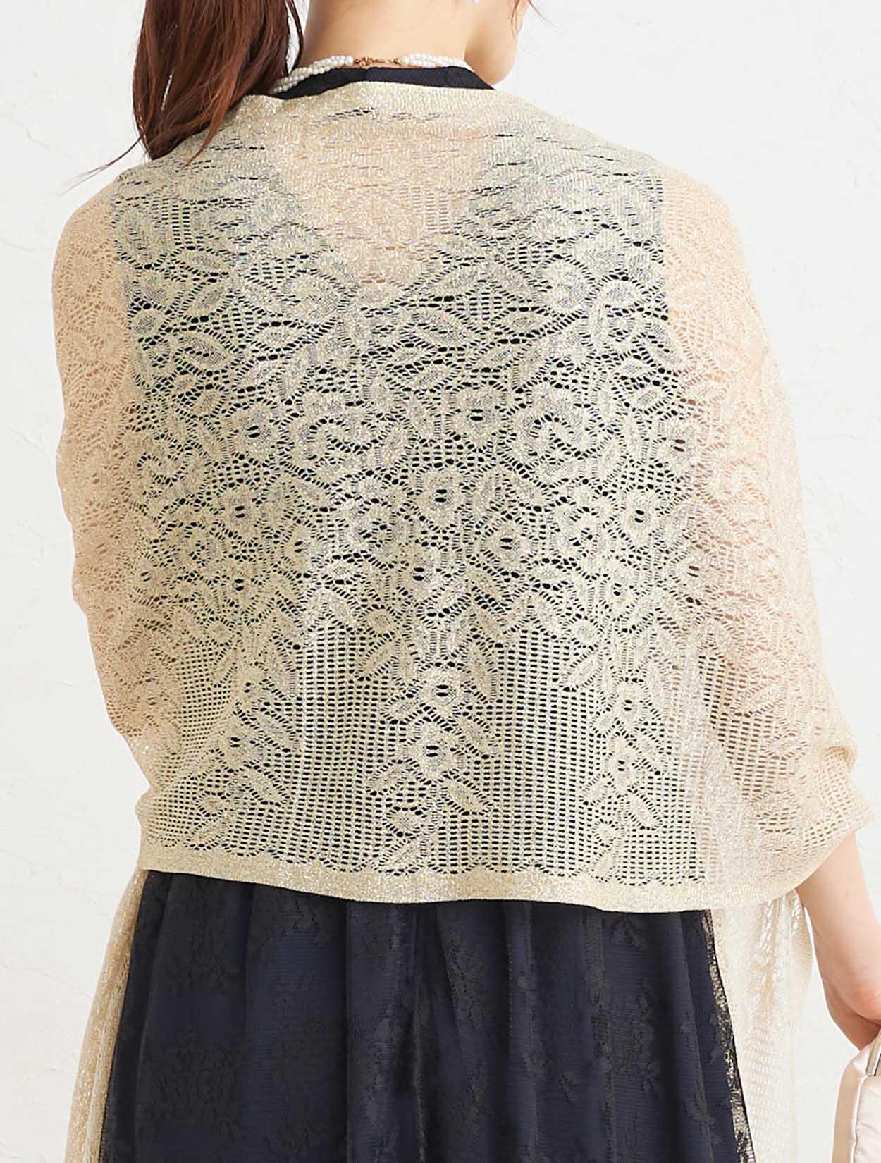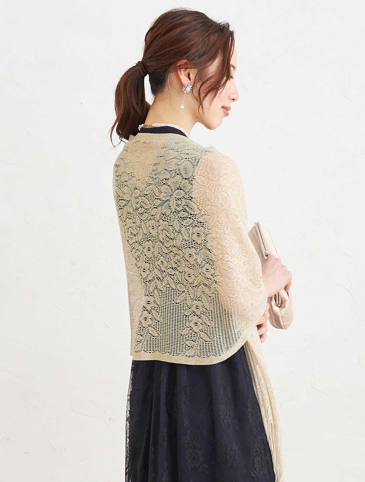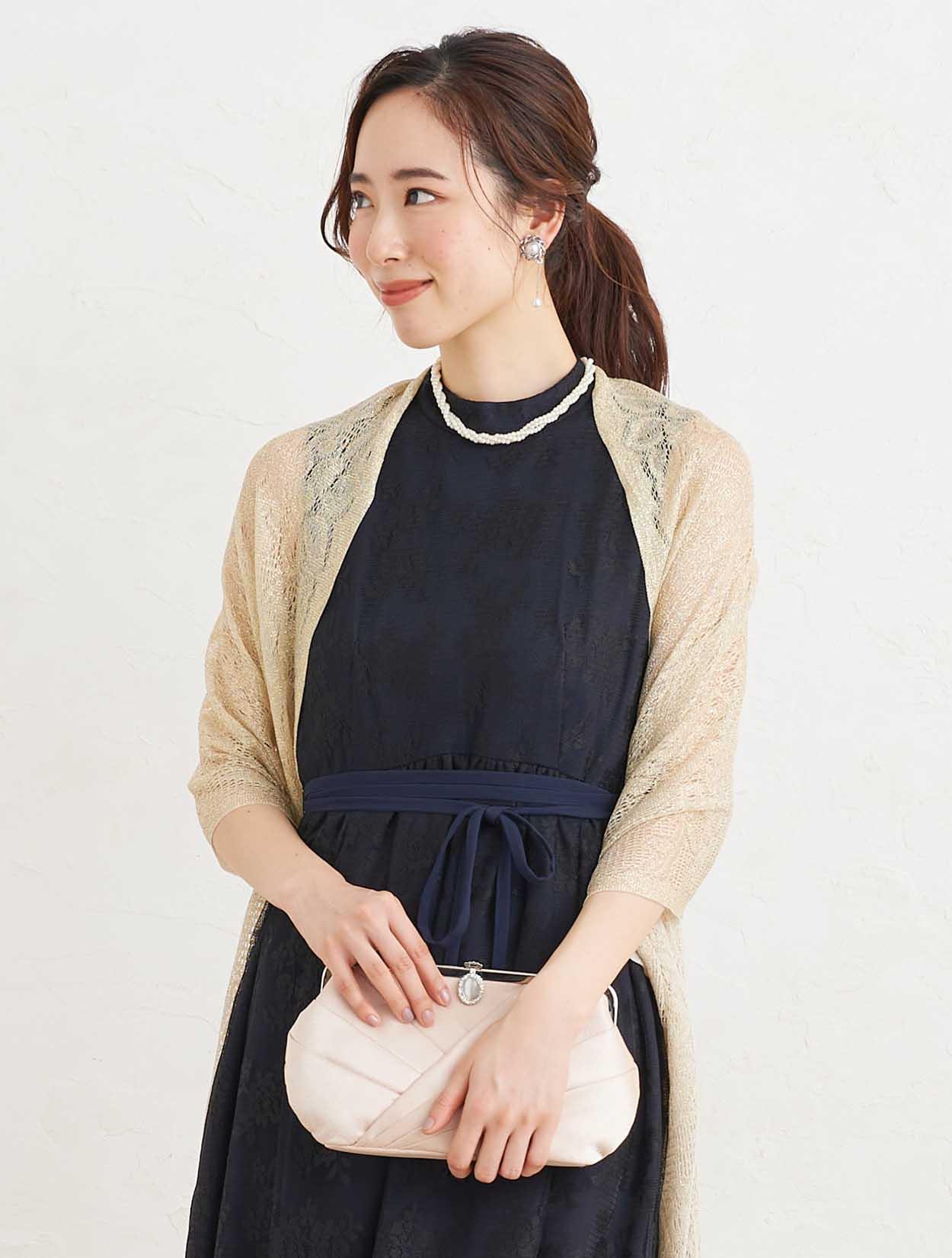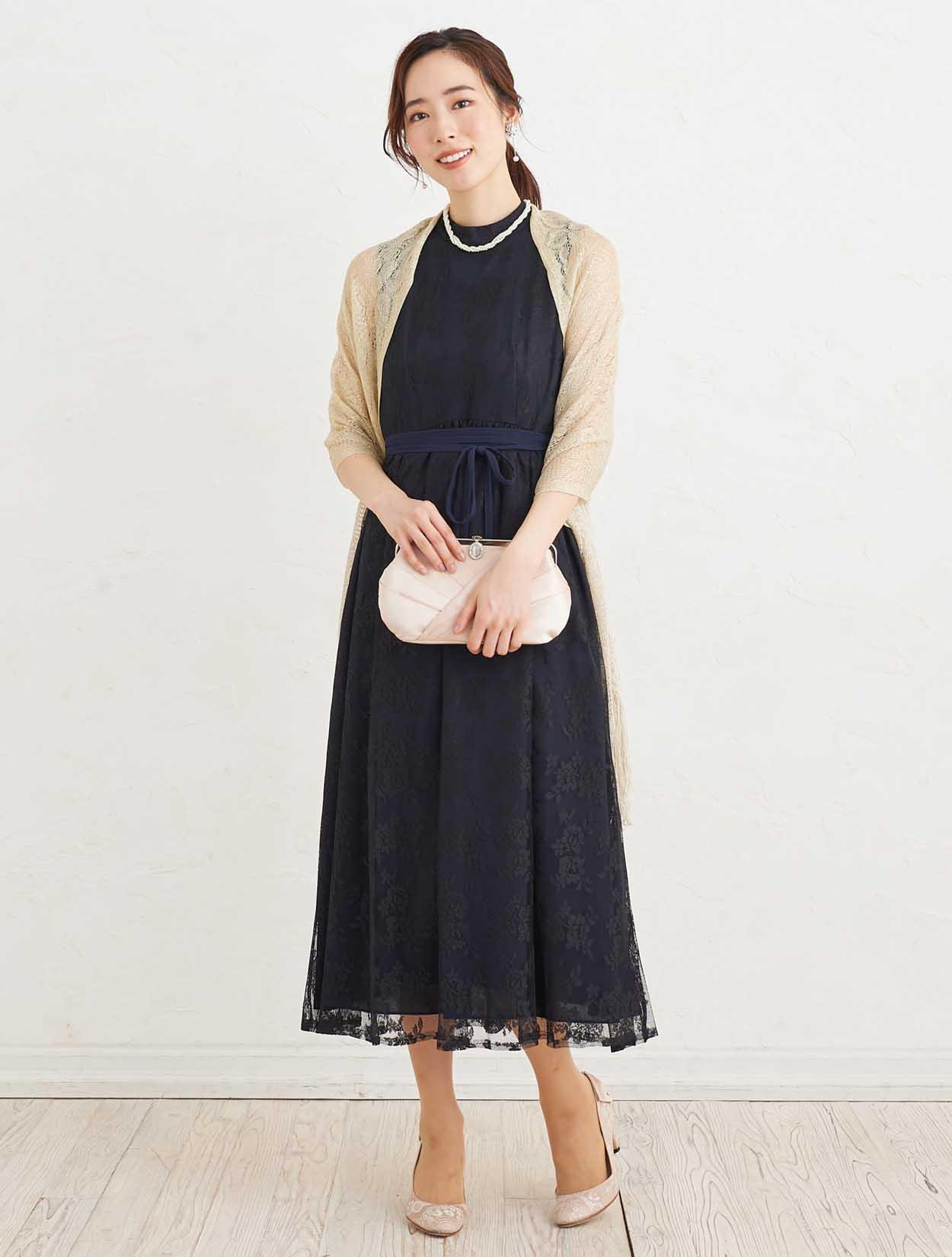 ■上品な総レースのハイネックドレスにラメストールで気になる二の腕をカバーしてくれるコーディネート。