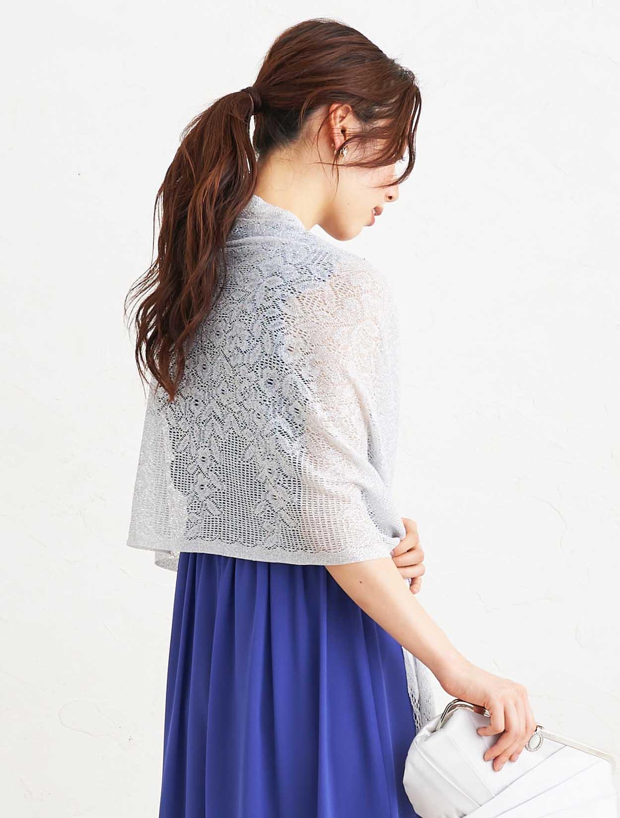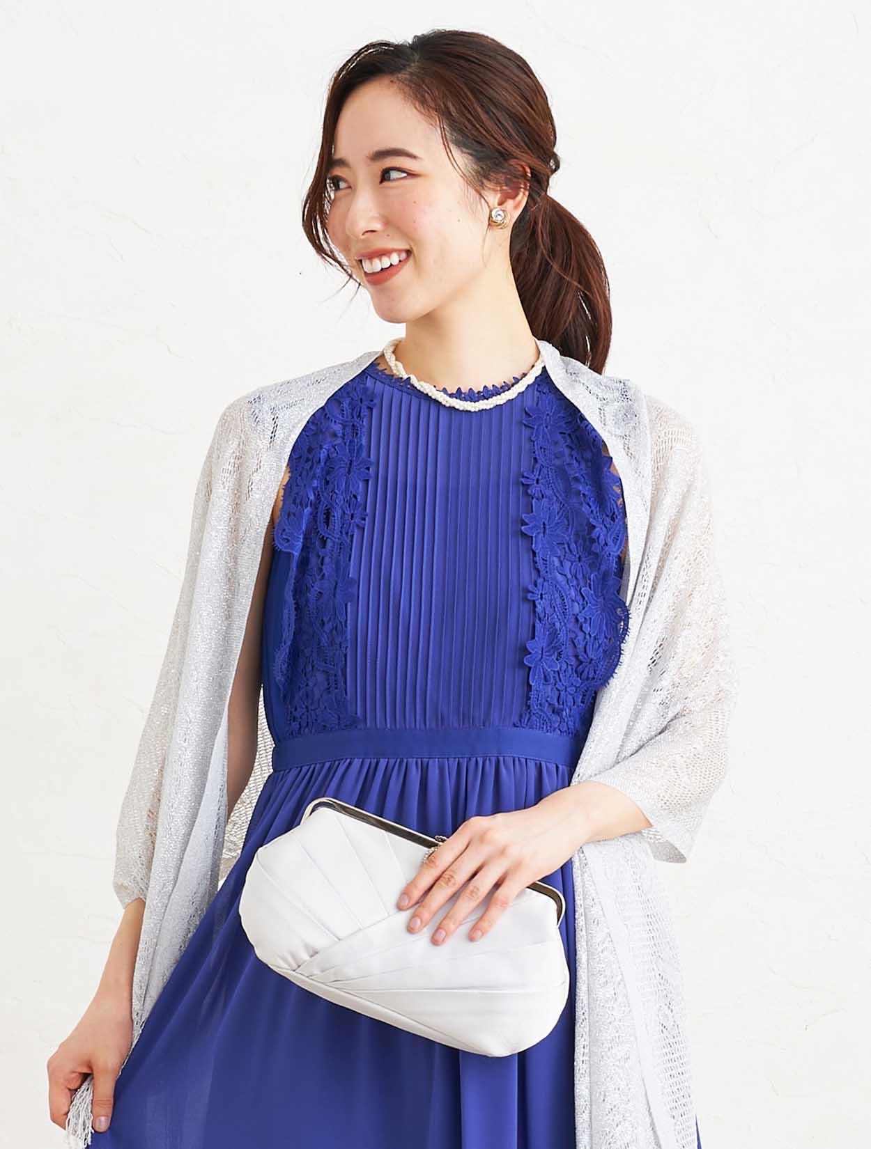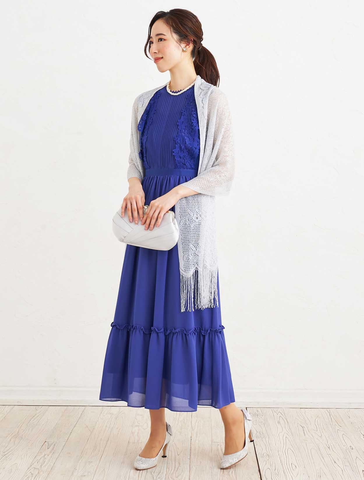 ■知的で美しいこっくりとした色のブルーのドレスにラメストールを合わせパーティーにピッタリのコーディネート。
