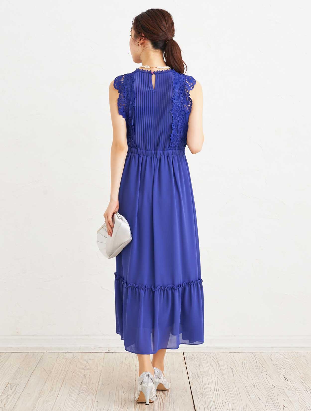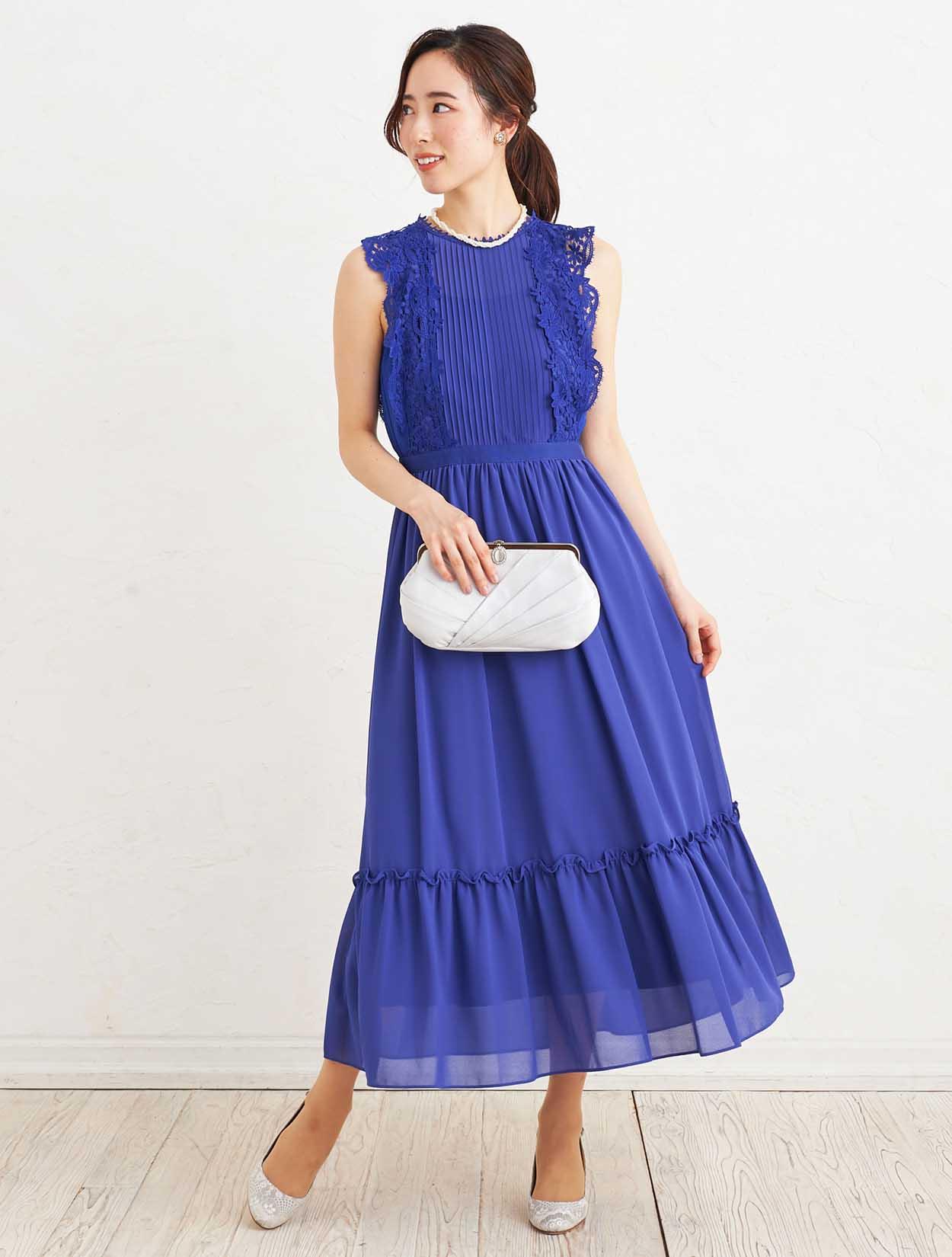 ■ネックからウエストに重なるタックデザインとレーススリーブが、今年らしく着こなせるドレスです。