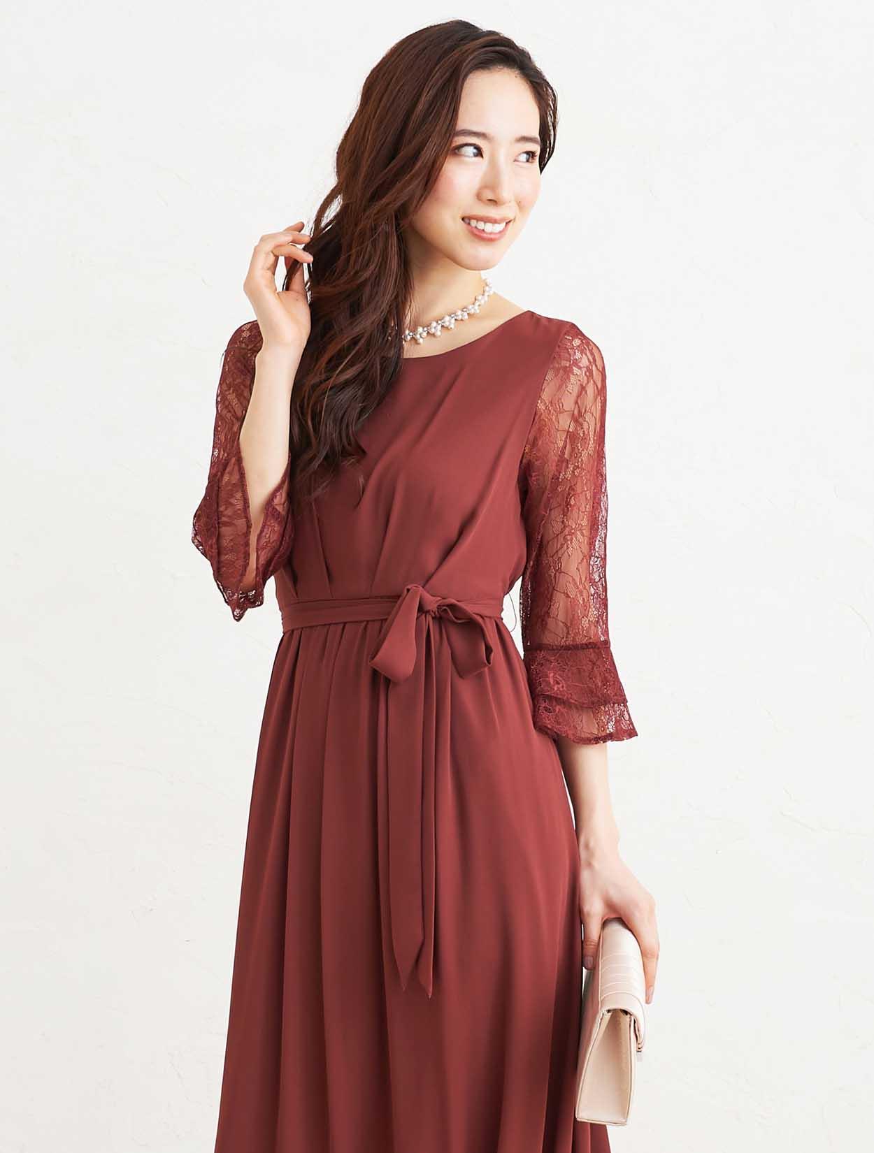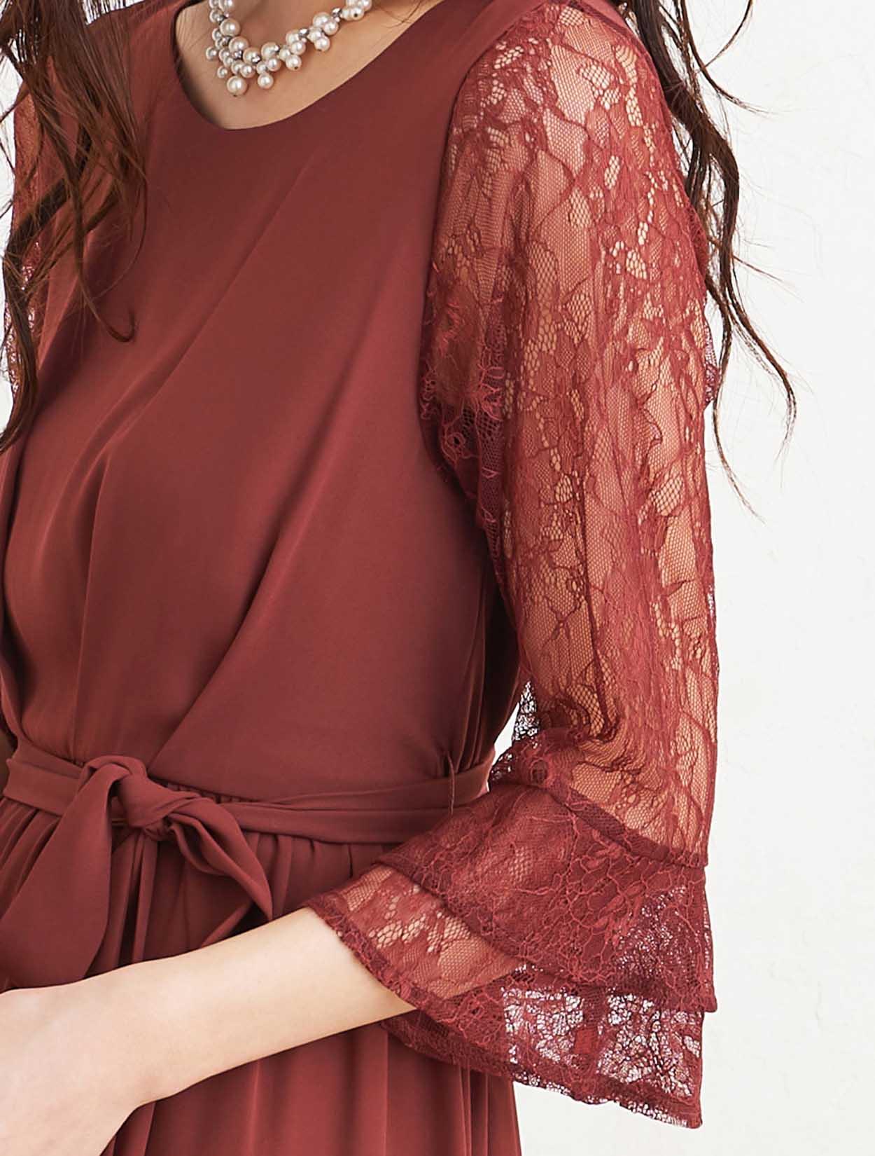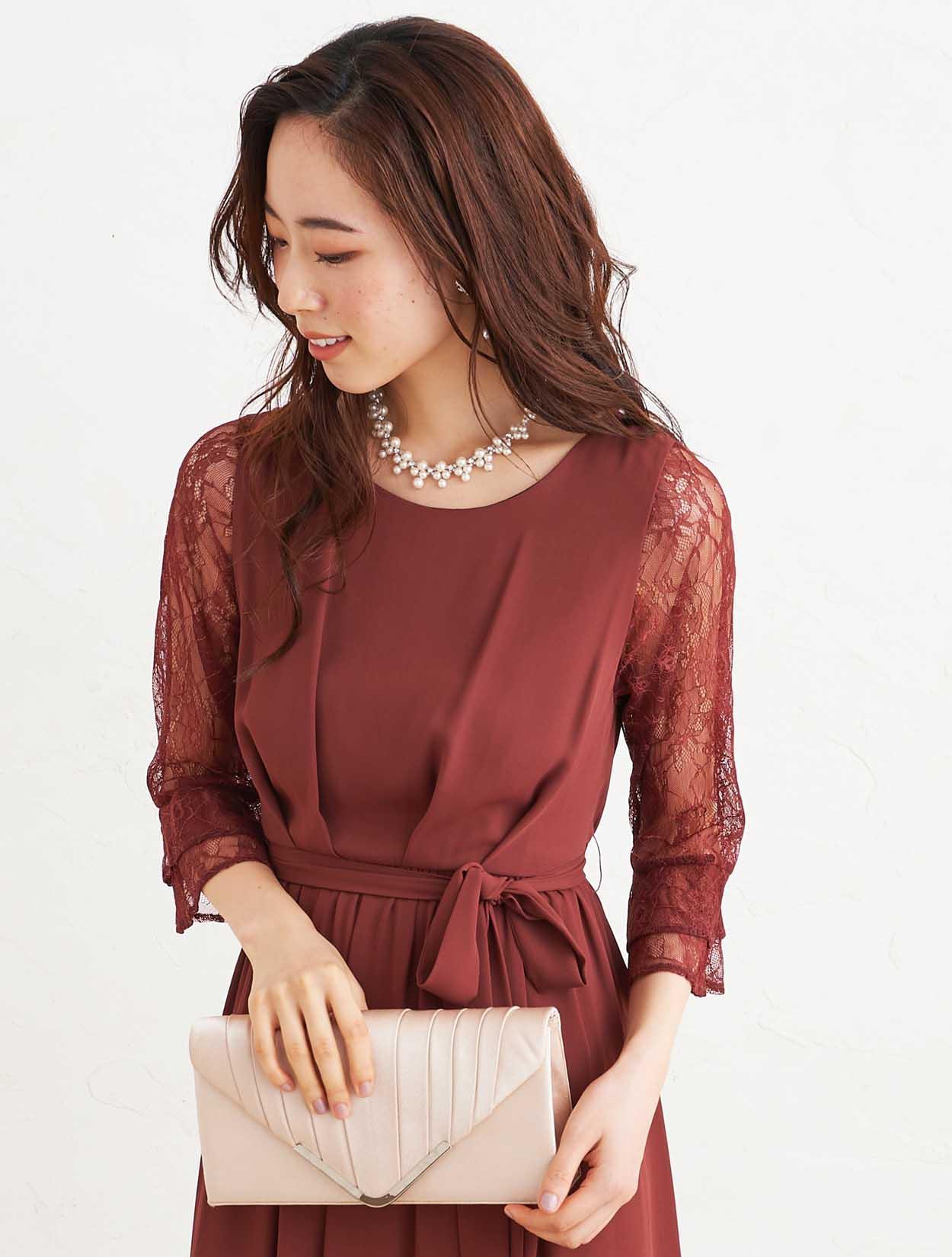 ■落ち着いた赤いカラーで上品な印象のドレスです。透け感のあるレースの袖が二の腕をカバー。