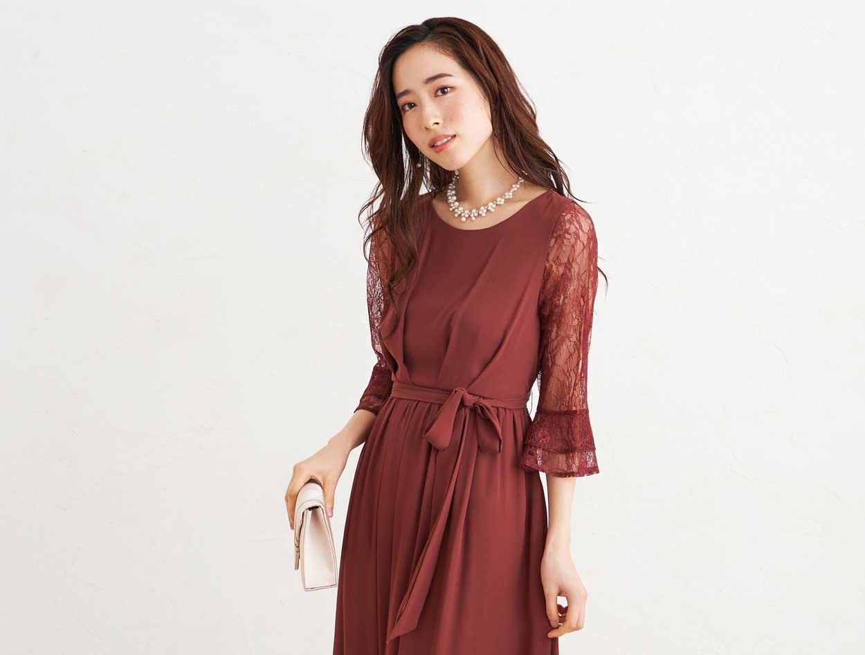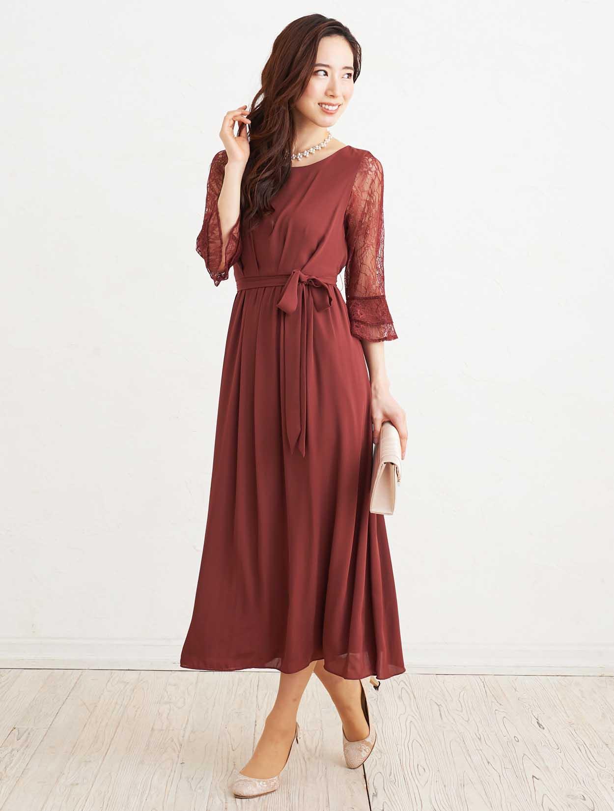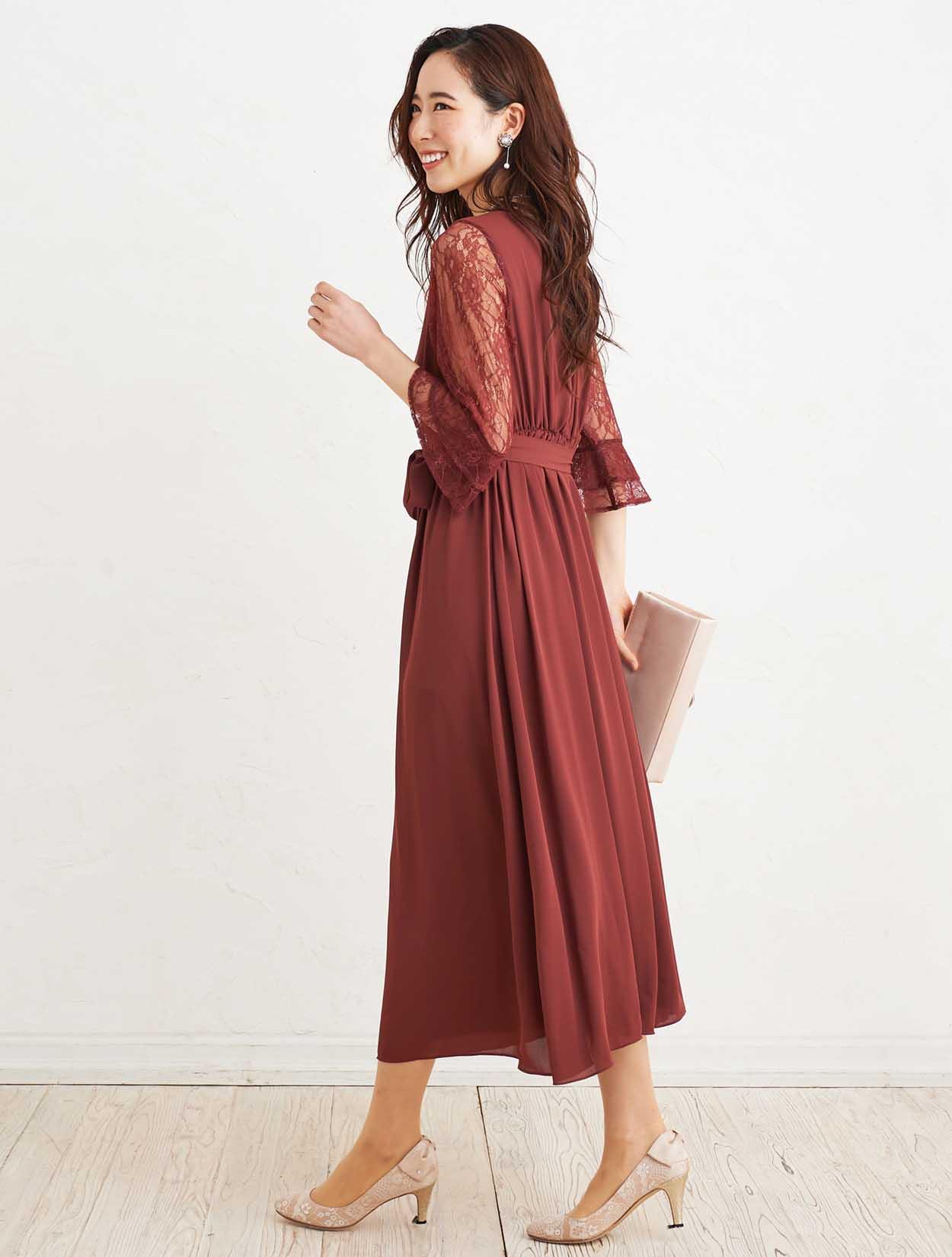 ■落ち着いた赤いカラーで上品な印象のドレスです。透け感のあるレースの袖が二の腕をカバー。