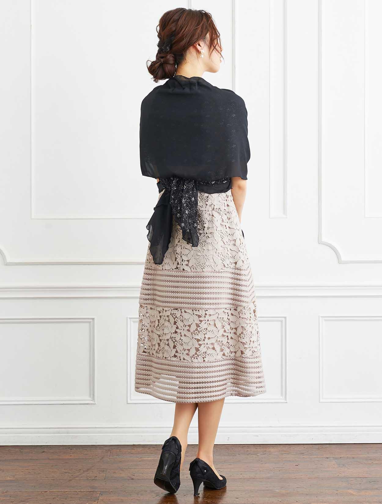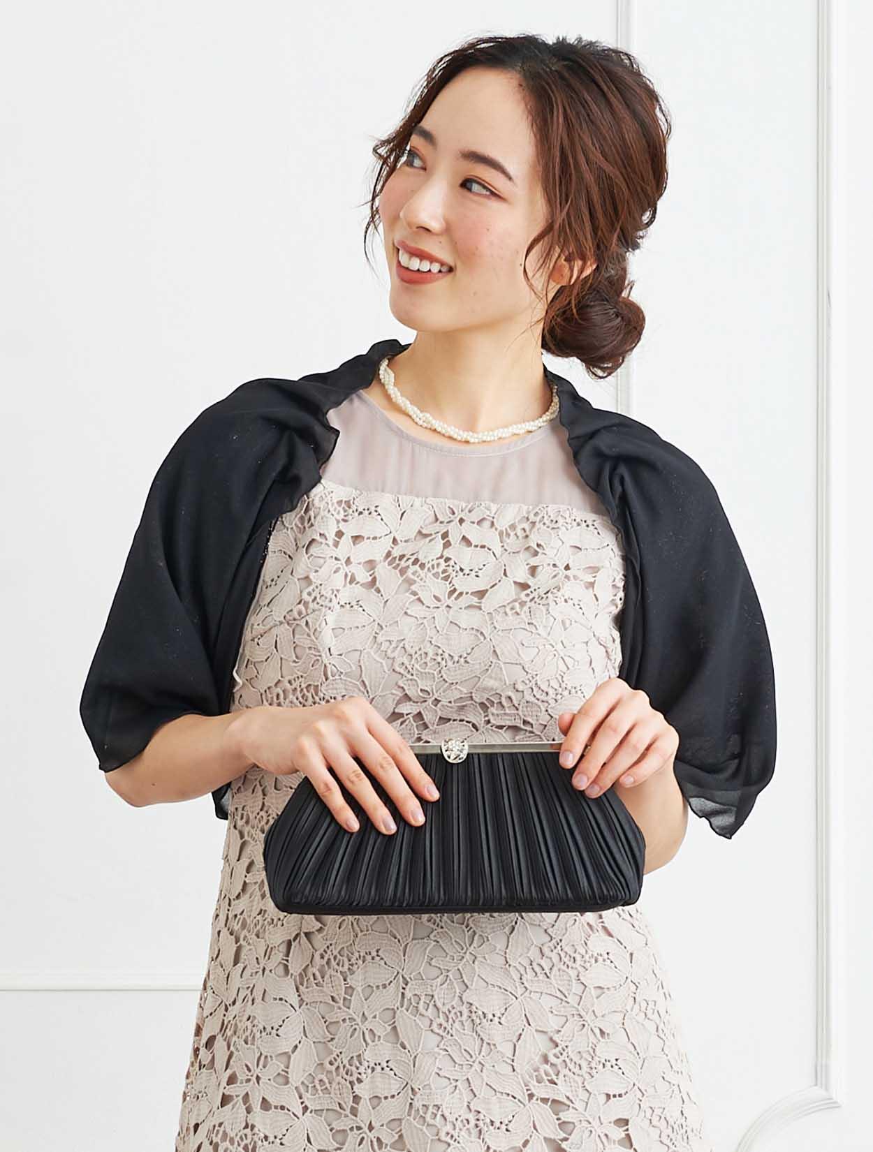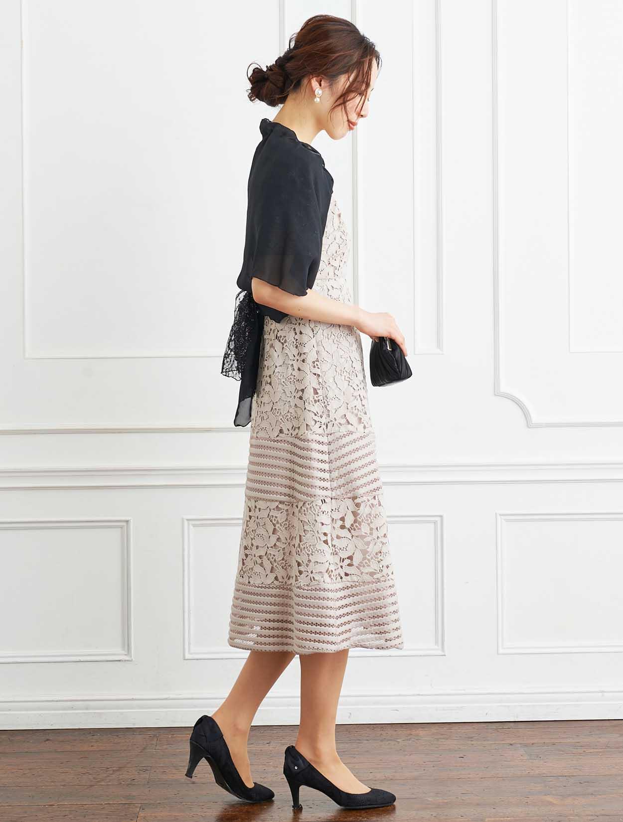 ■淡い優し気な印象のドレスにブラックの小物でメリハリをつけたコーディネート。