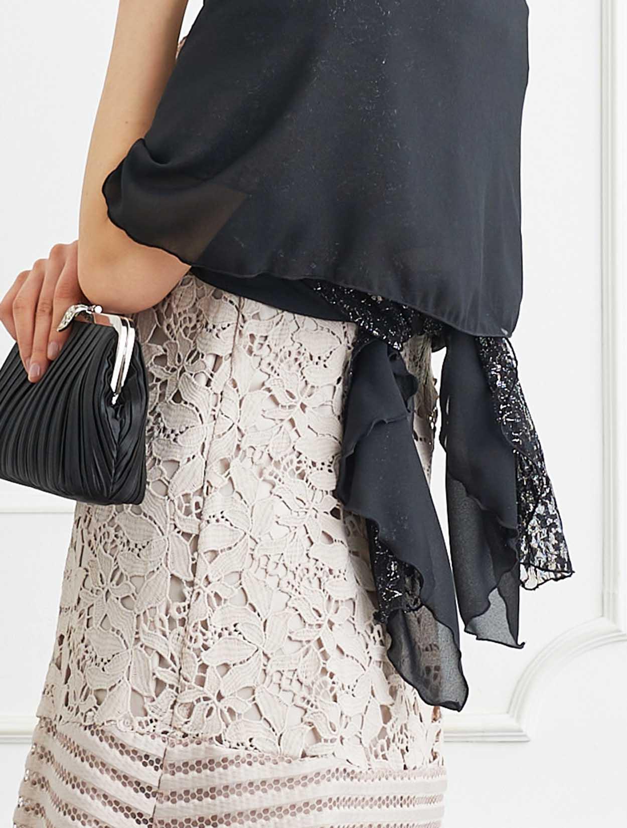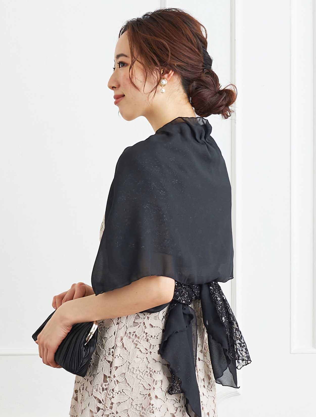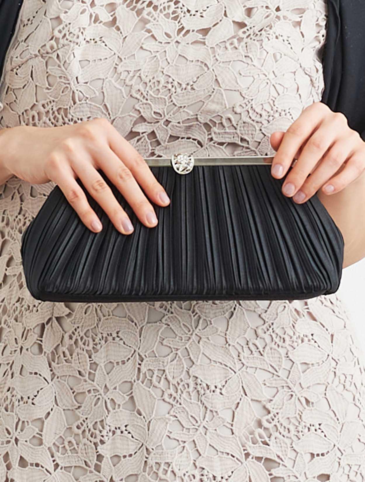 ■淡い優し気な印象のドレスにブラックの小物でメリハリをつけたコーディネート。