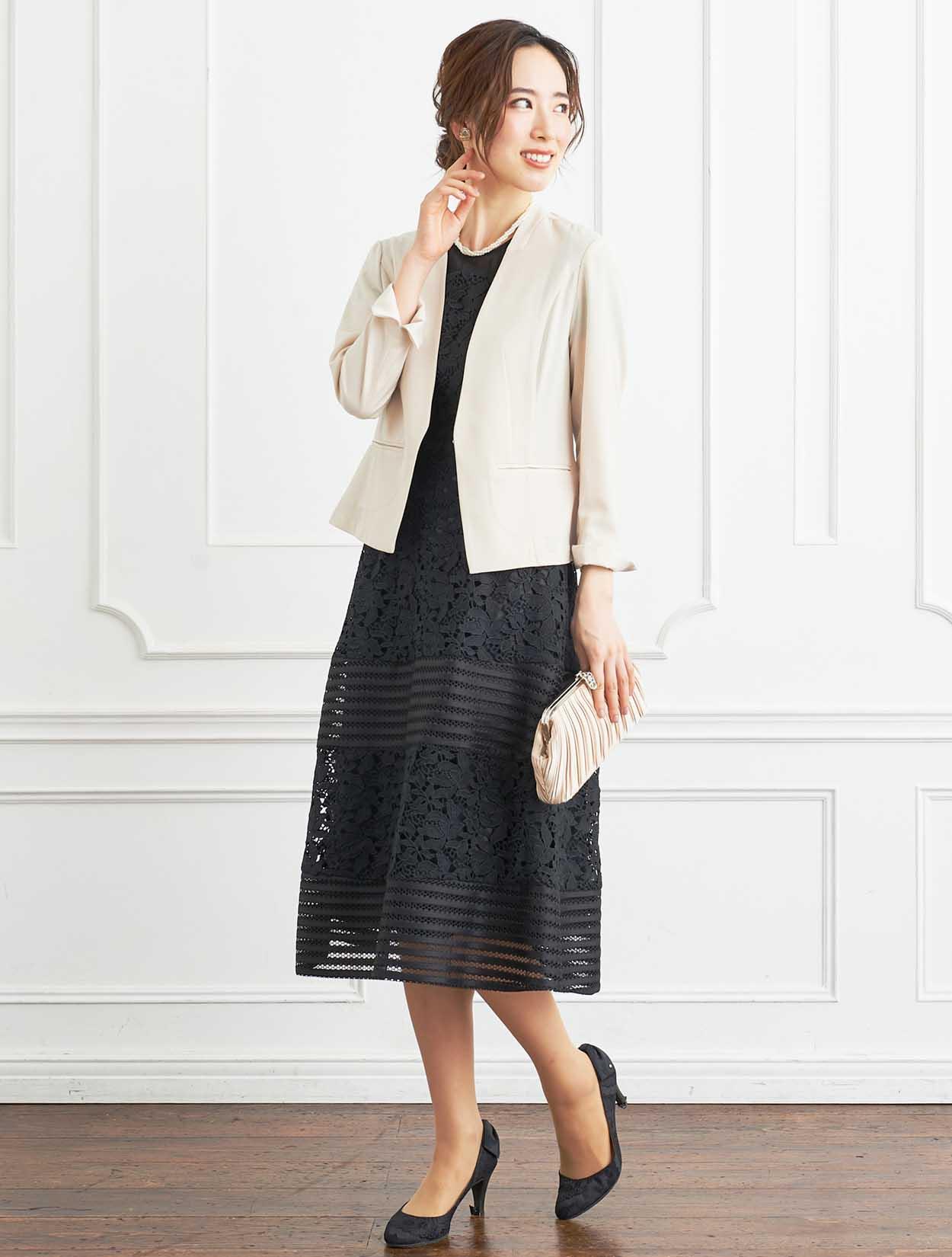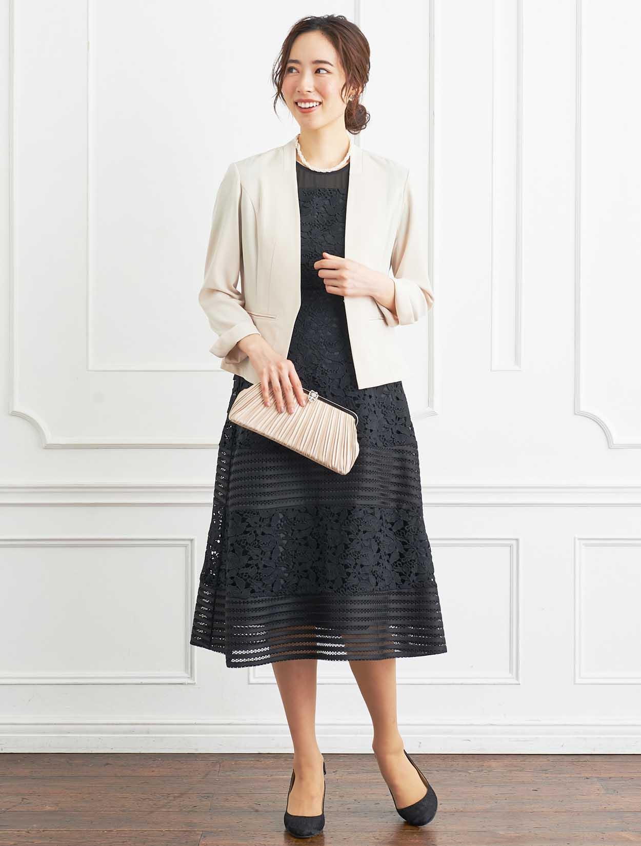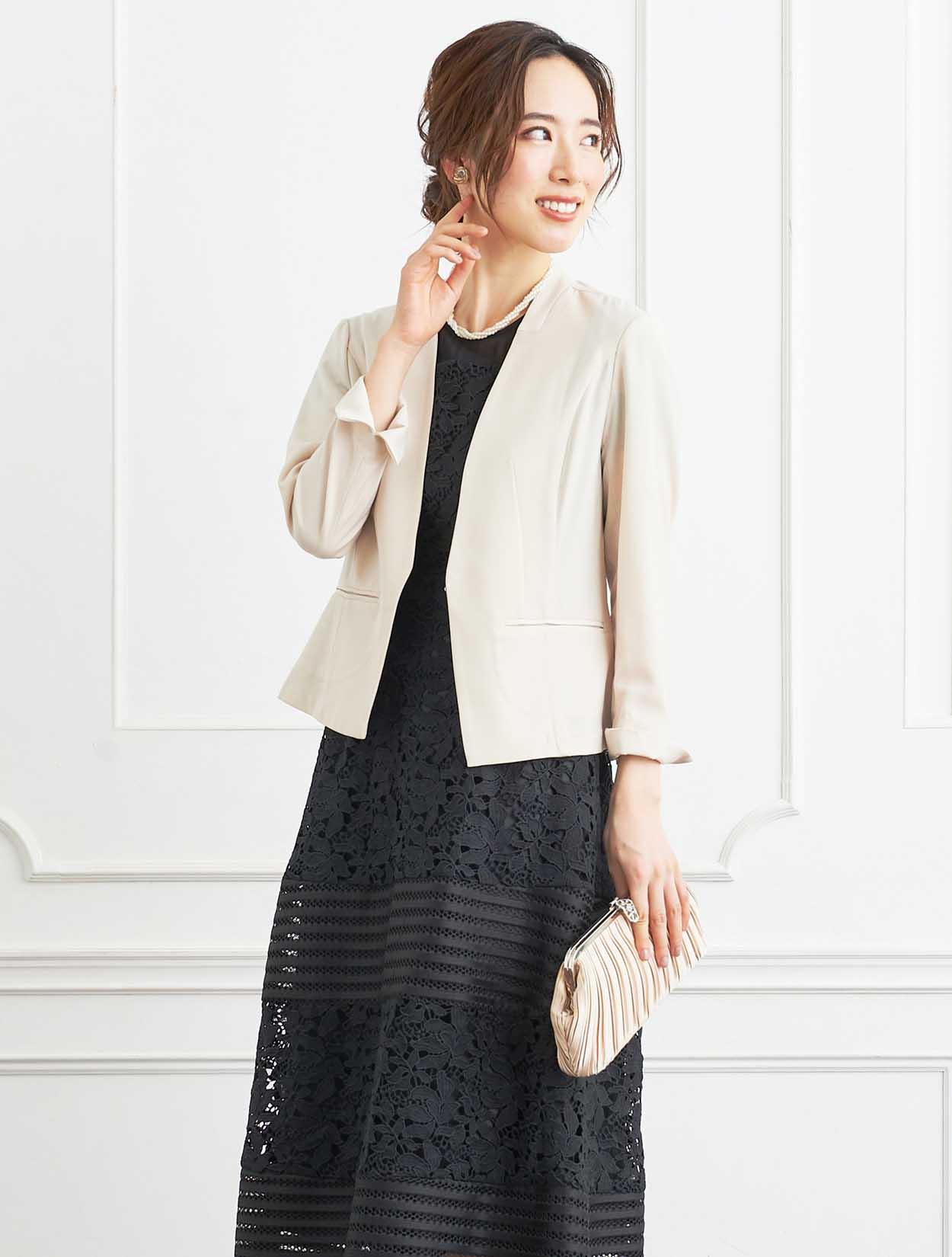 ■スタイルアップ効果のあるブラックのドレスにベージュのボレロで上品な大人スタイル。
