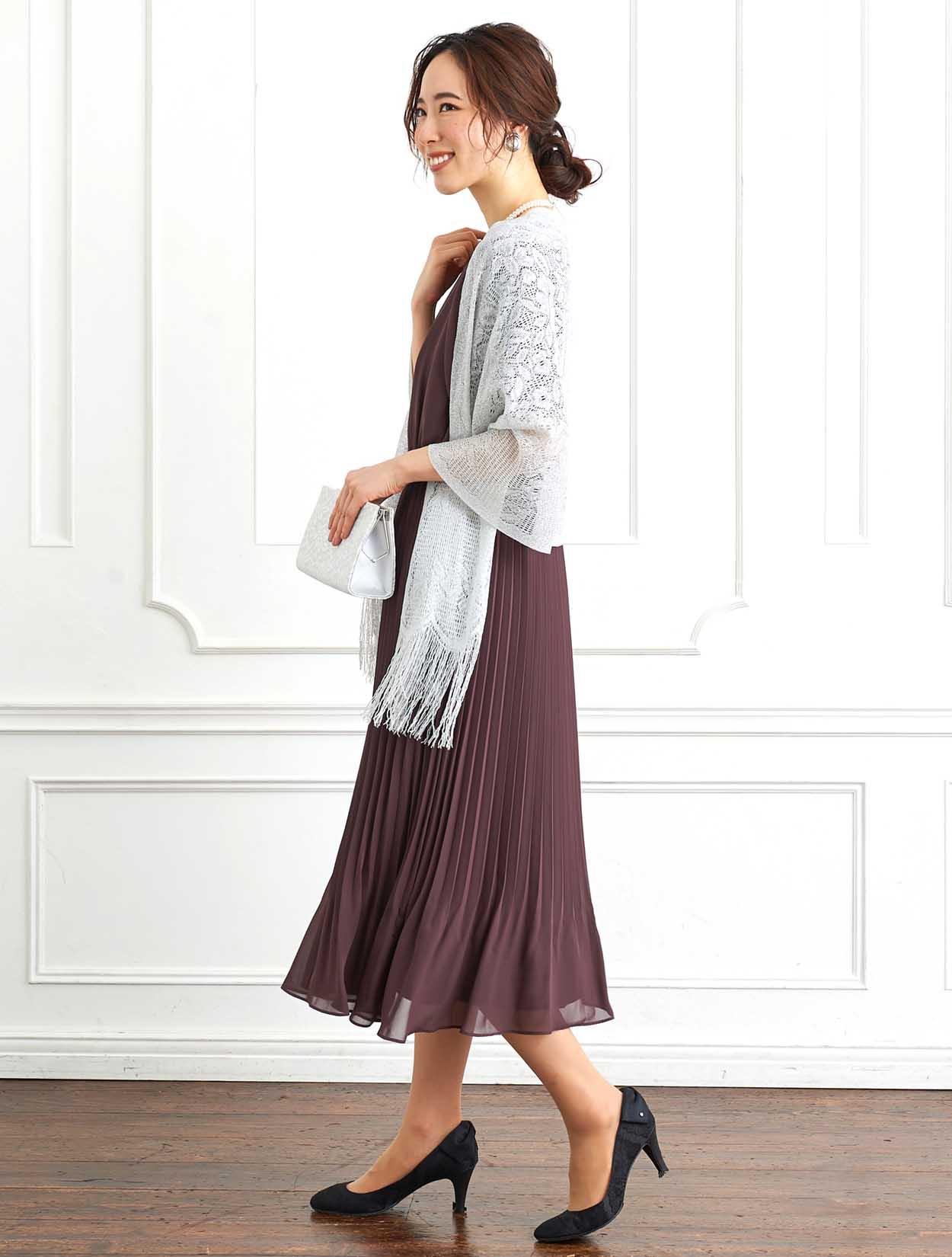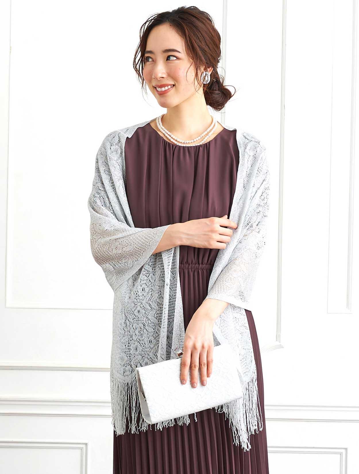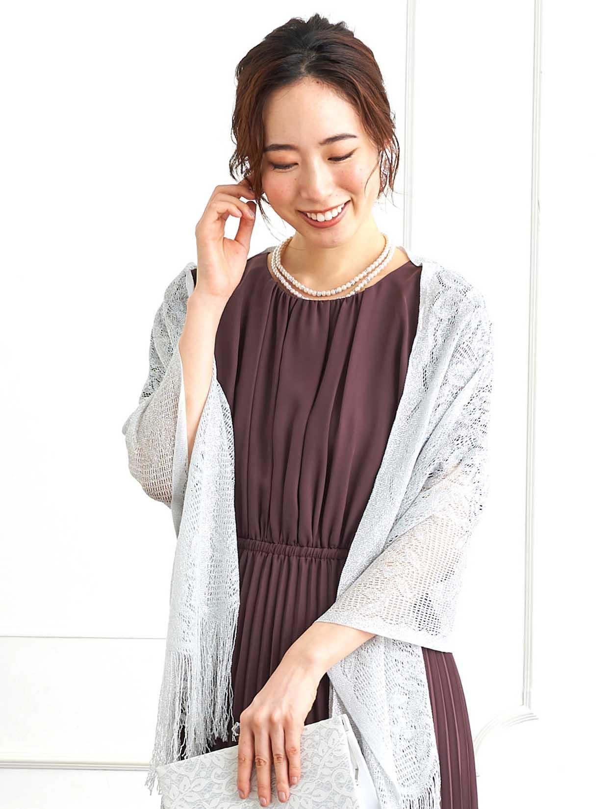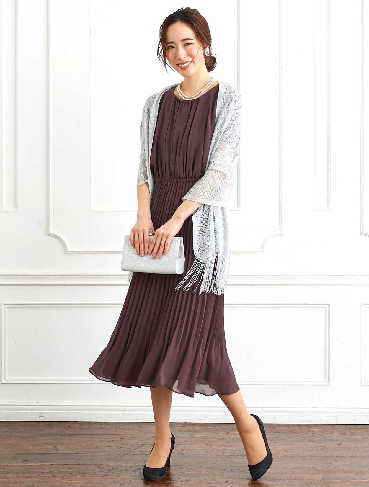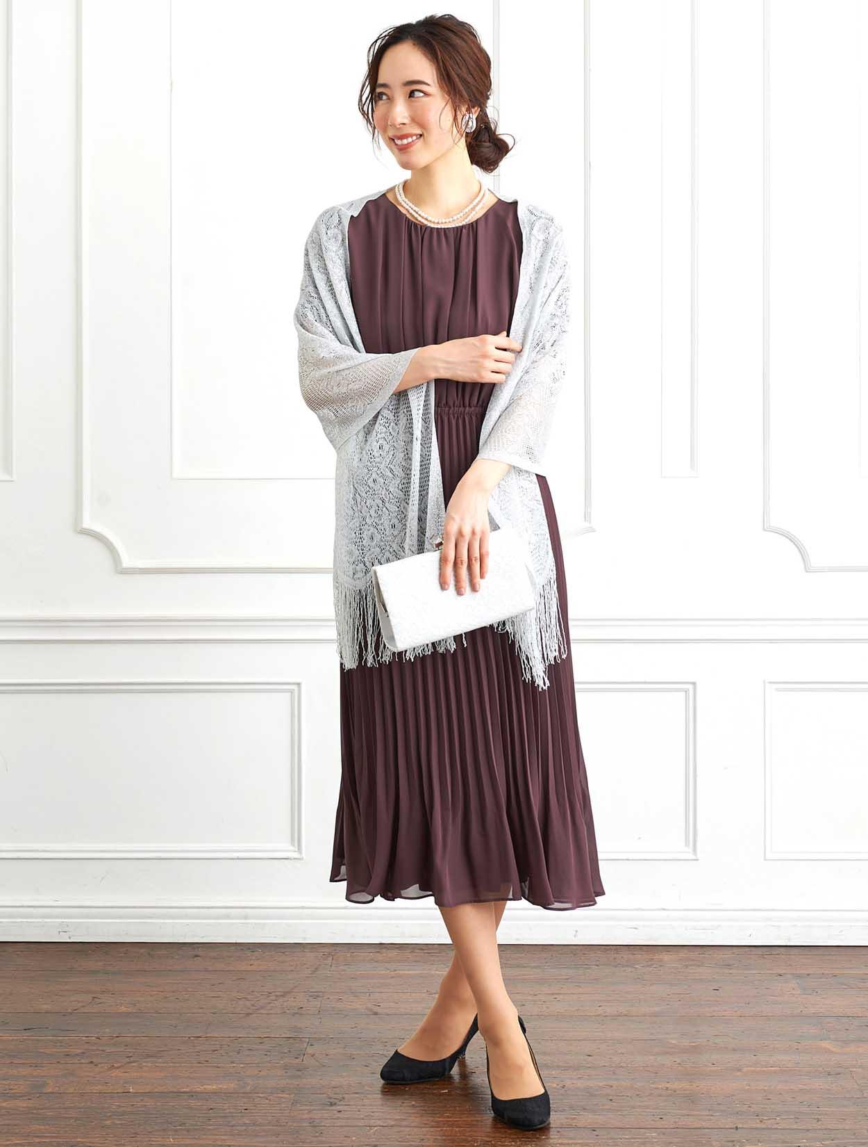 ■こっくりとしたボルドーカラーのドレスにラメストールで華やかなコーディネートです。