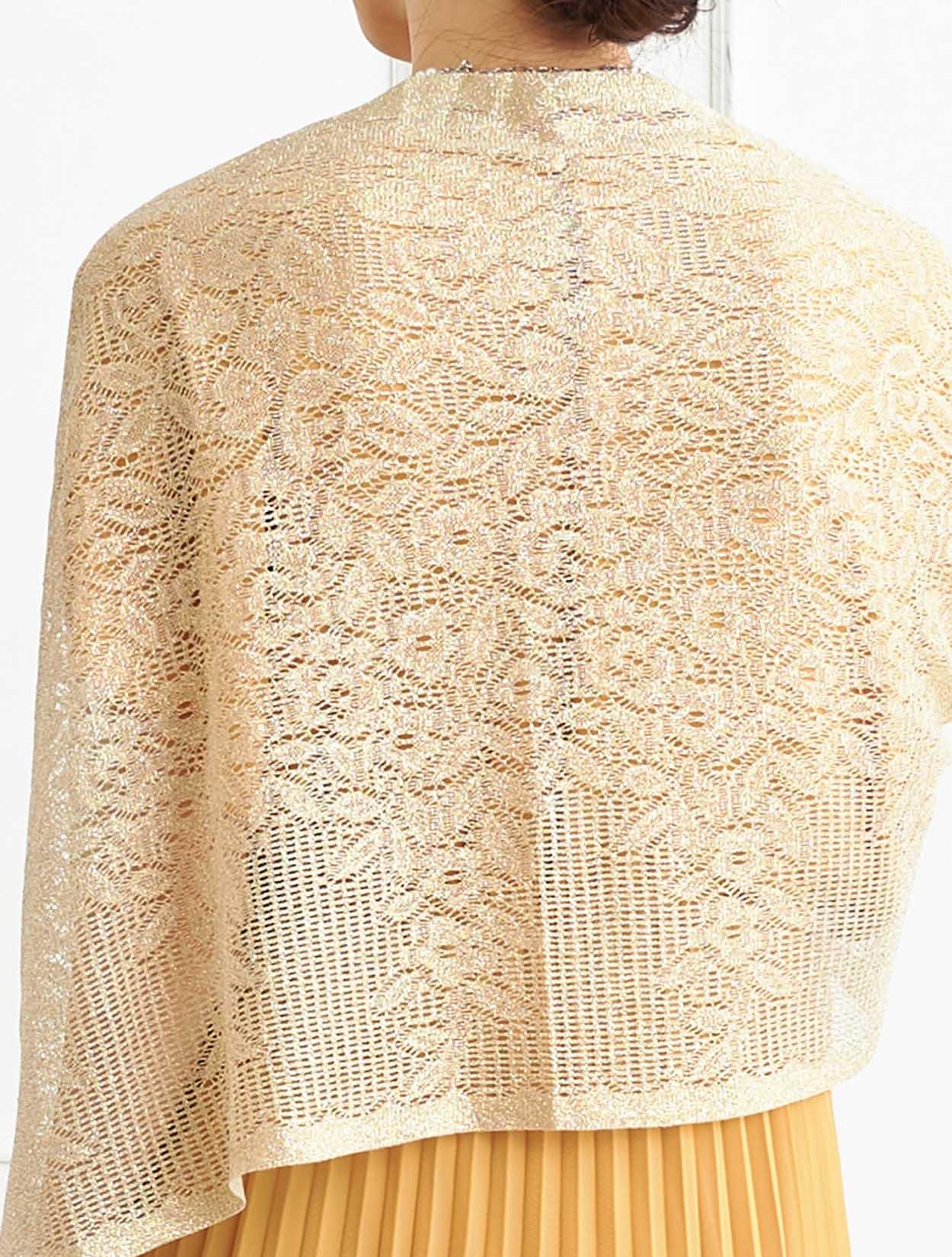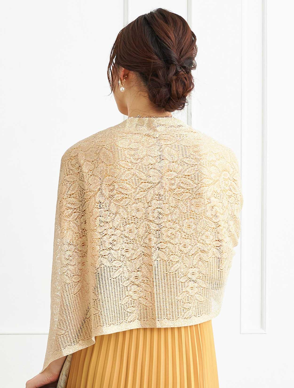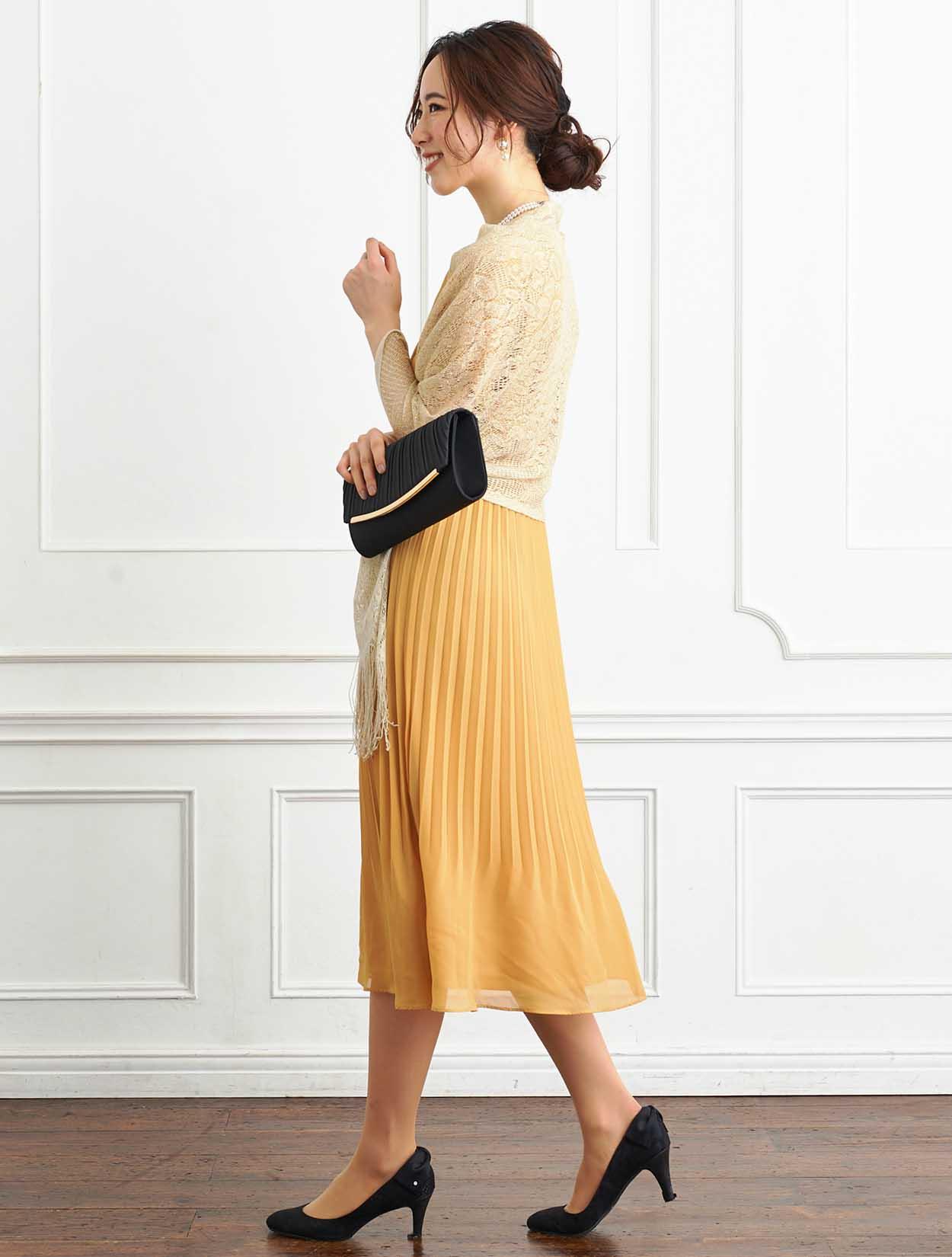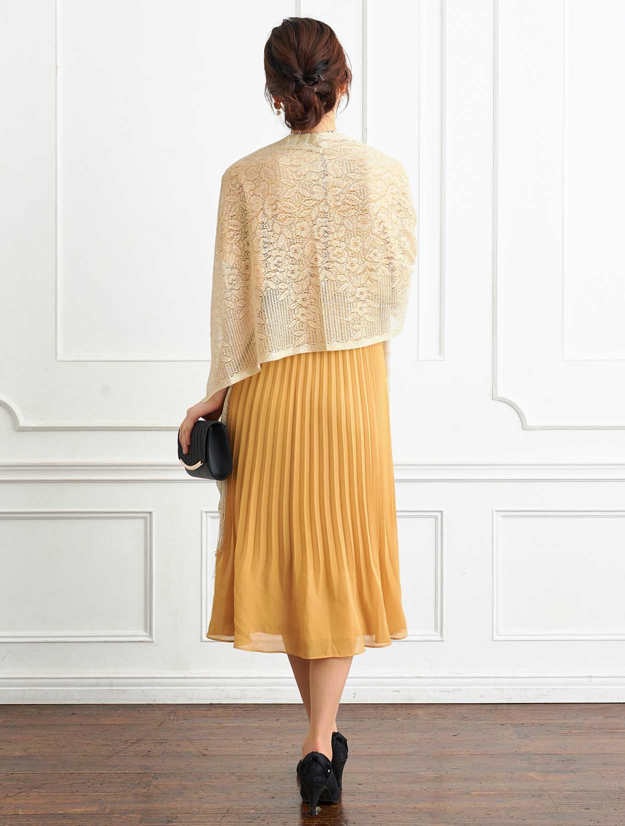 ■鮮やかなイエローのドレスにゴールドのラメストールを合わせたパーティーに人気のスタイル。