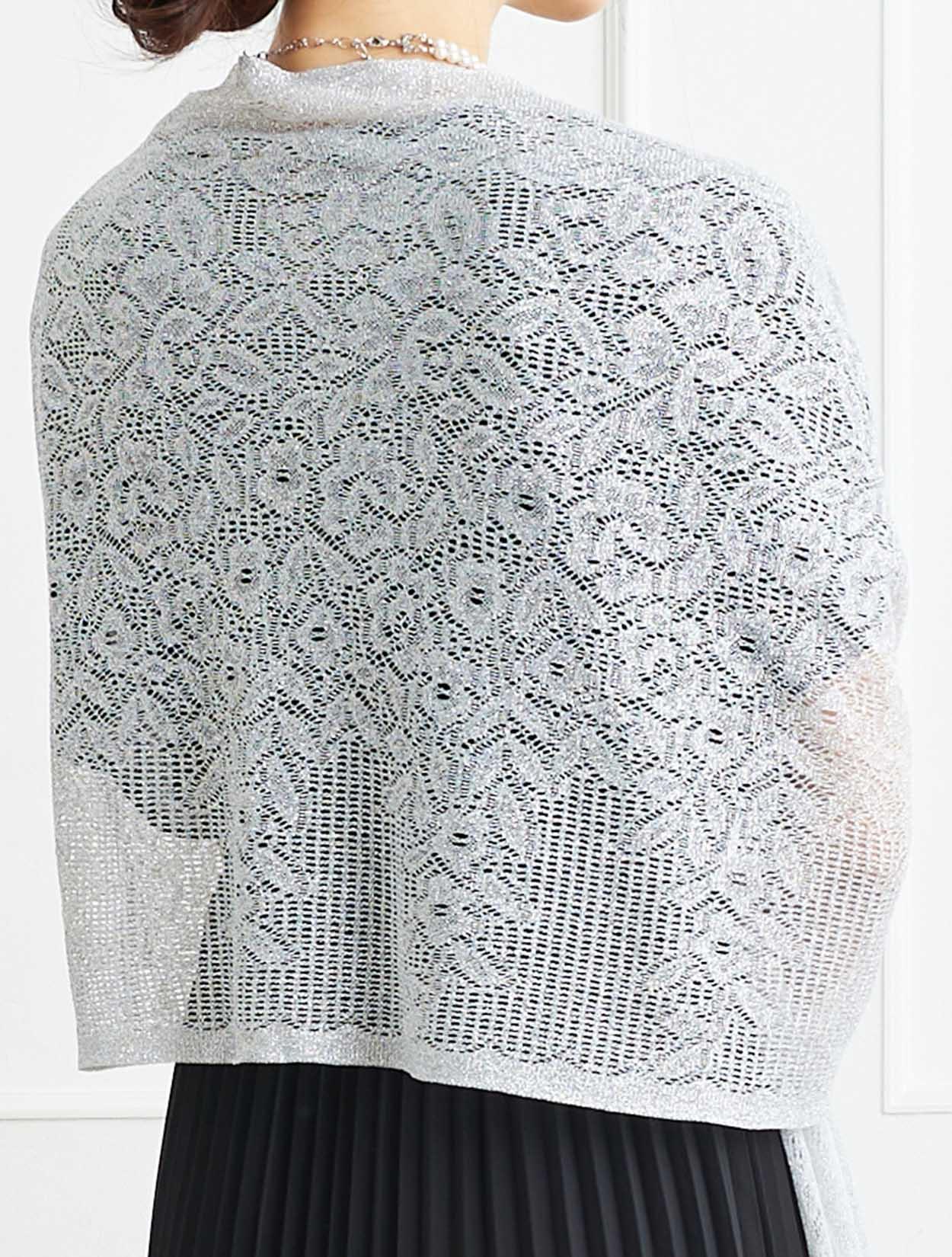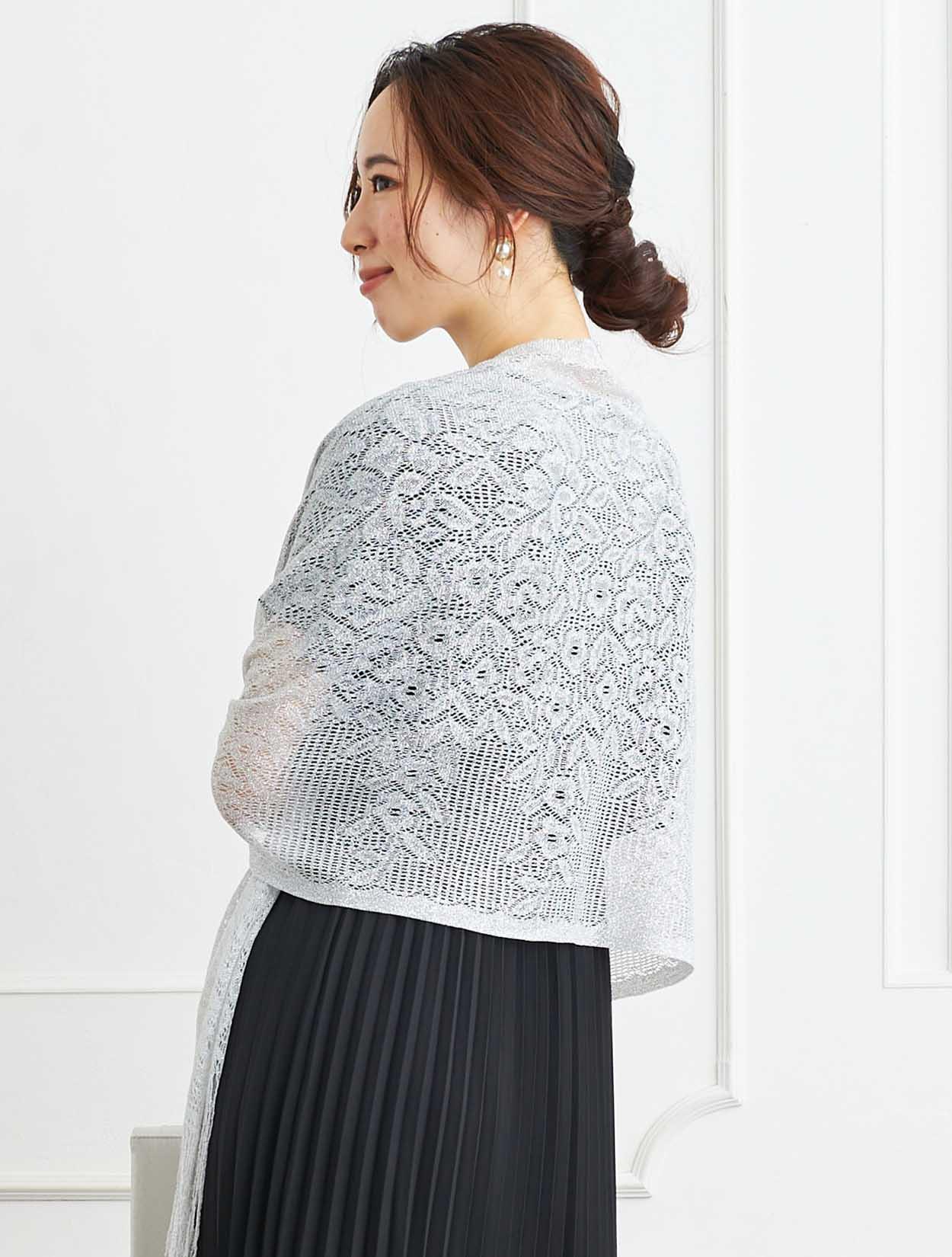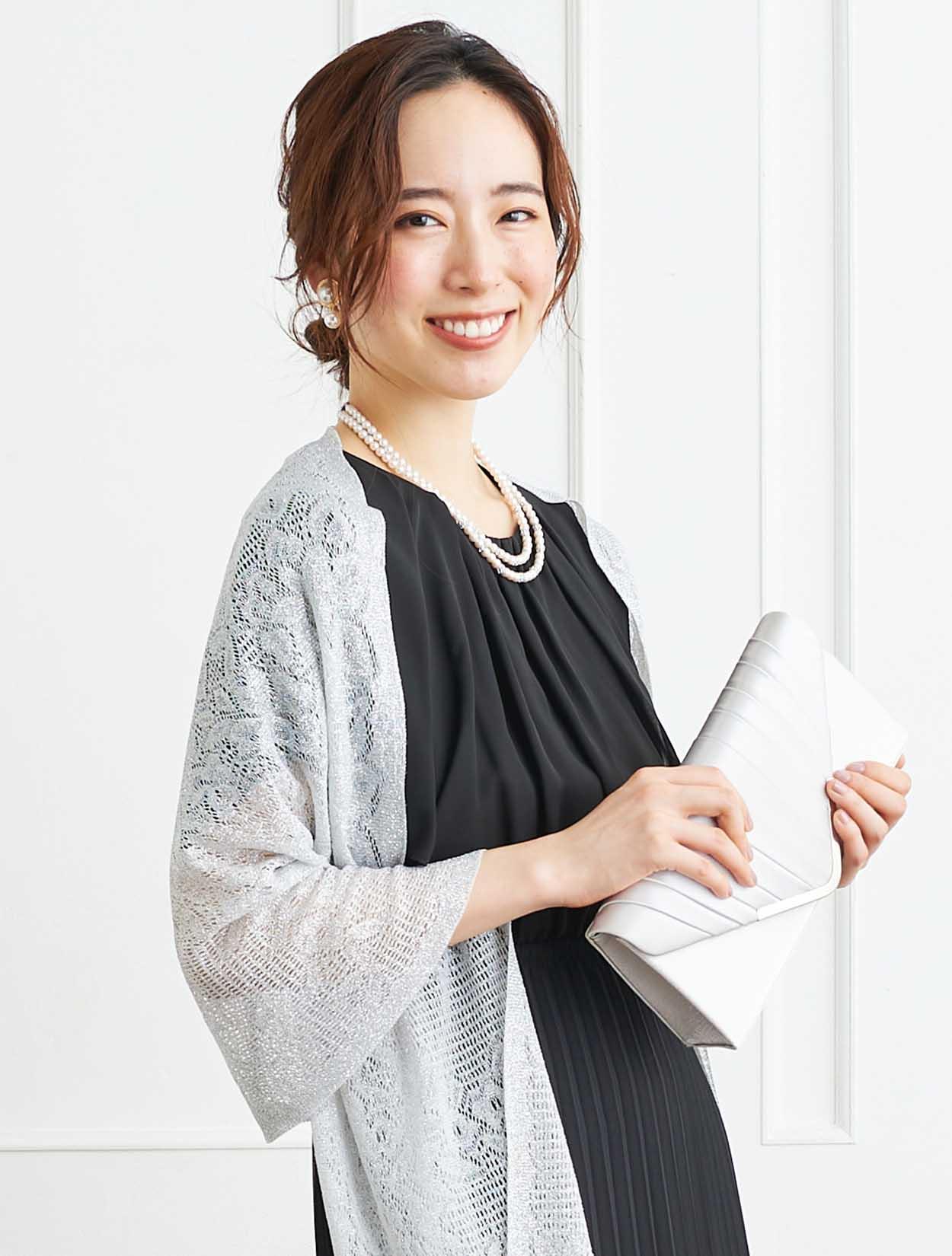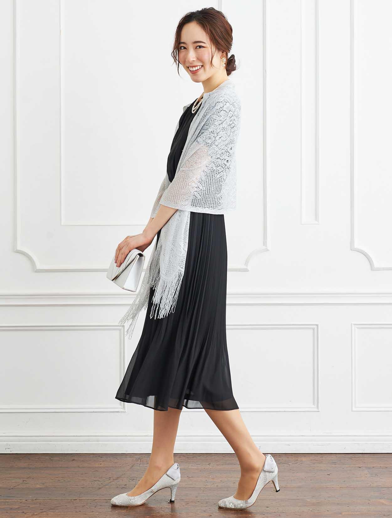 ■優し気な印象のある素材で出来たブラックドレスにシルバーのストールでクールな印象に。