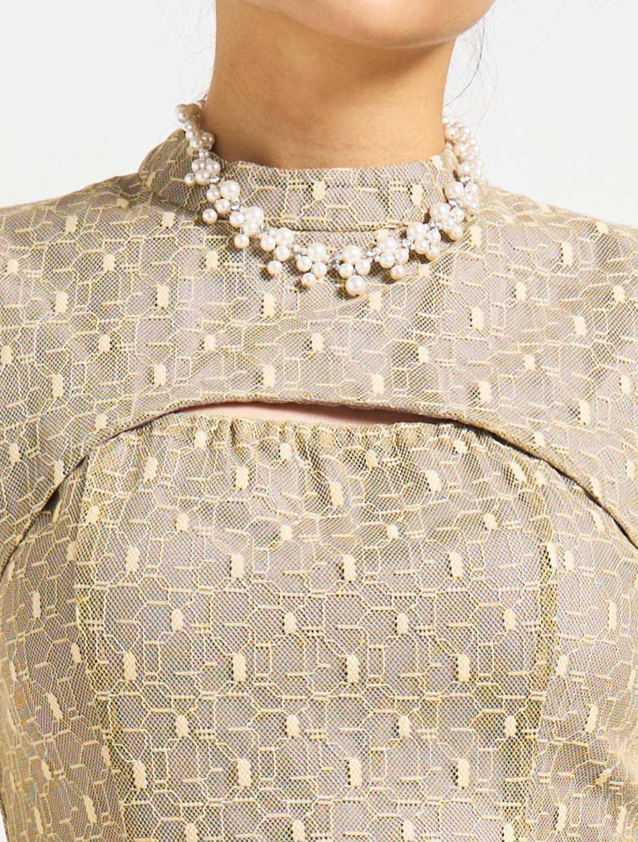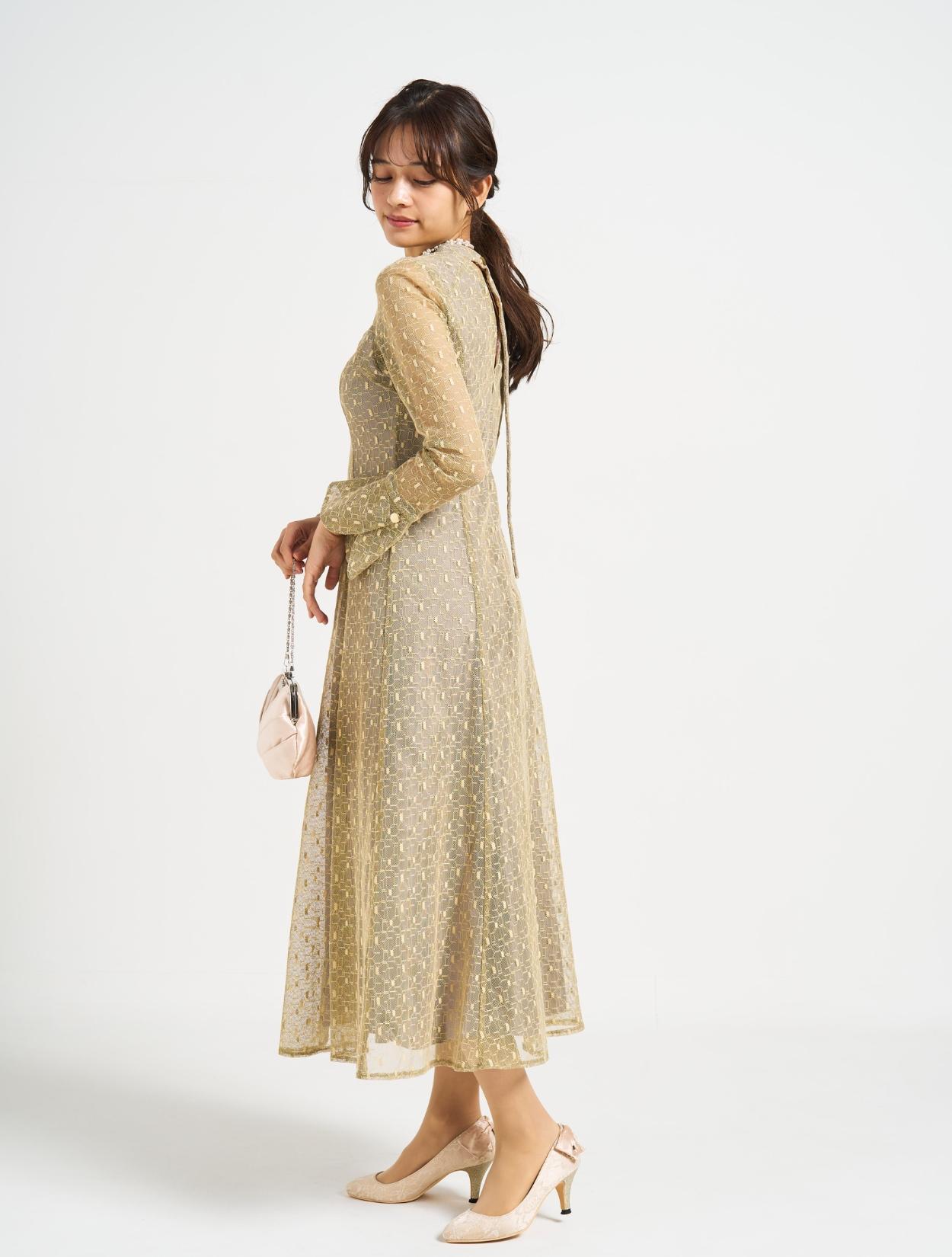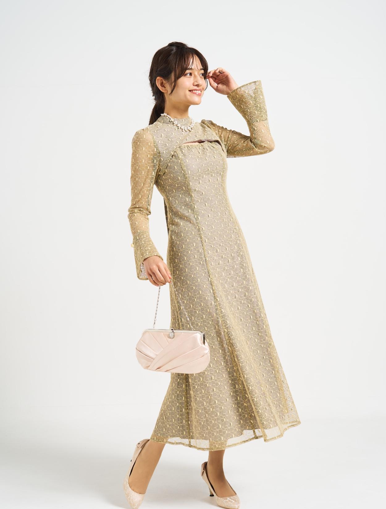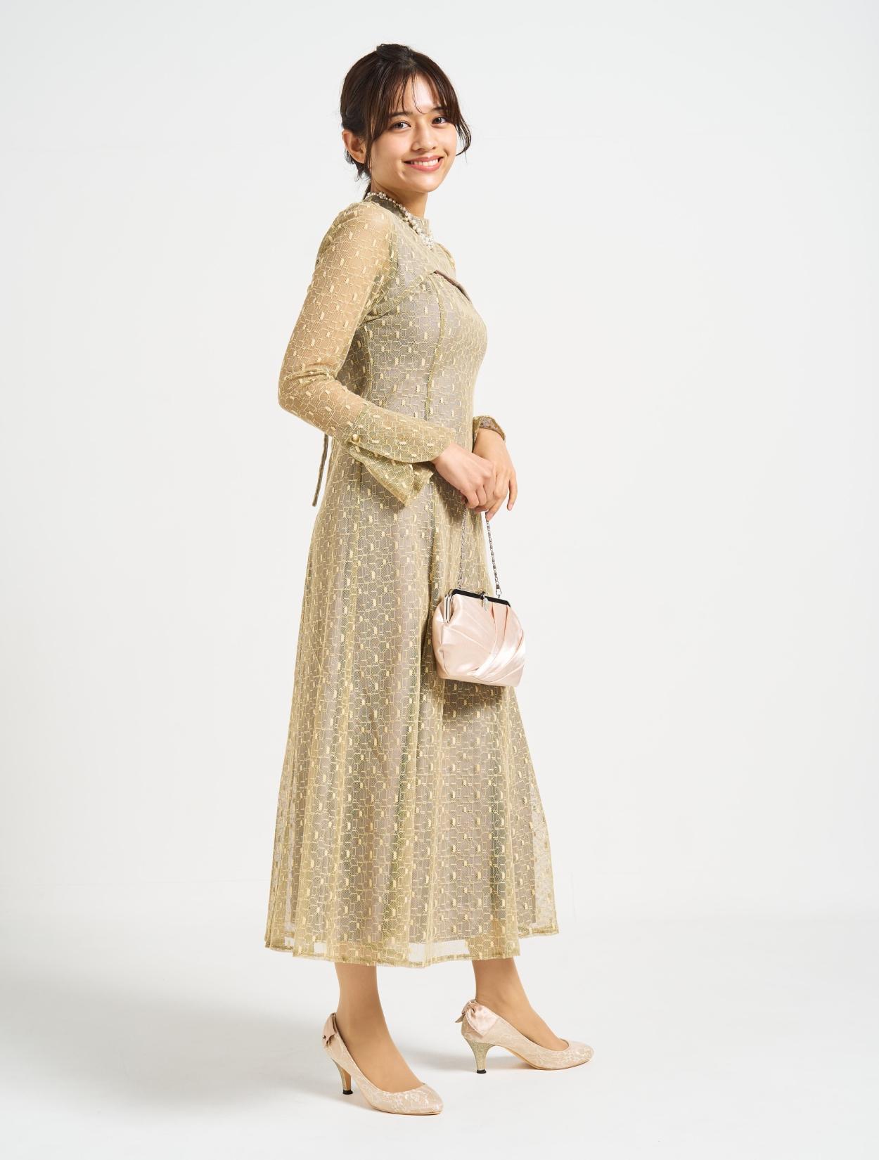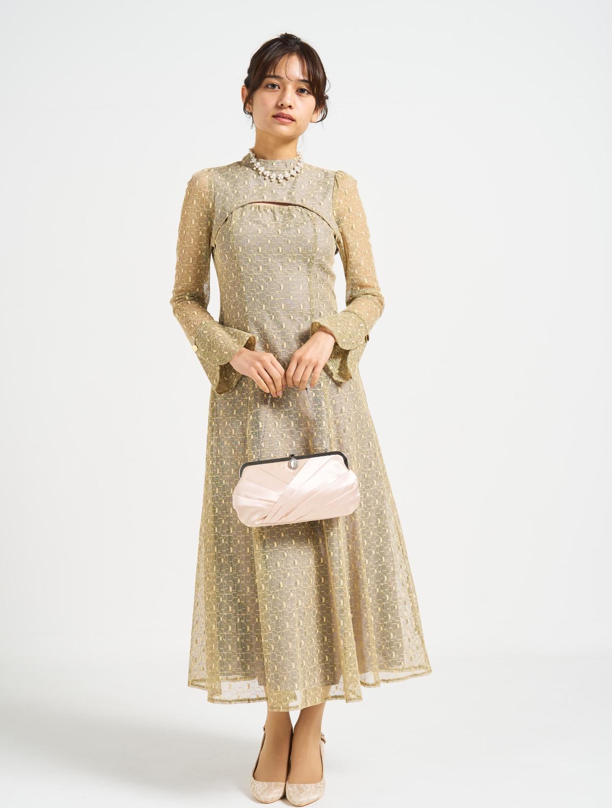 ■フレア感の強めのドレスに、丸みのあるベージュのバッグと華やかなネックレスで柔らかい印象に!