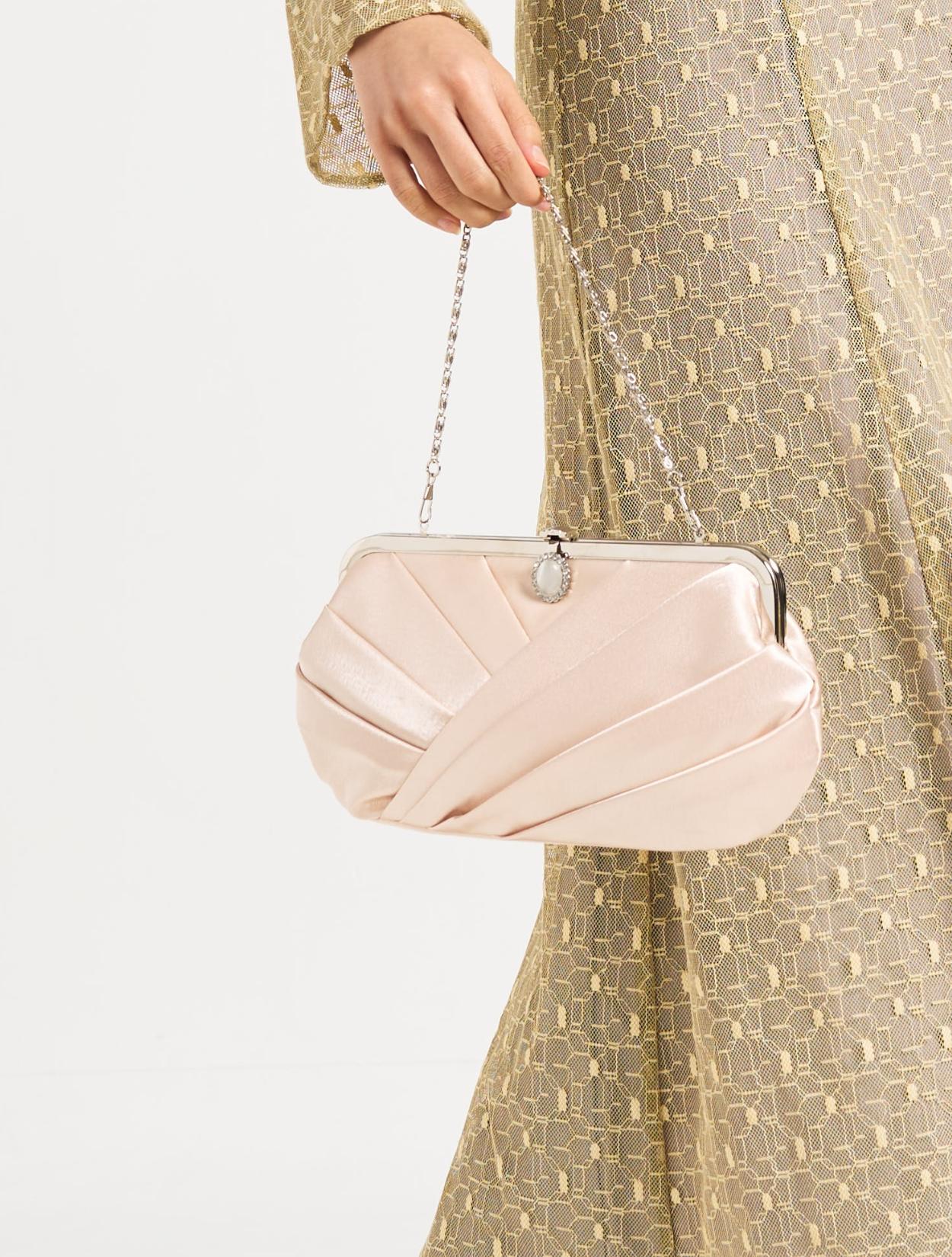 ■丸みのある可愛いバッグとラインストーンが輝くスカラップ調のパールネックレスが、華やかさをプラスします。