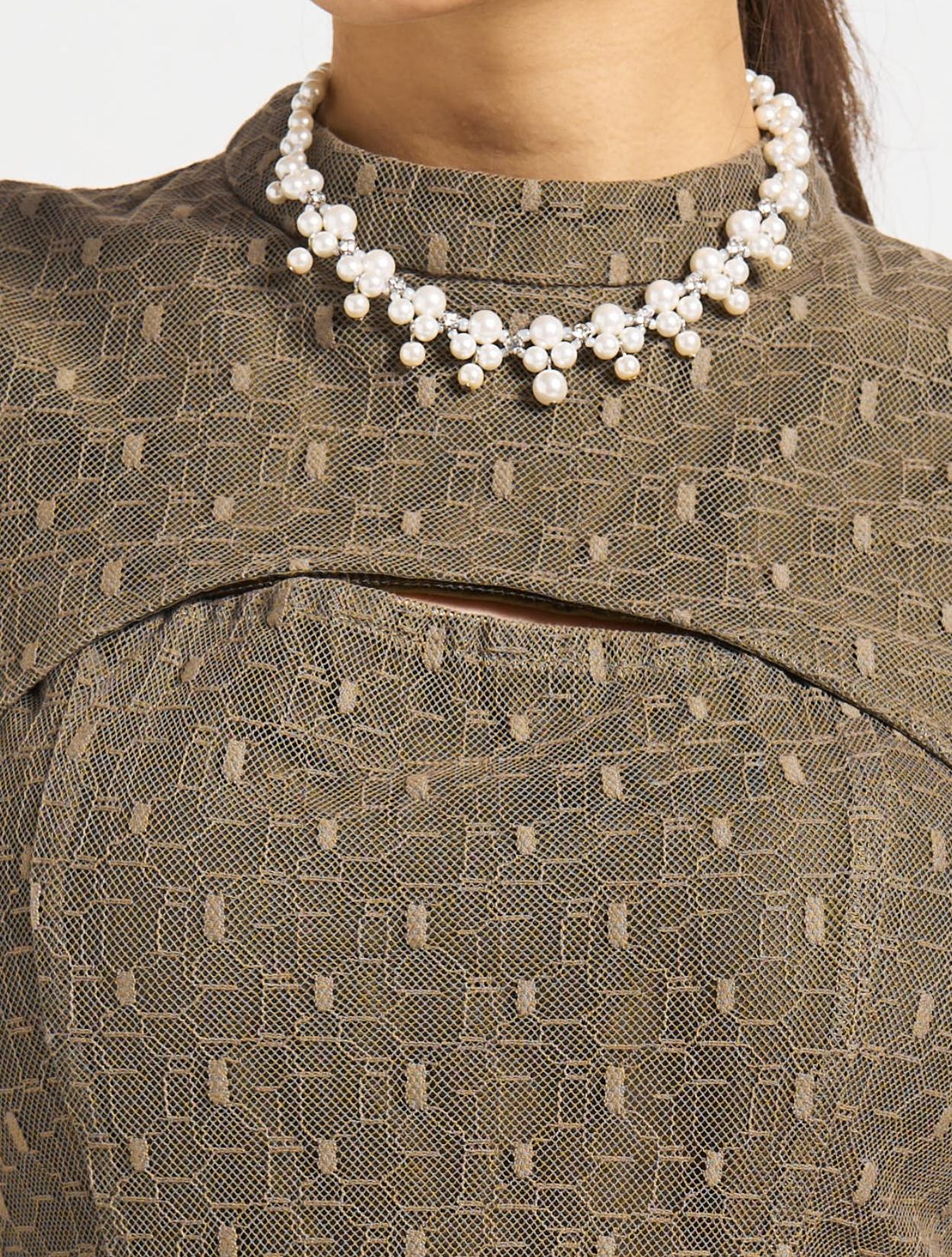 ■胸元のスリットが程よい肌見せで、女性らしさをプラス。