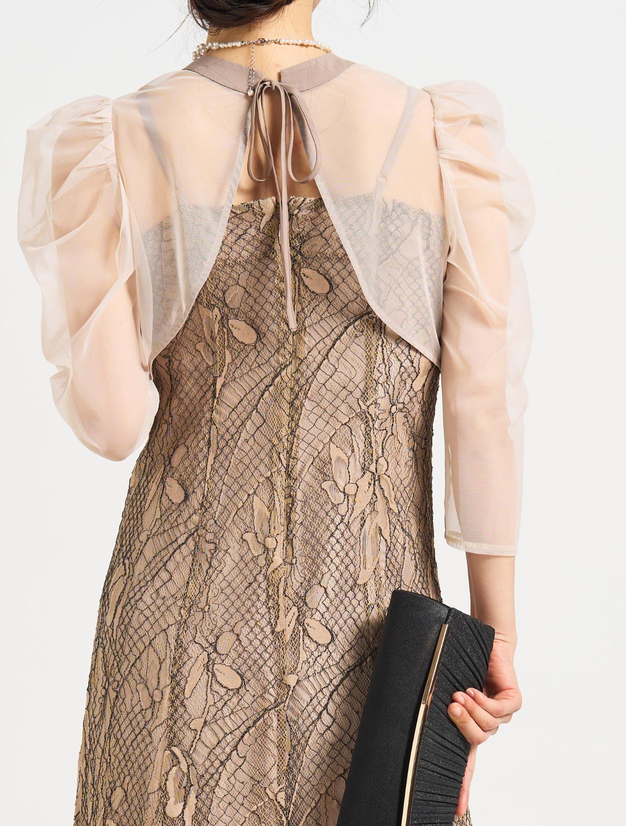 ■透け感のあるボレロは、パワーショルダーで程よいボリューム感があり、腕を華奢に見せてくれます。