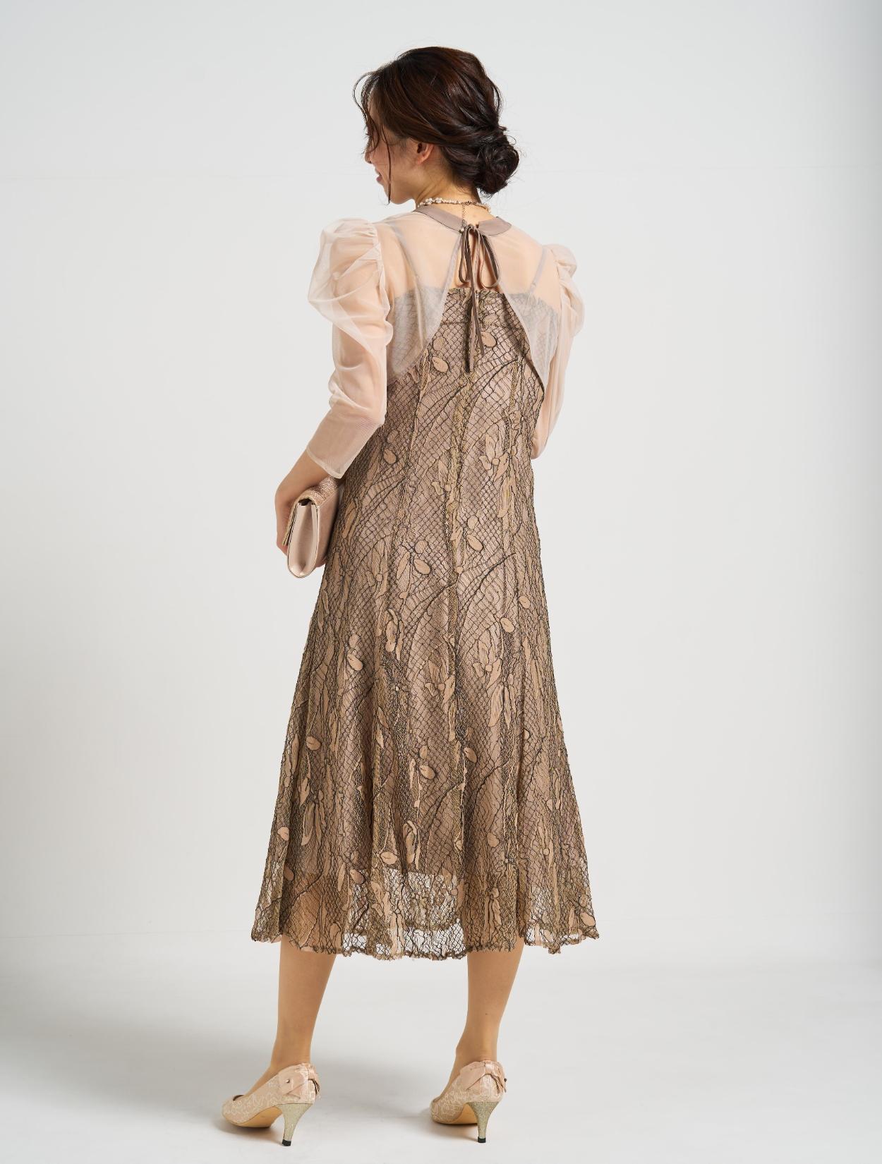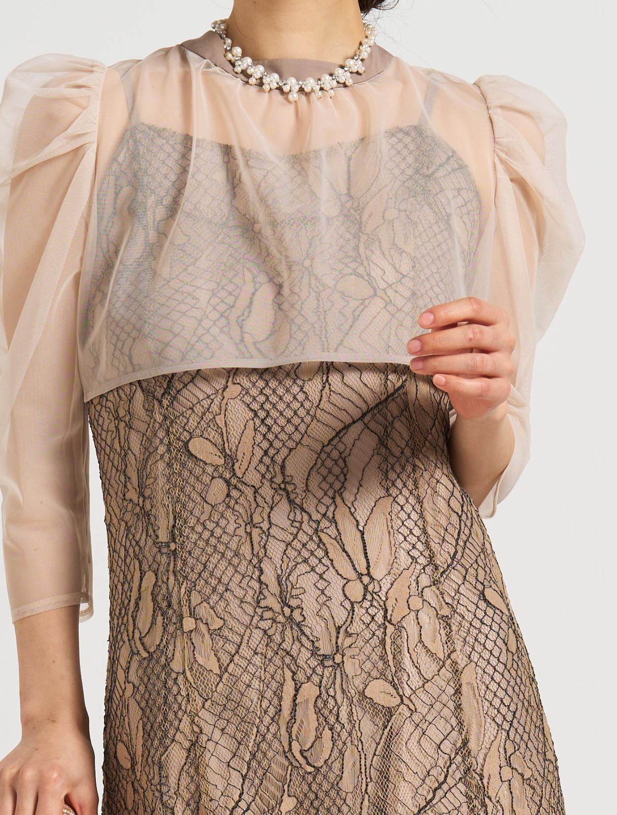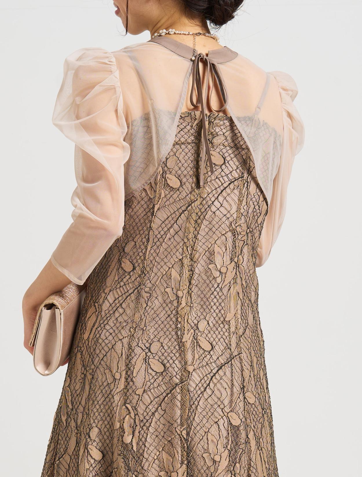 ■透け感のあるチュールのボレロとフレアの効いたエレガントなレースドレスが印象的な1着。
