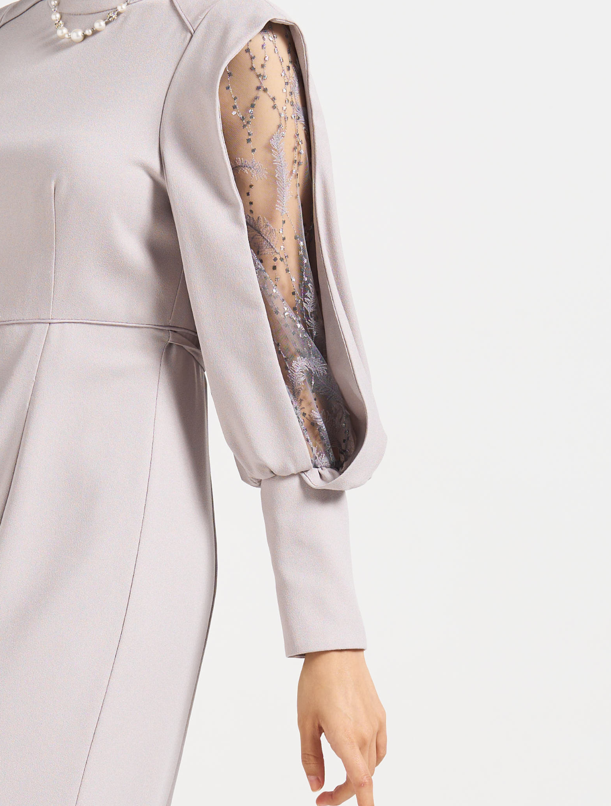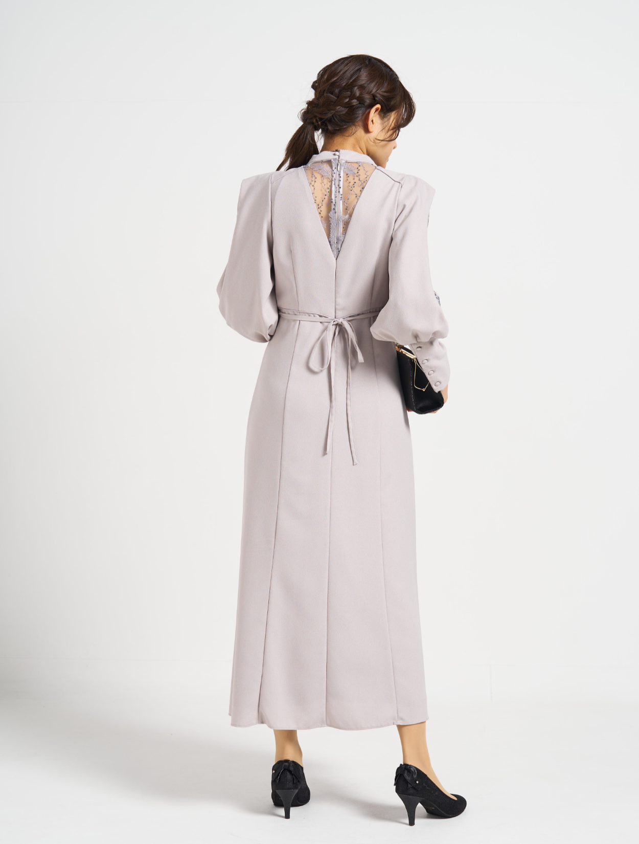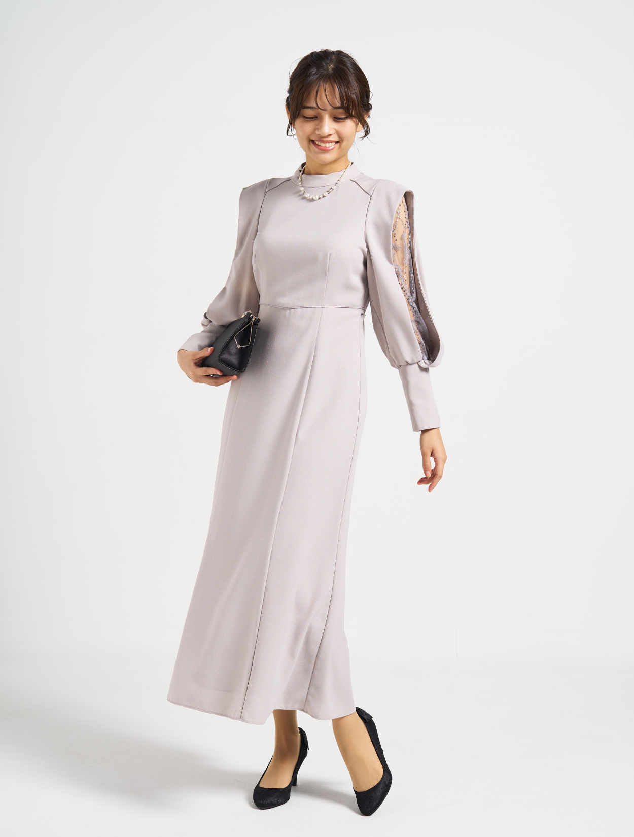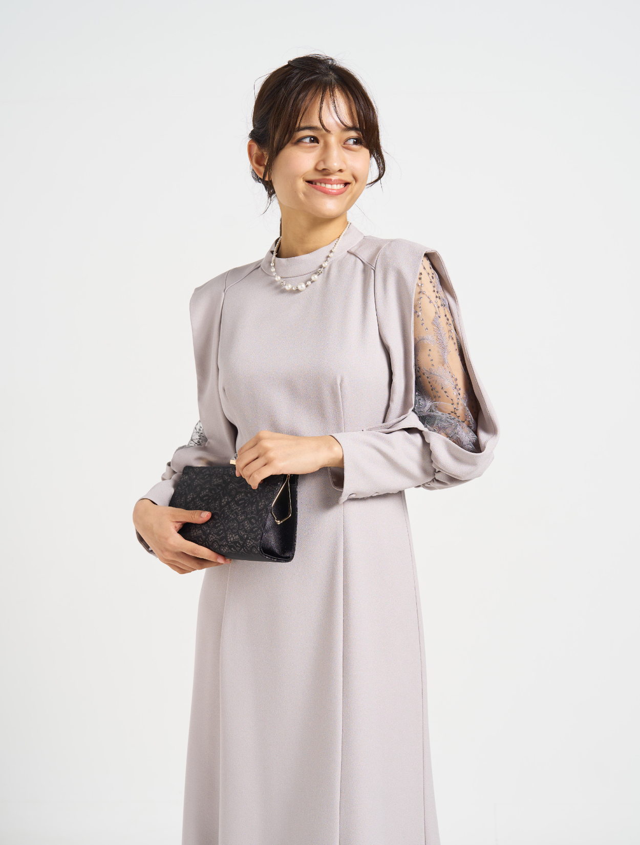 ■上品なフレアラインに袖のスリットから除く刺繍レースが印象的な1着。