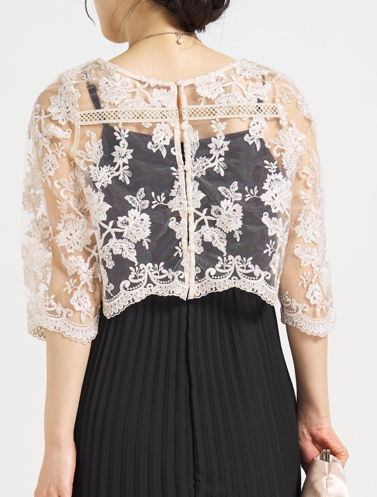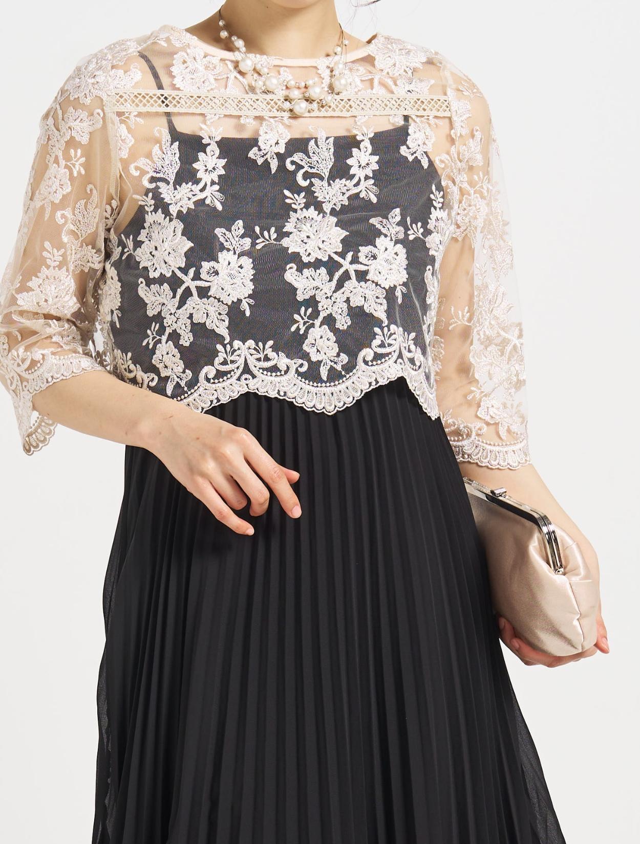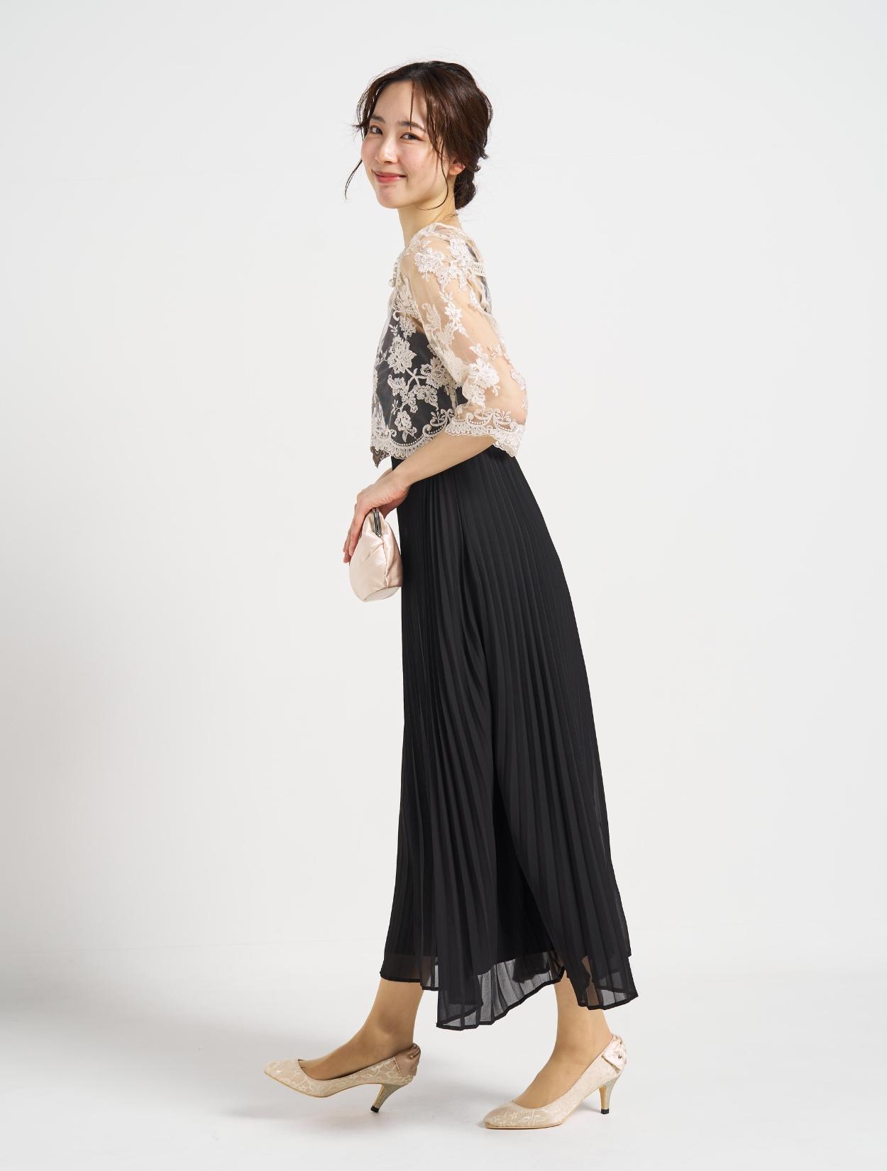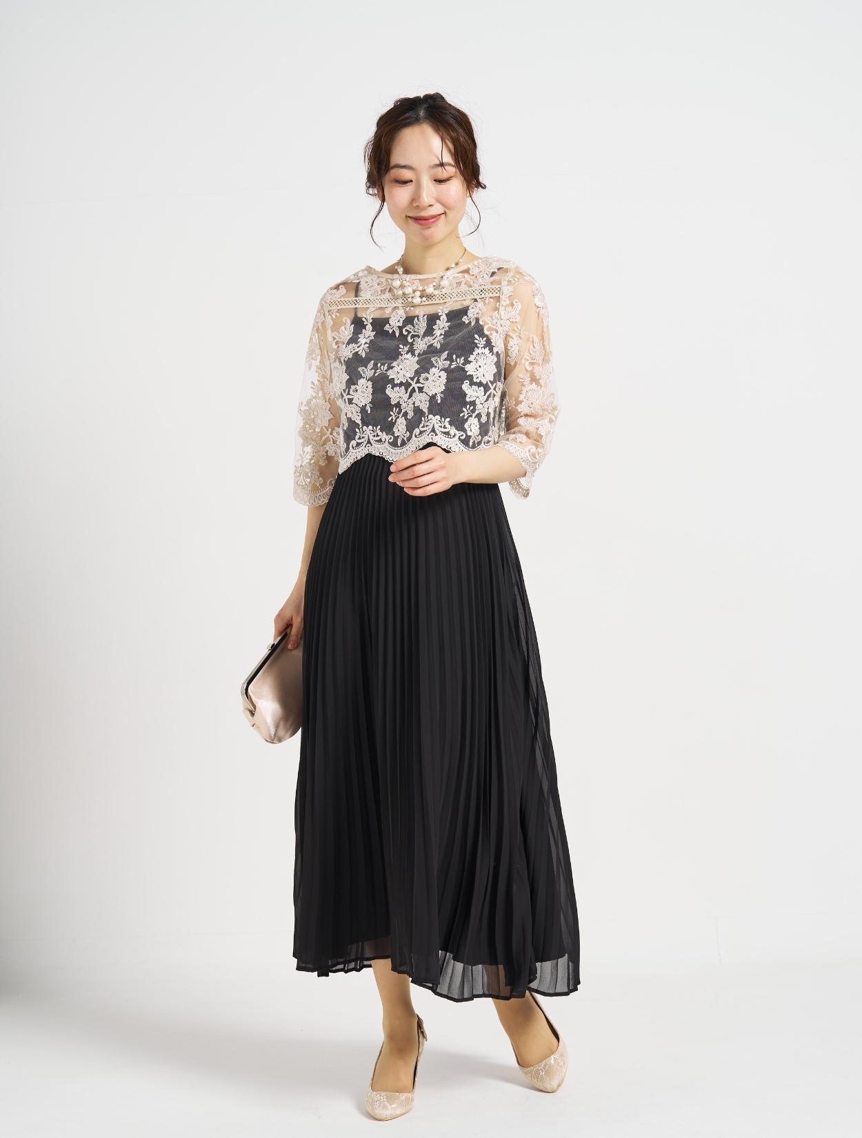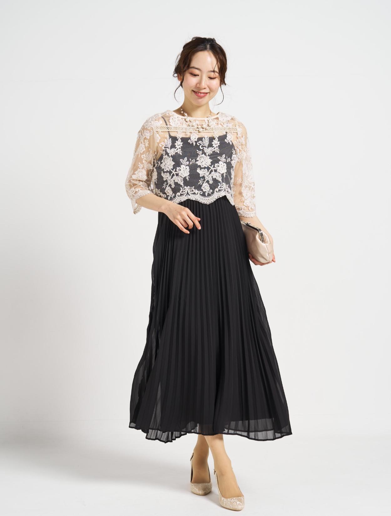 ■プリーツキャミドレスに刺繍レースのTOPSを合わせた上品な1着。