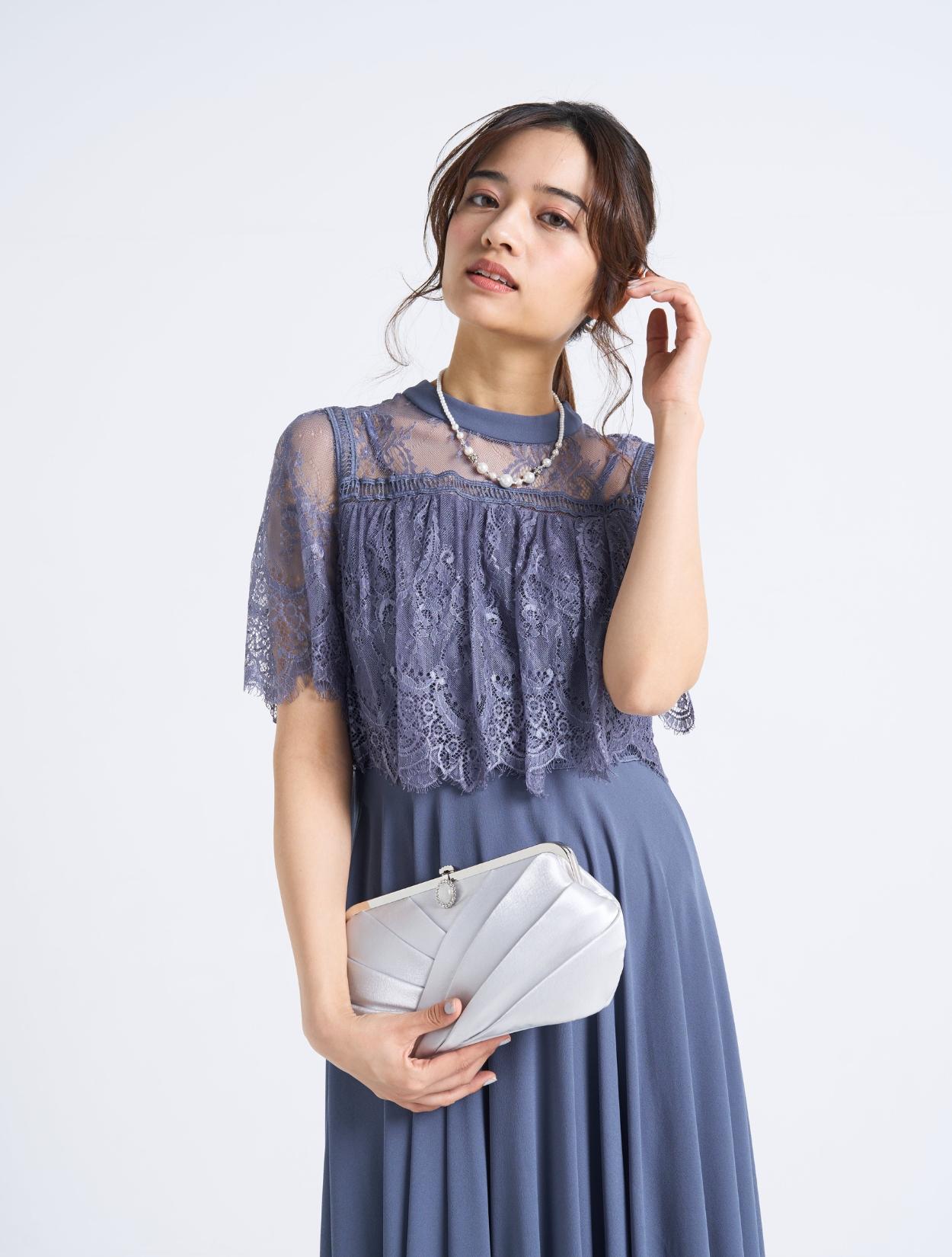 ■スタンドカラーのレースブラウスに分量のあるフレアドレスを合わせた上品な1着。