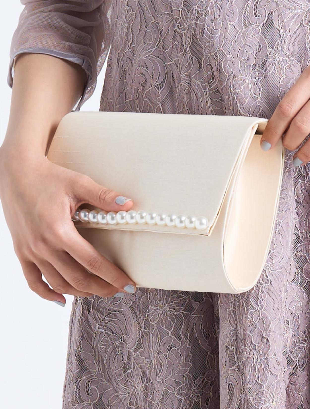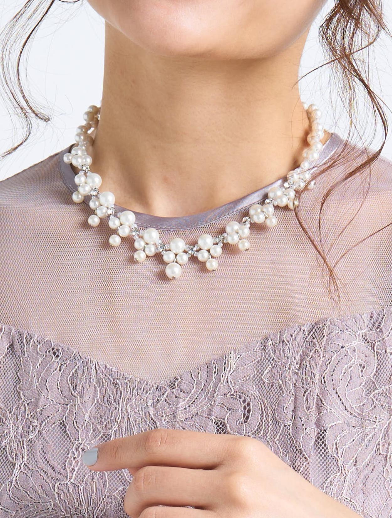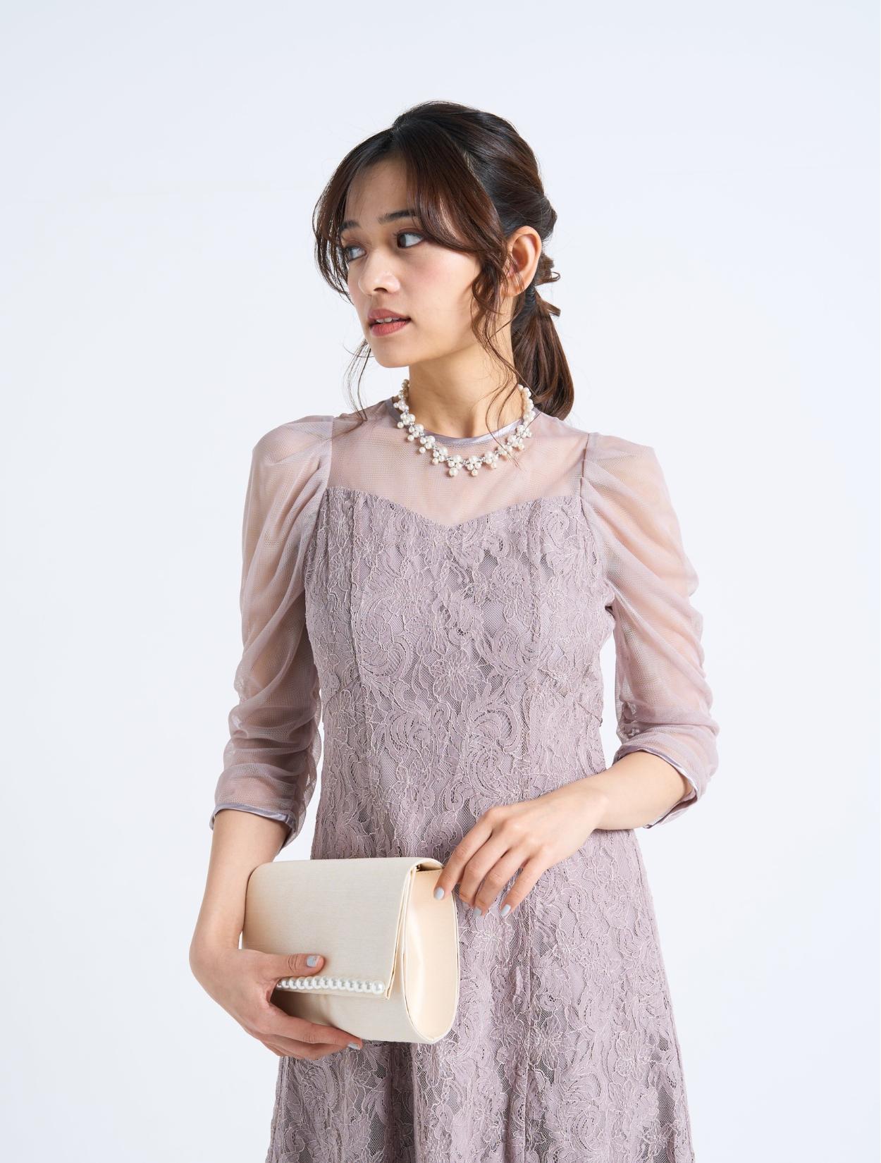 ■スカラップレース調のネックレスとパールの存在感が光るバッグが華やかに演出してくれます。