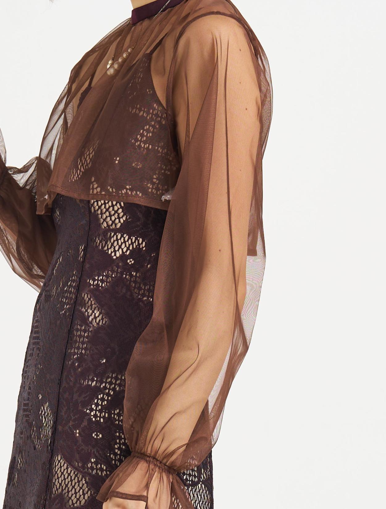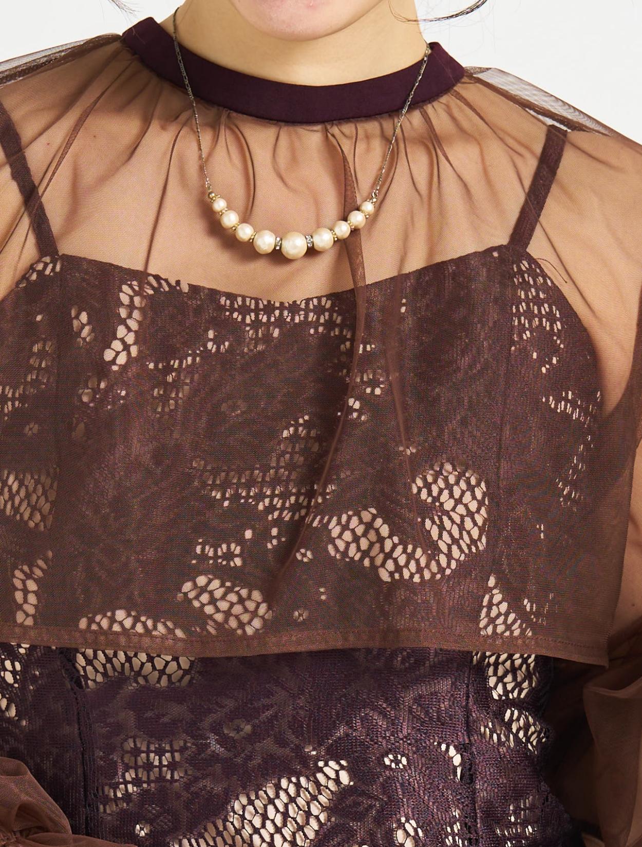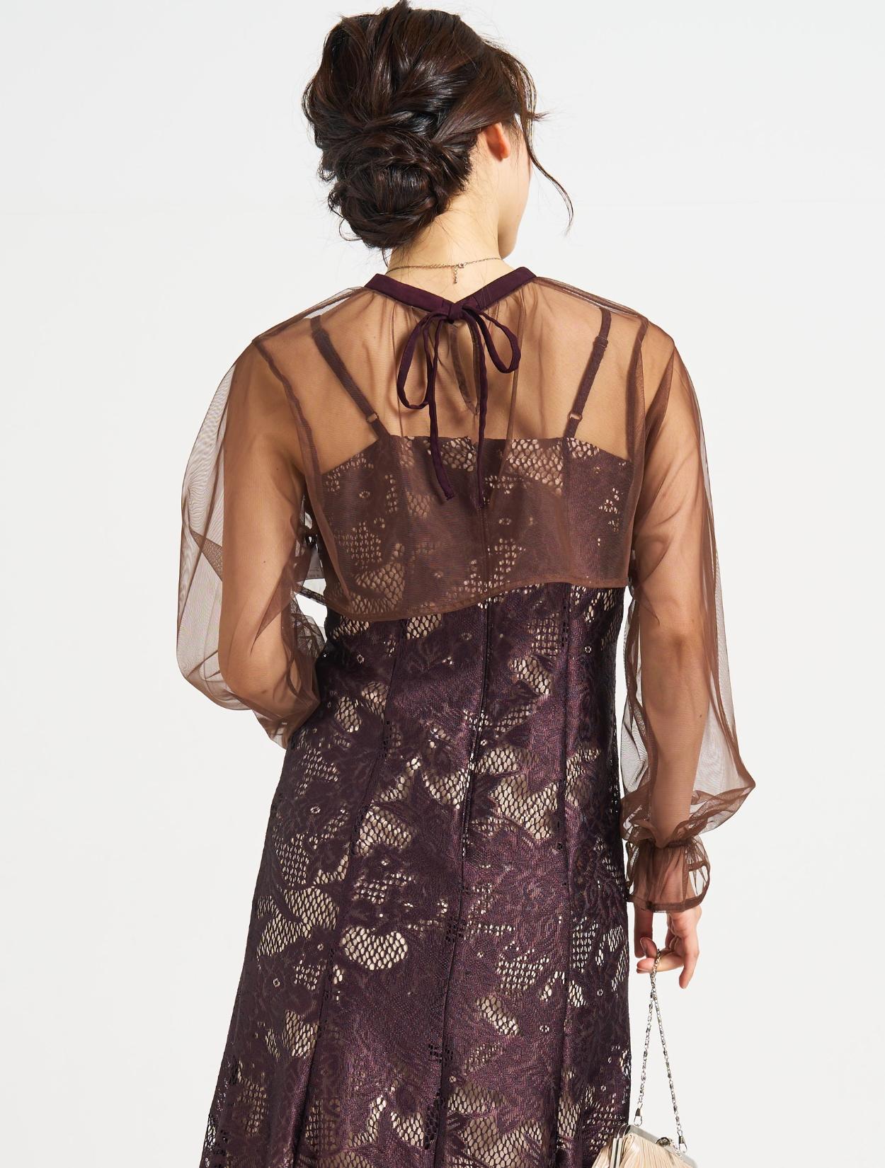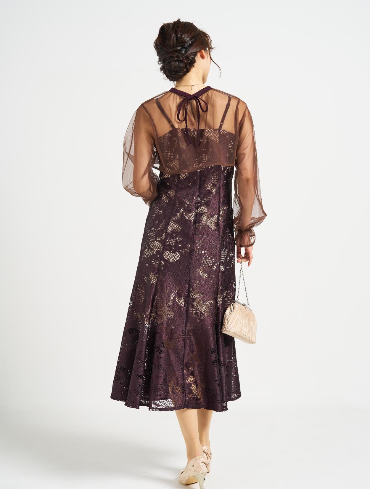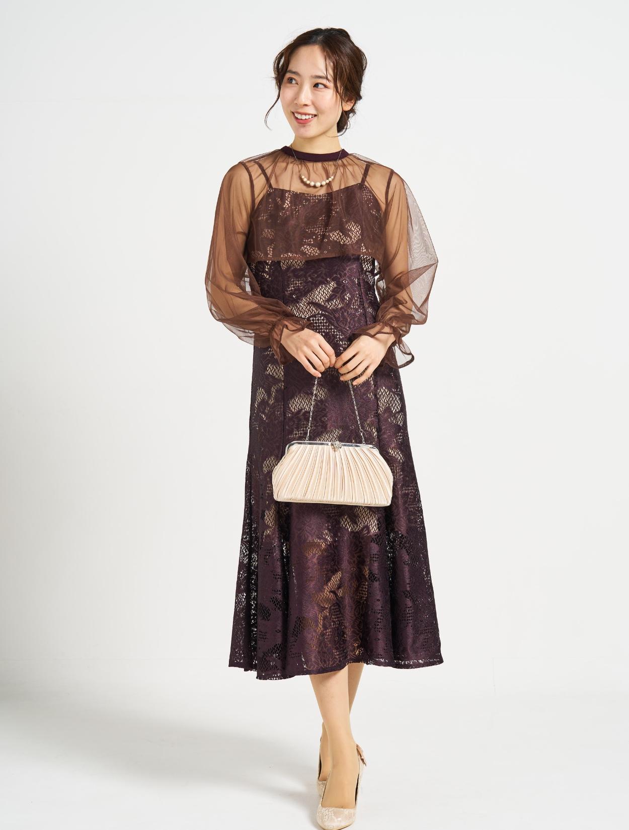 ■明るいベージュの裏地に大人な紫がかったブラウンのジャガードレースのドレス、ダークブラウンのシフォンブラウスです。