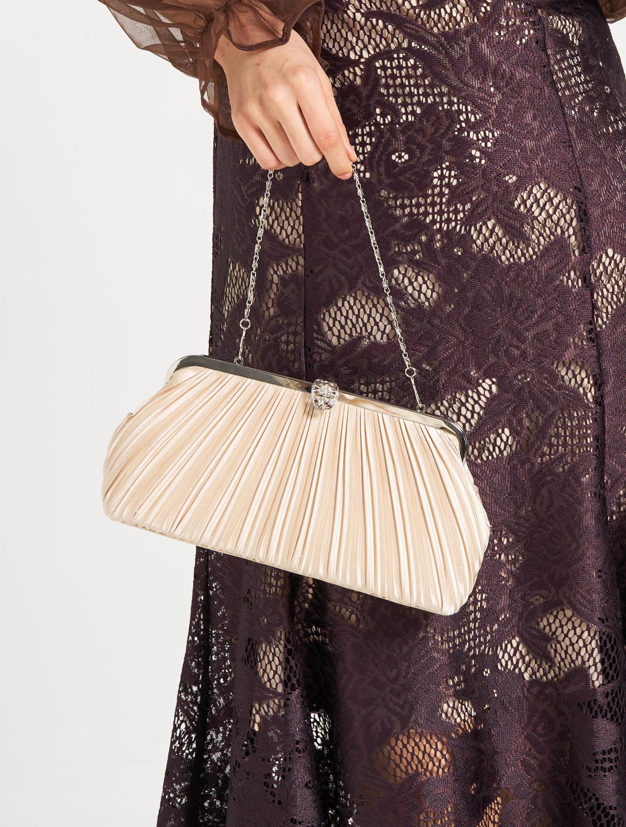 ■華奢なネックレスと上品なプリーツバッグで派手過ぎない印象に。