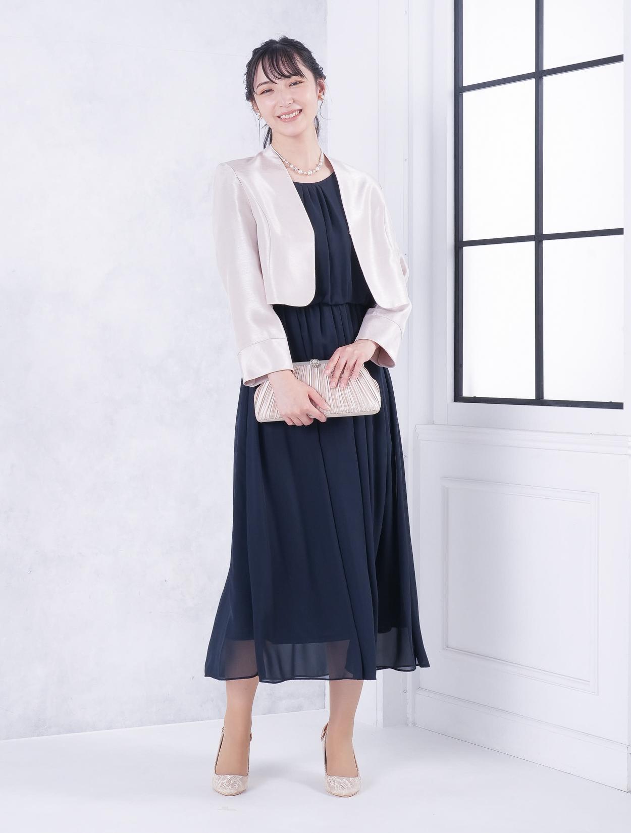 ■ネイビーのドレスにベージュの羽織とバッグを合わせた柔らかい雰囲気のワントーンコーディネート。