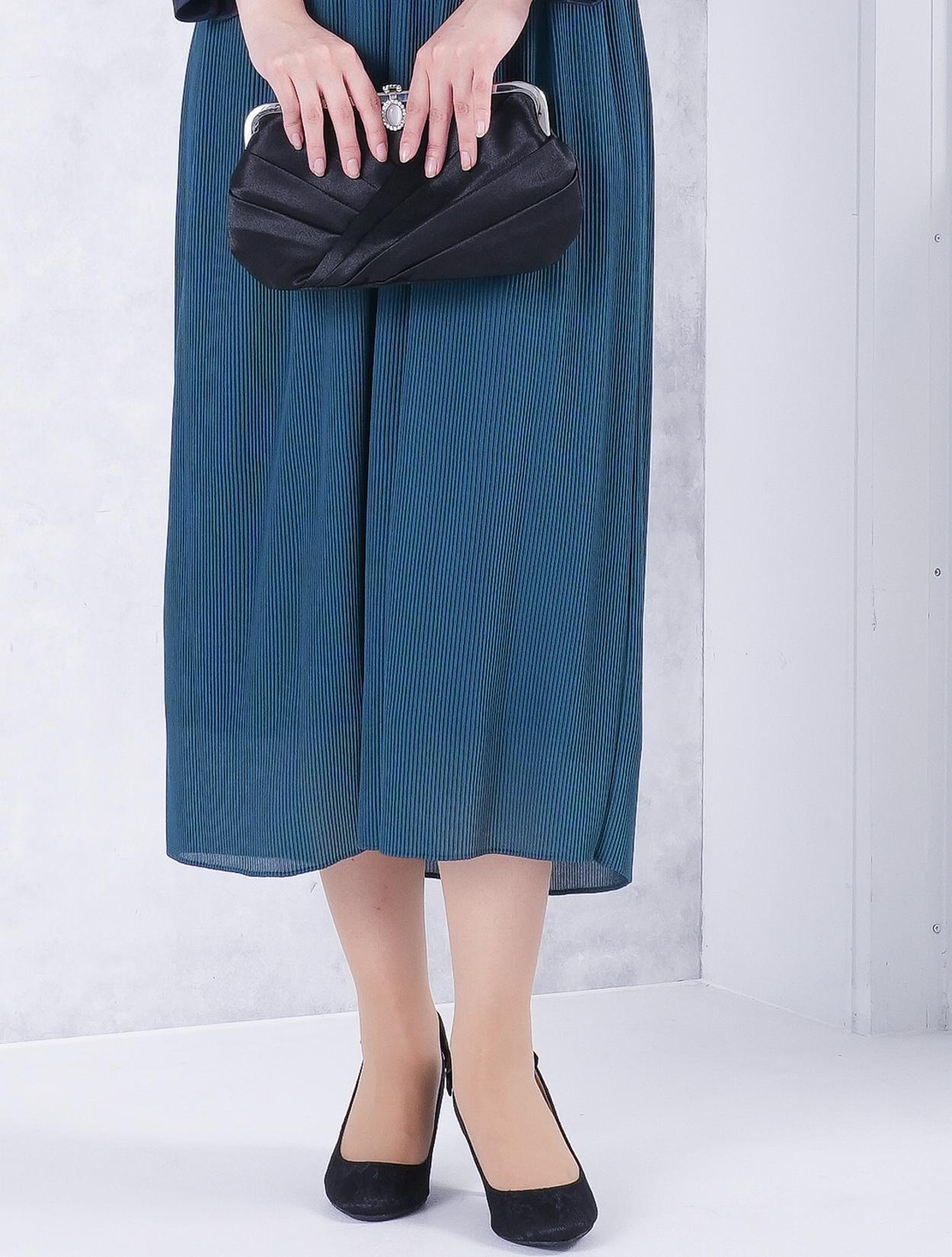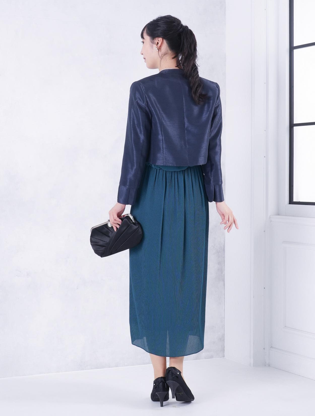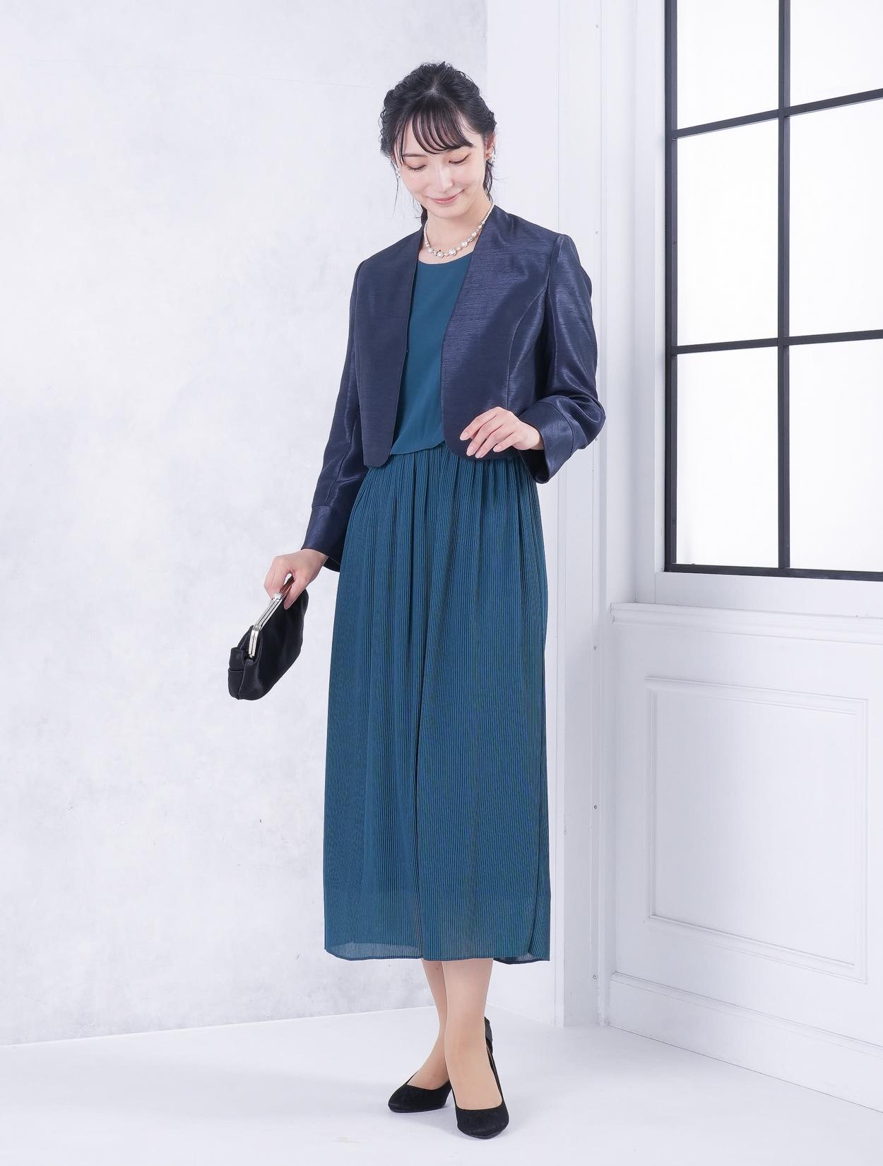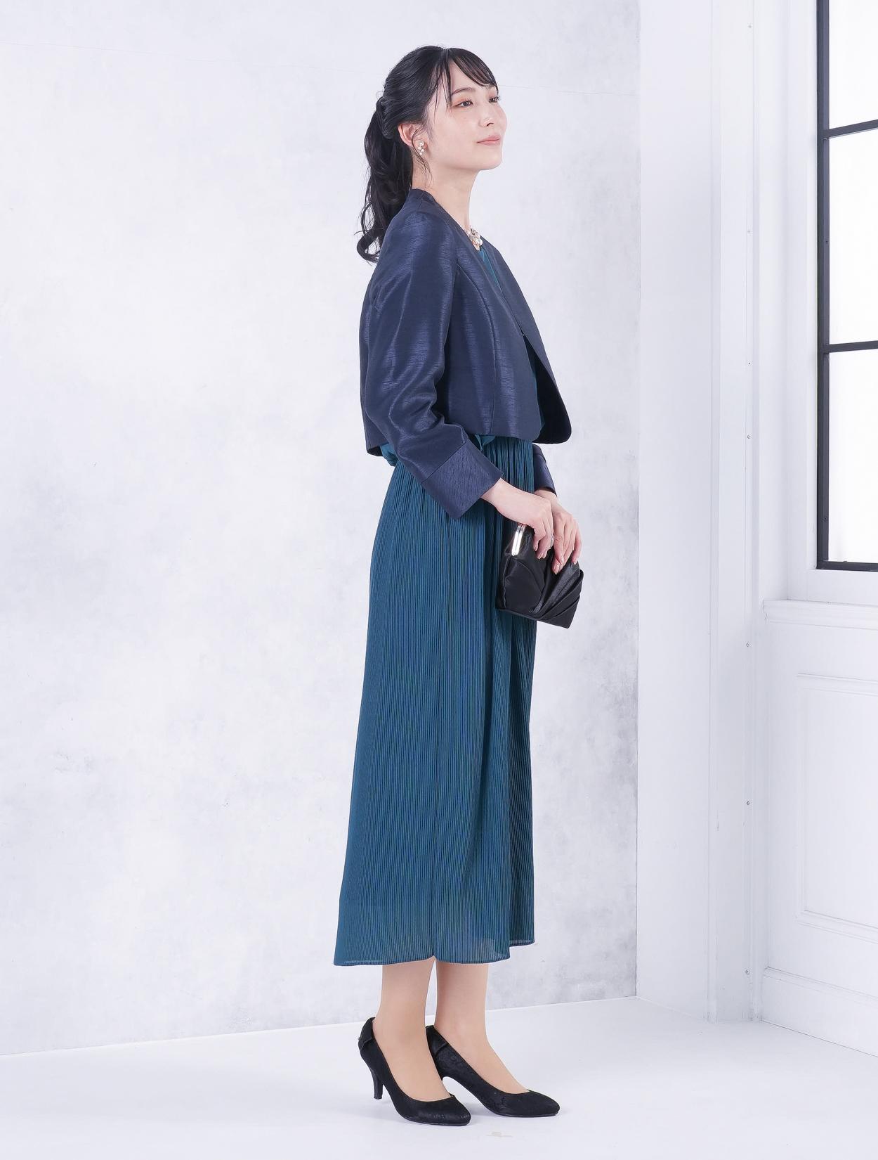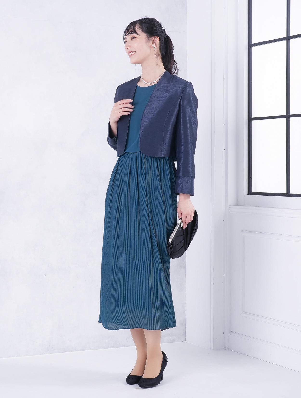 ■グリーンのドレスにブラックの羽織とバッグを合わせた落ち着いた雰囲気のコーディネート。