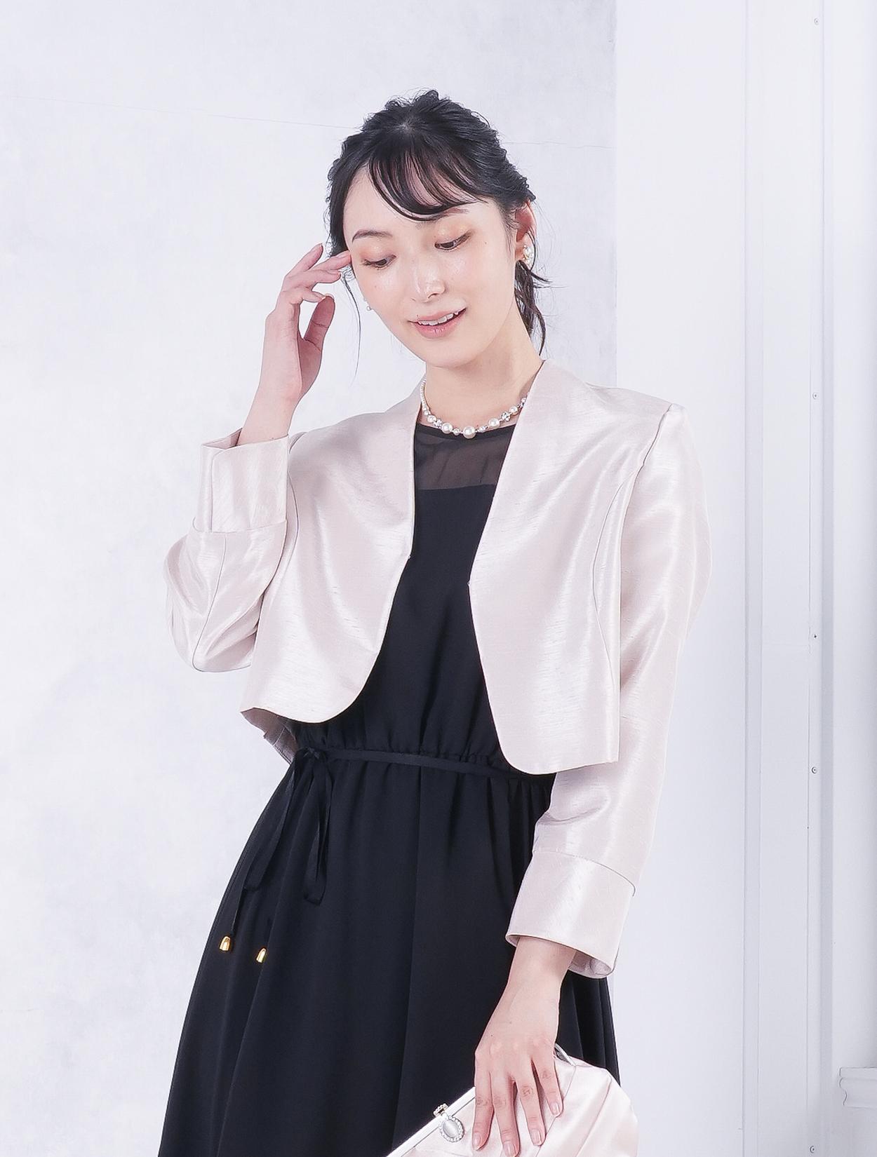 ■ブラックのドレスにベージュ羽織とブラックのバッグを合わせた落ち着いた雰囲気の中に柔らかさのあるコーディネート。