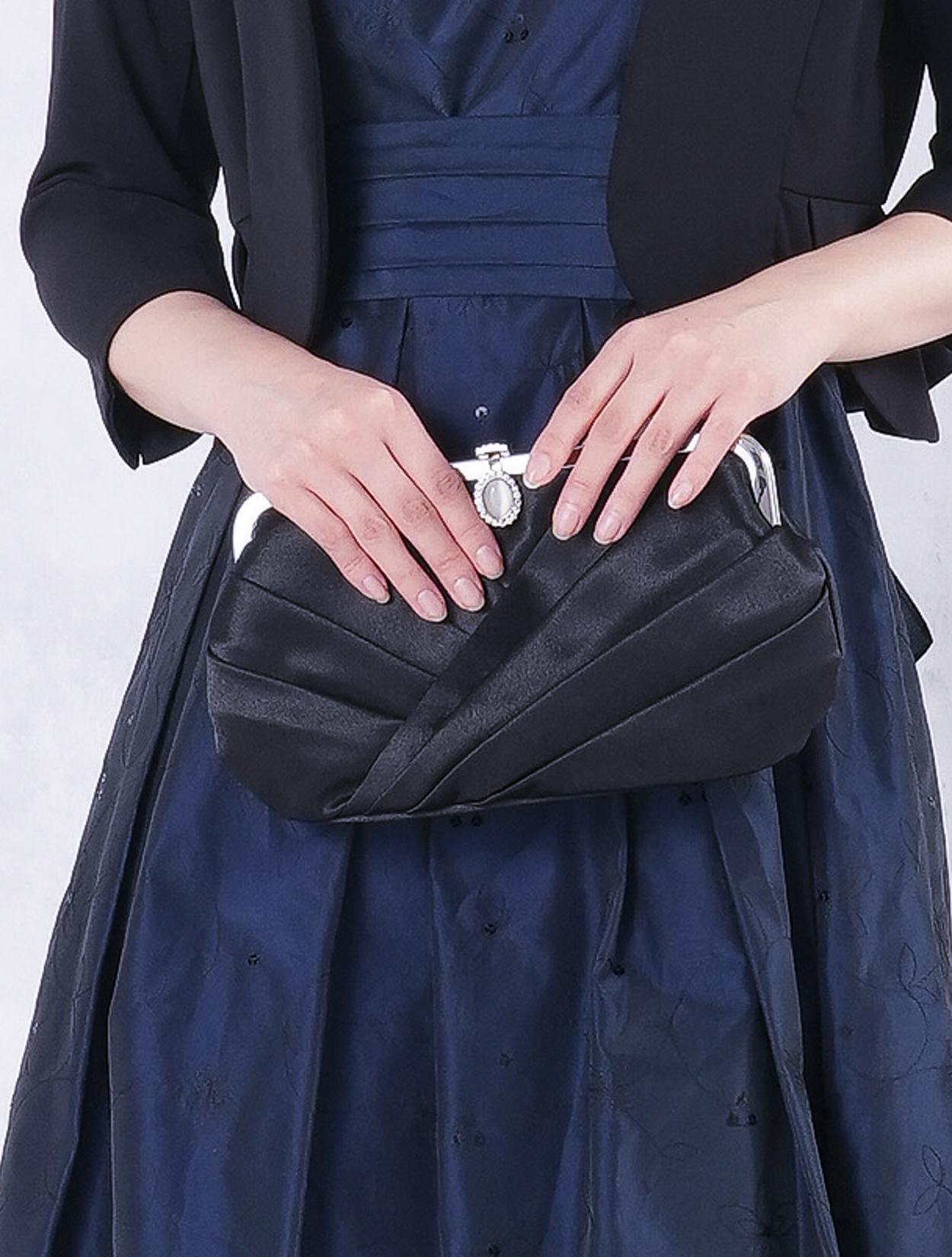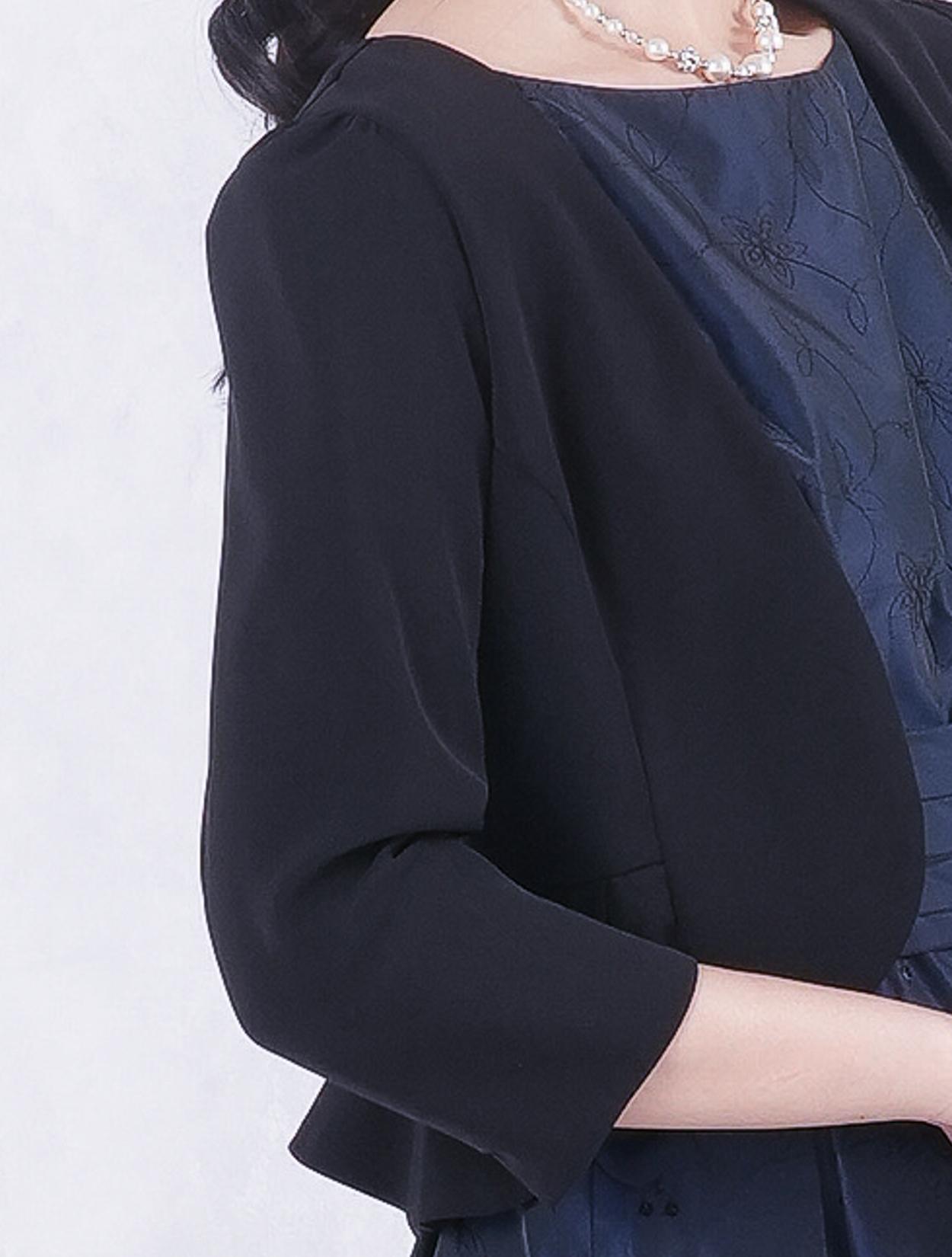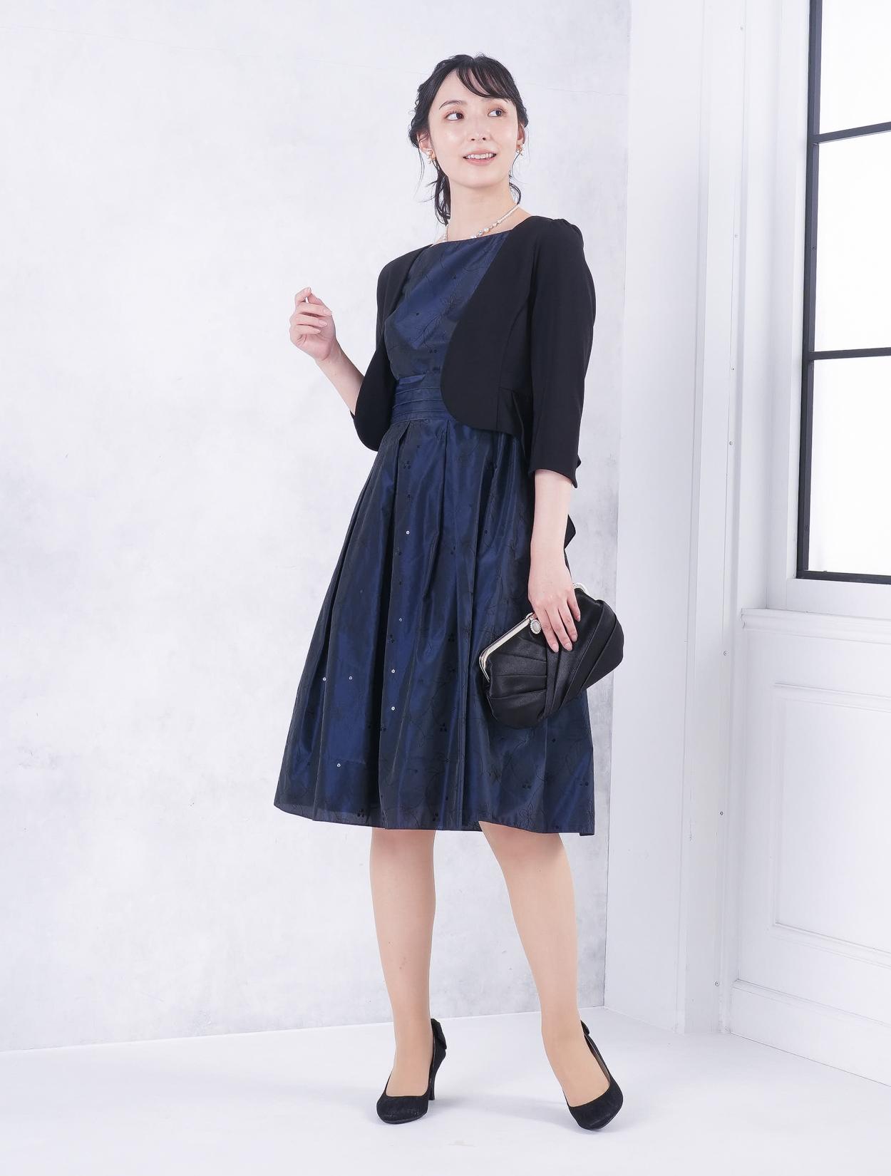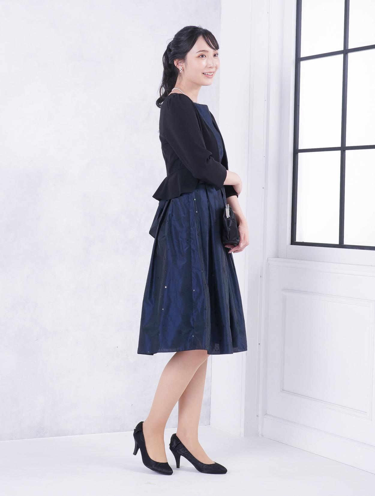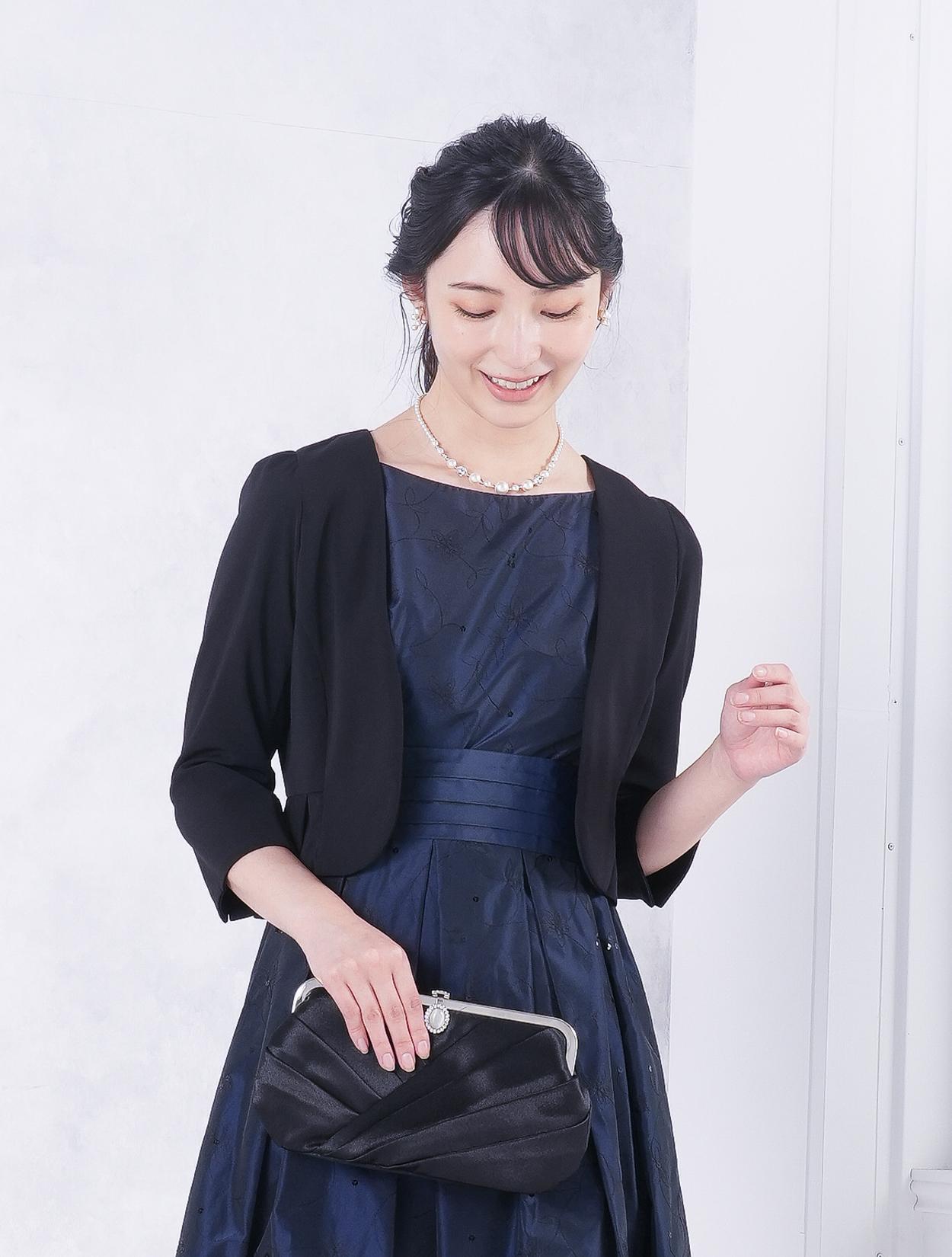 ■ネイビーのドレスにブラックの羽織とバッグを合わせた落ち着いた雰囲気のコーディネート。