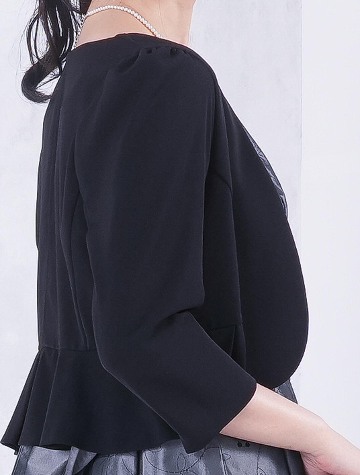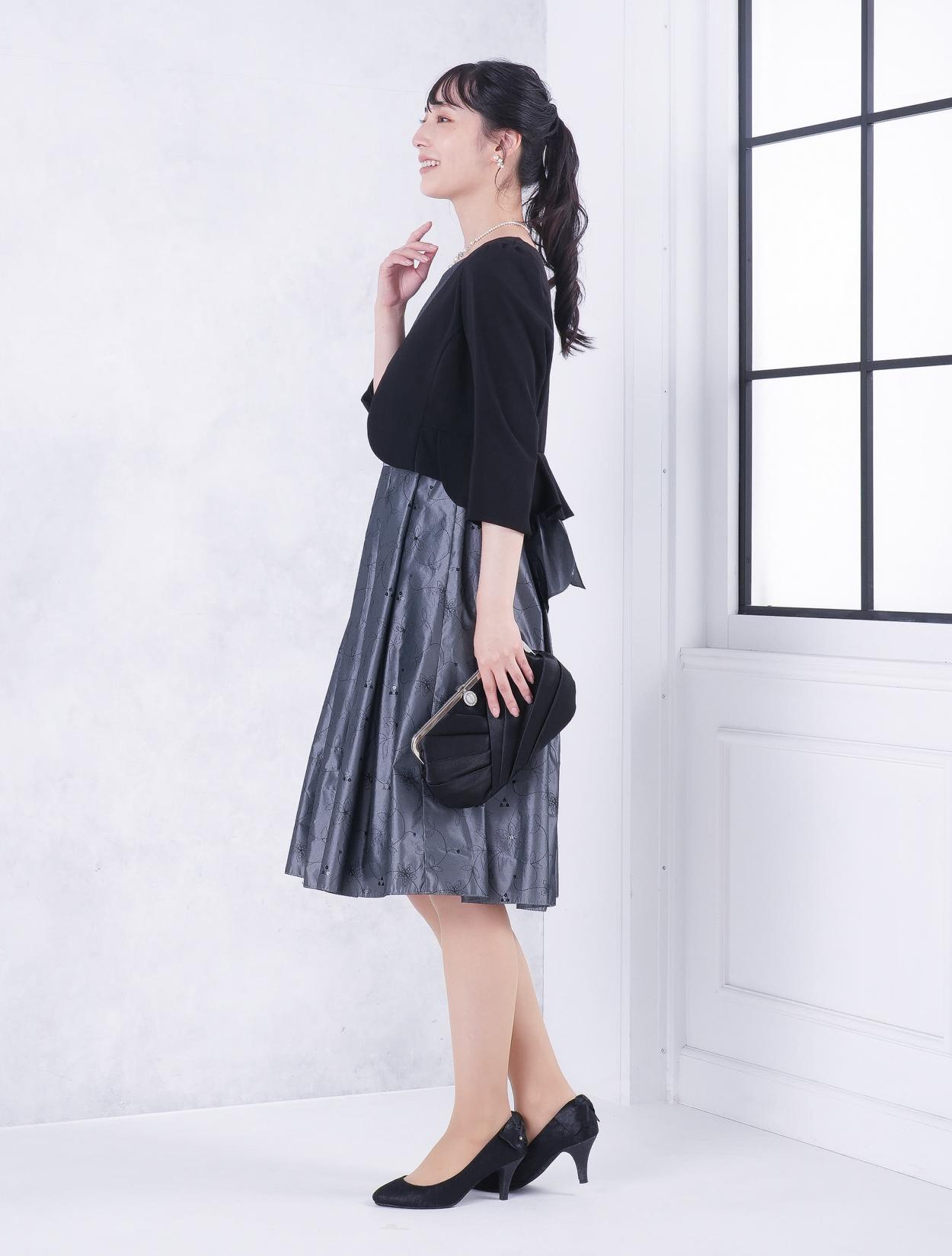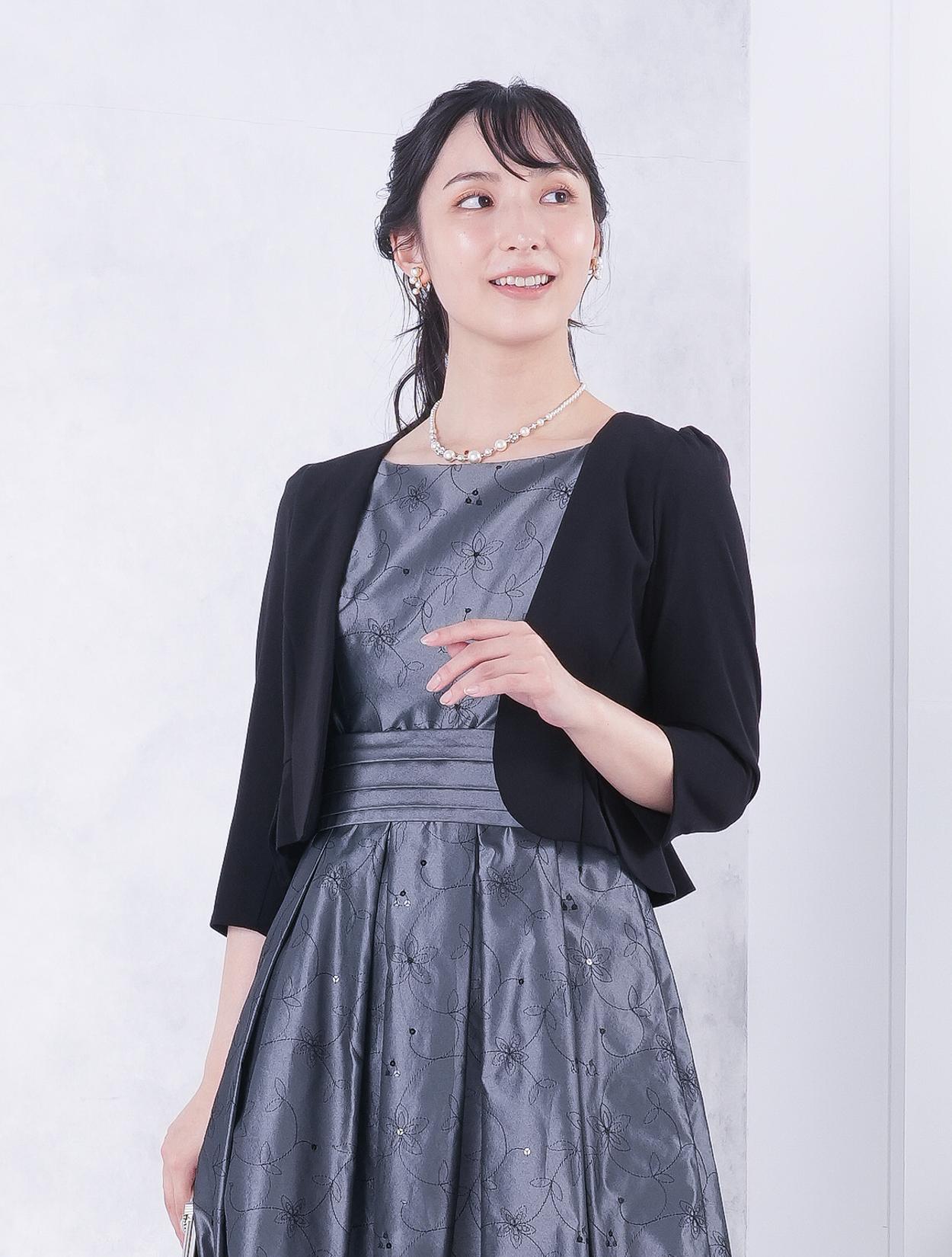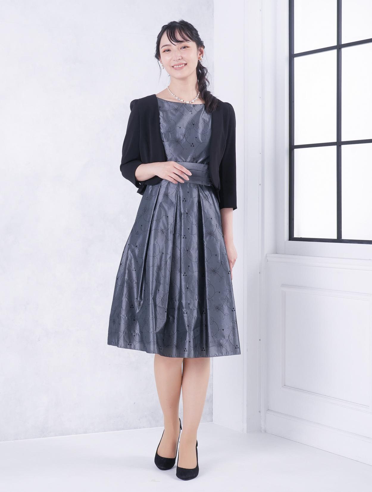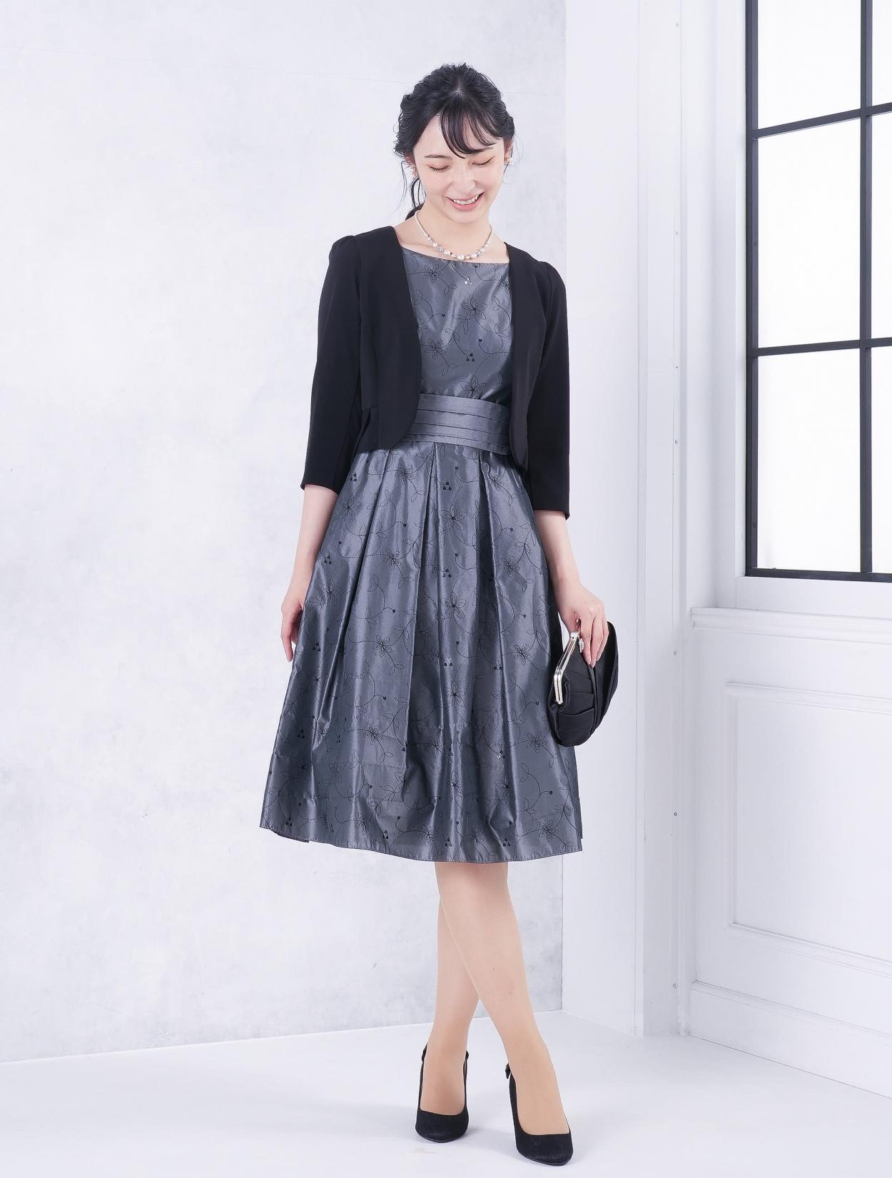 ■グレーのドレスにブラックの羽織とバッグを合わせたワントーンコーディネート。