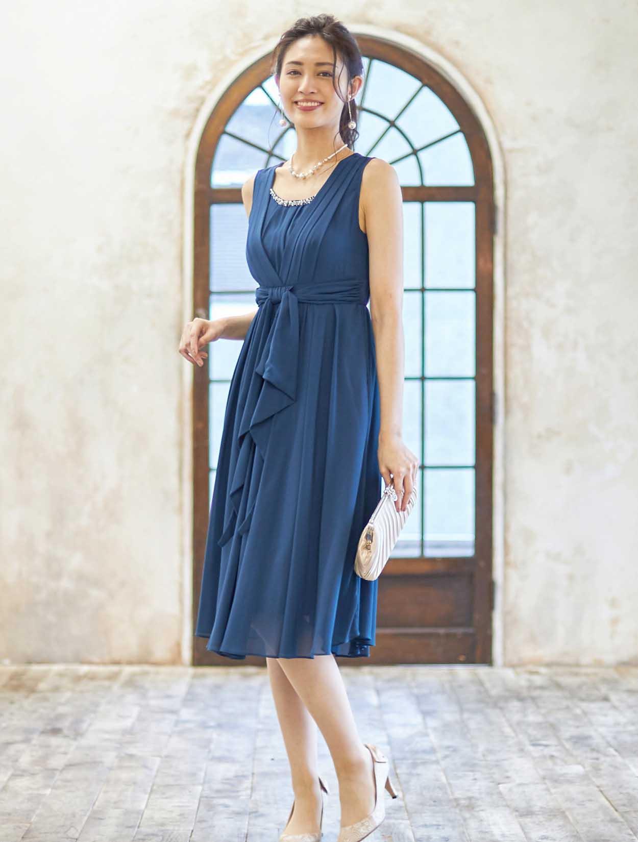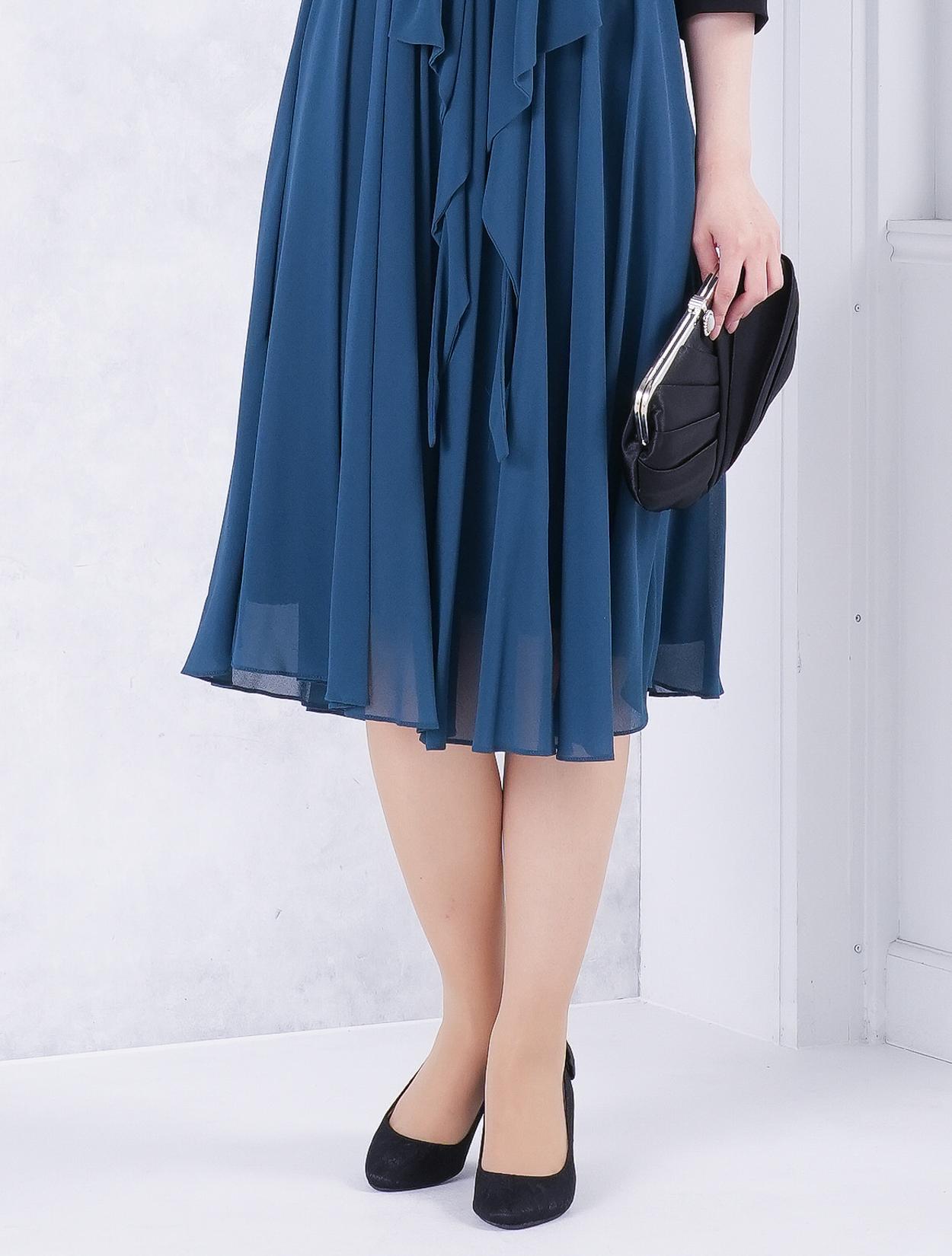 ■ラッフルリボンがポイントのミディ丈ドレス。フロントにあるラッフルリボンと襟ぐりパールがフェミニンな印象に♪