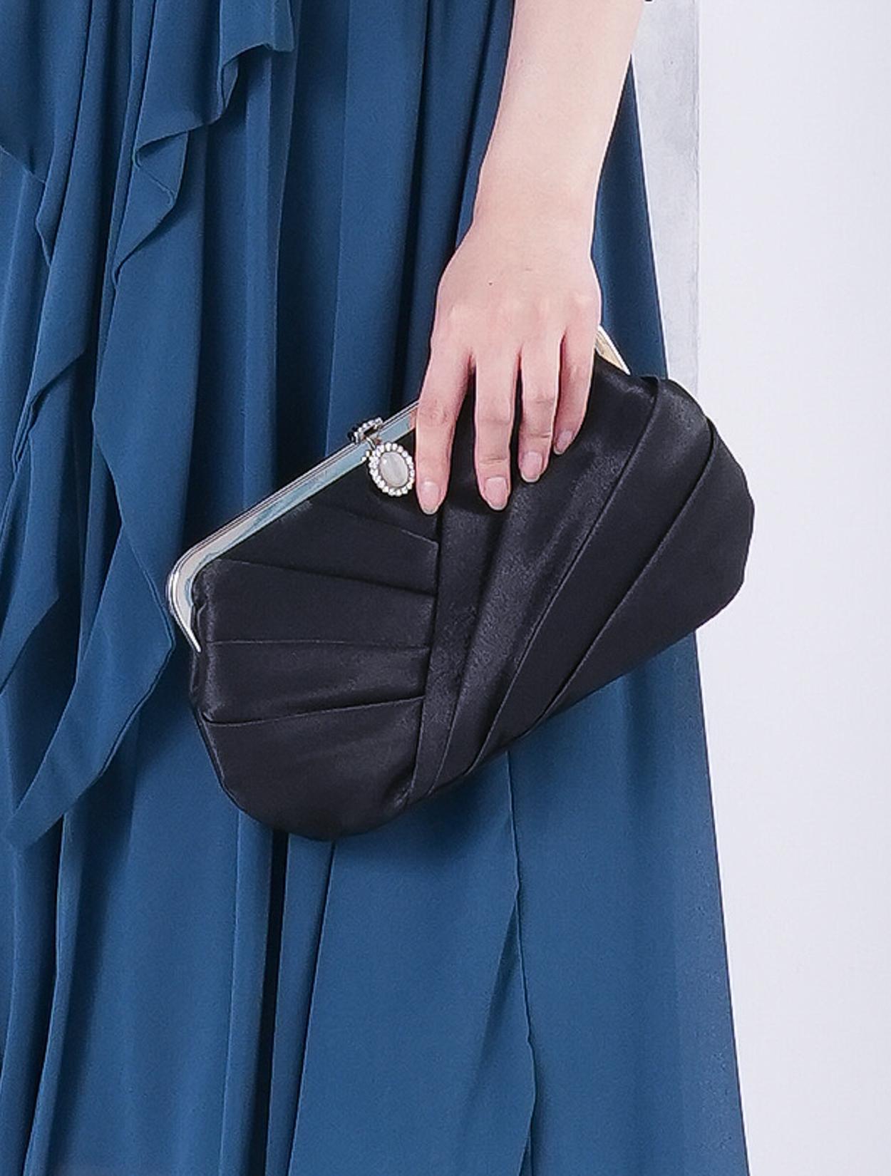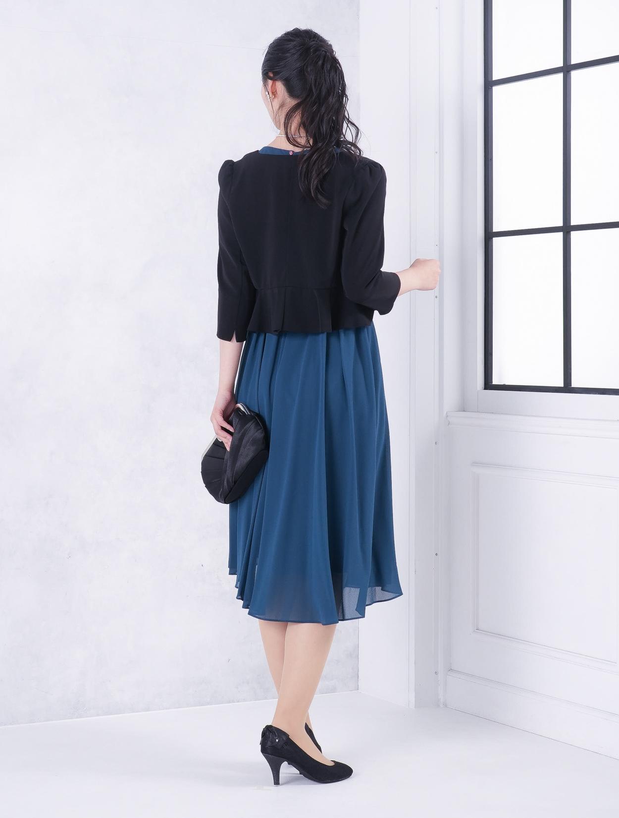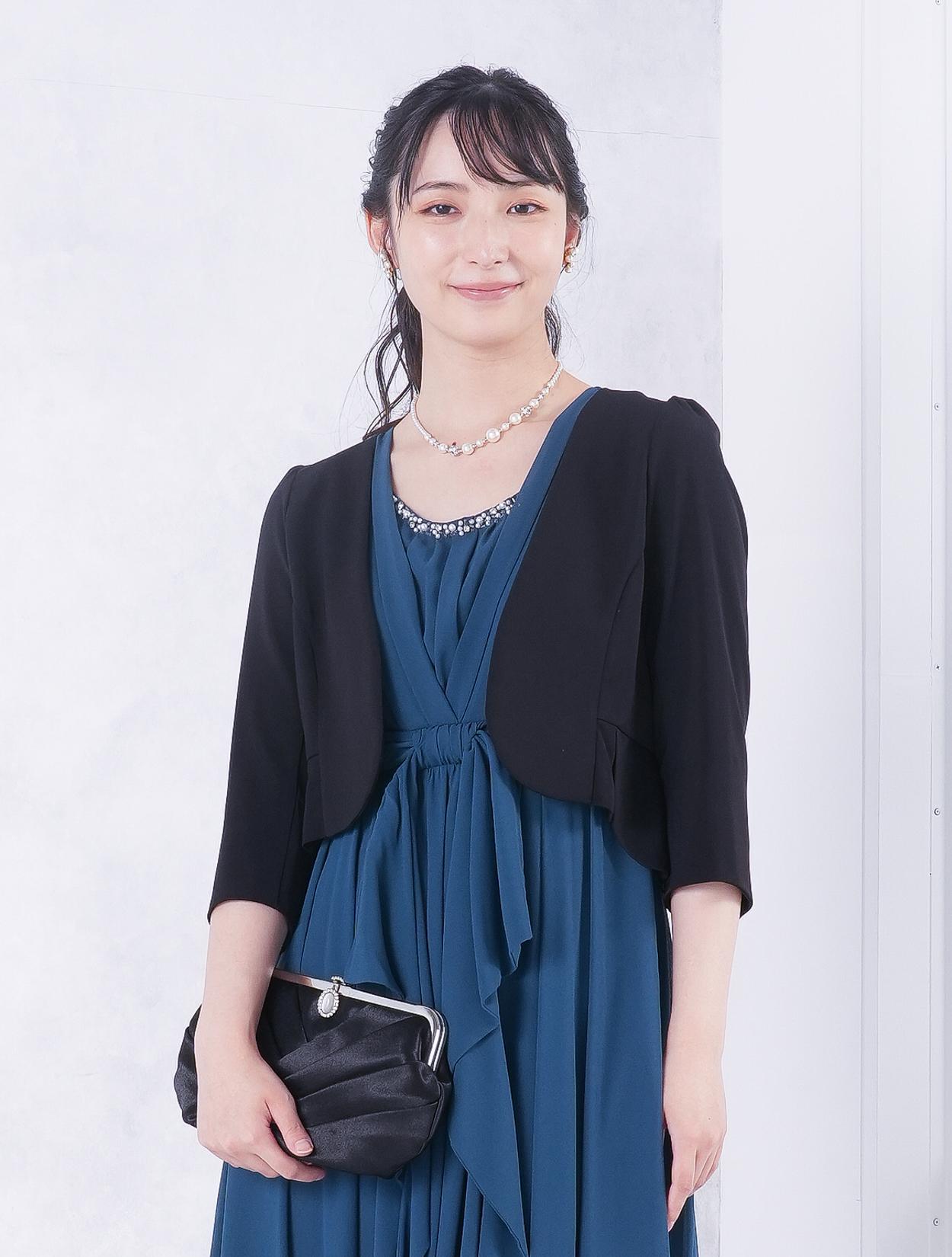 ■グリーンのドレスにブラックの羽織とバッグを合わせた落ち着いた雰囲気のコーディネート。