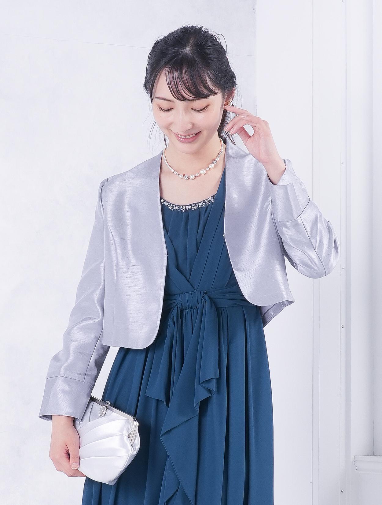 ■グリーンのドレスにシルバーの羽織とバッグを合わせた落ち着いた雰囲気のコーディネート。