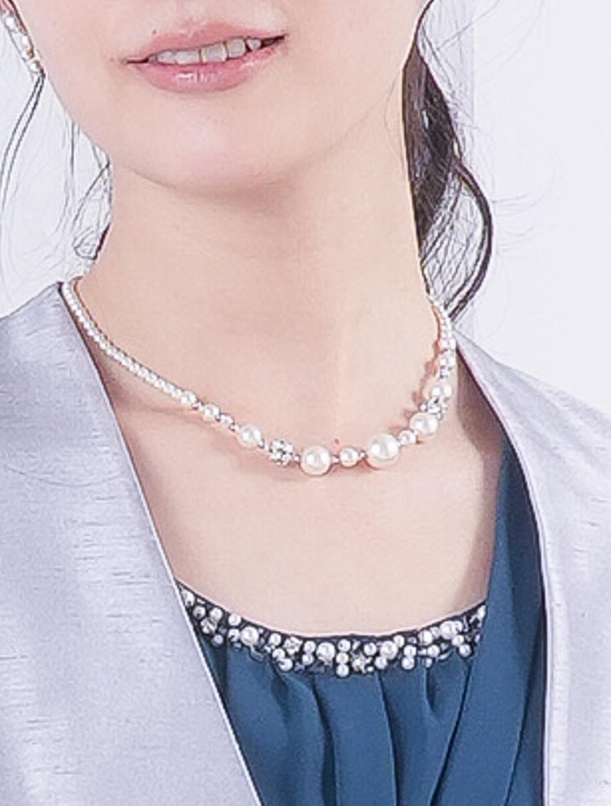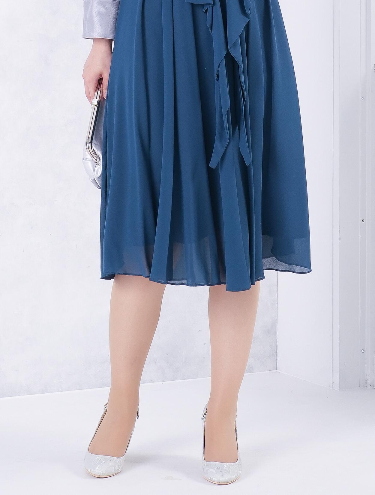 ■ラッフルリボンがポイントのミディ丈ドレス。フロントにあるラッフルリボンと襟ぐりパールがフェミニンな印象に♪