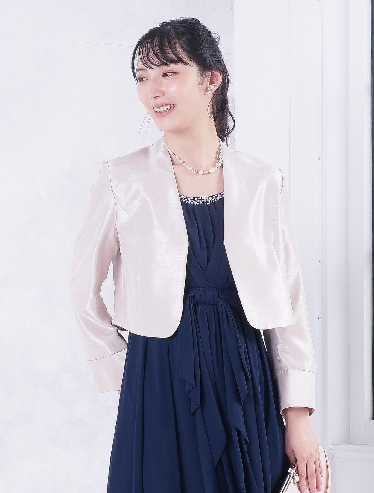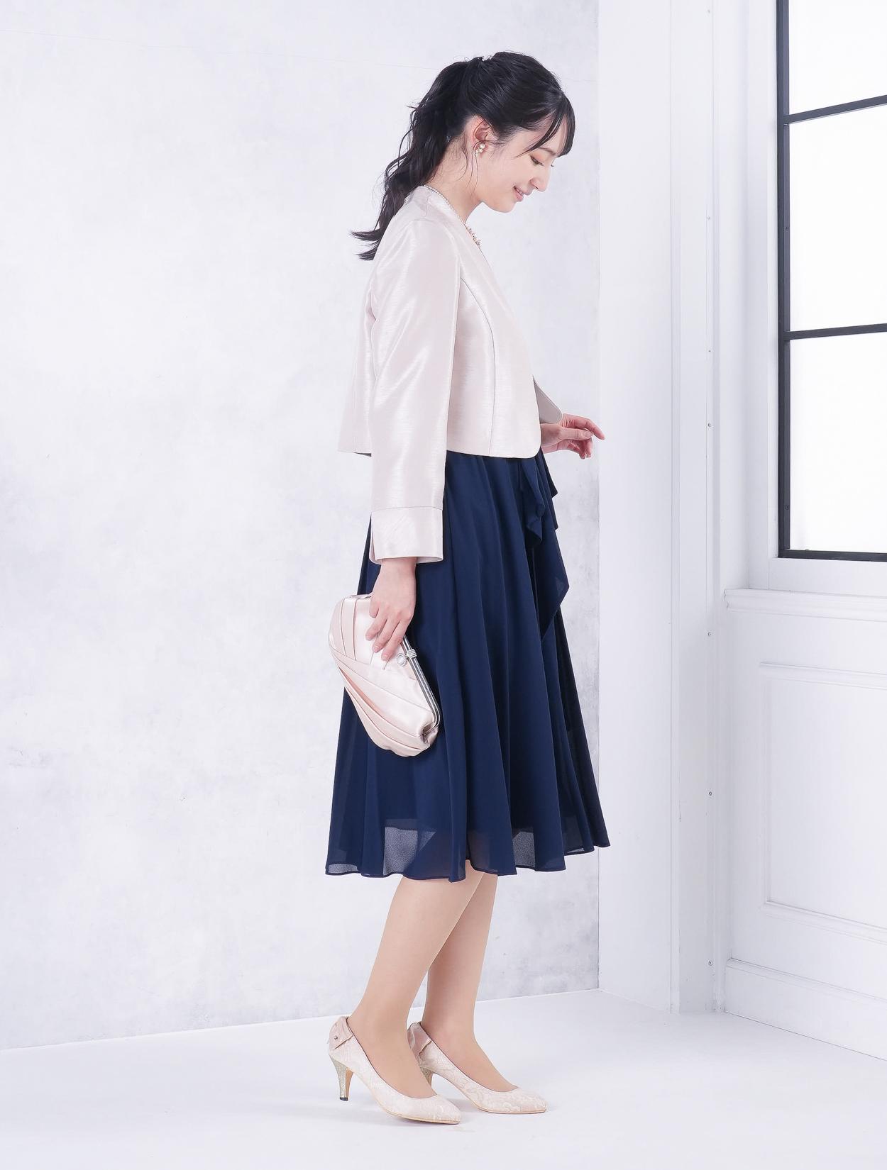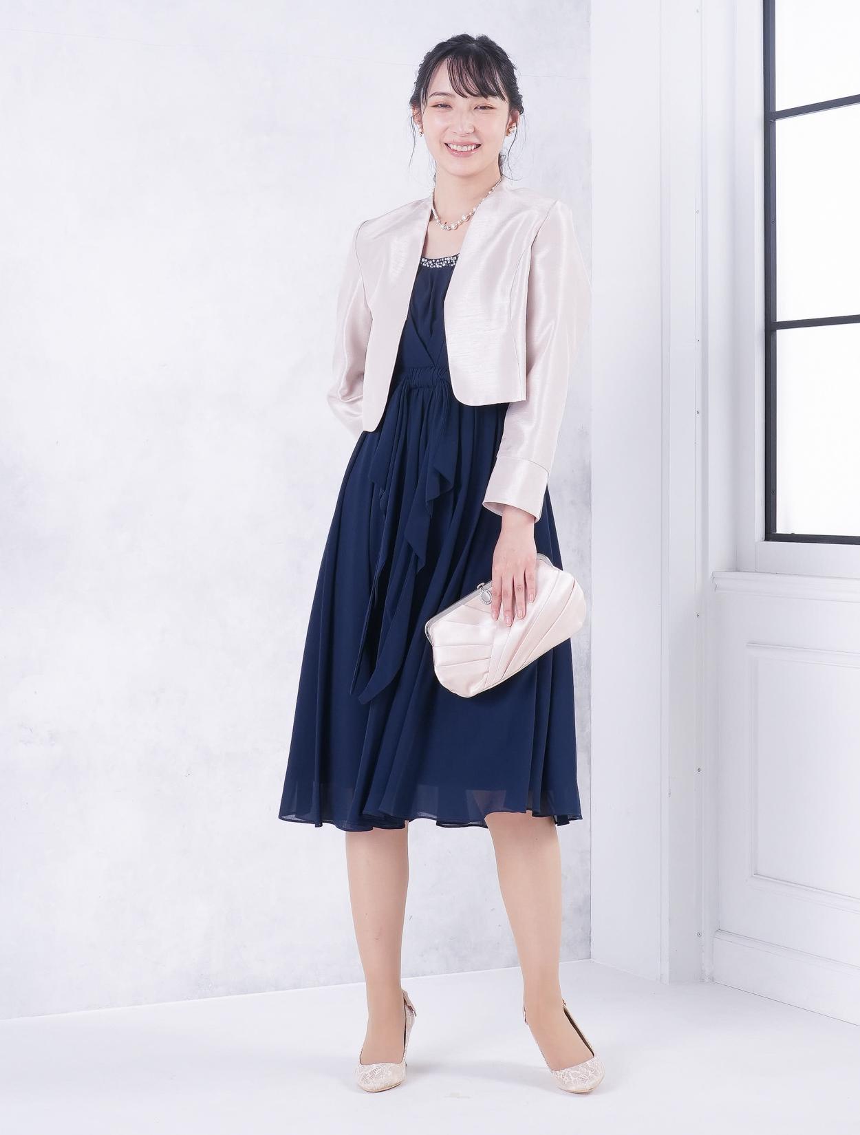 ■ネイビーのドレスにベージュの羽織とバッグを合わせた落ち着いた雰囲気のコーディネート。
