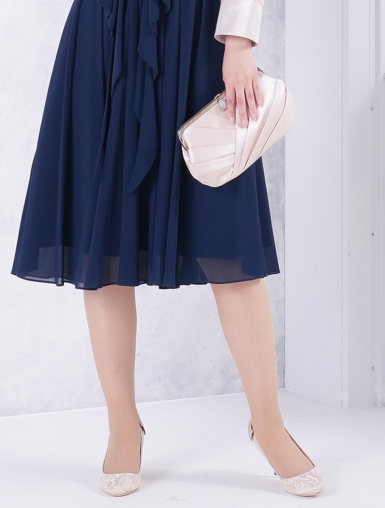 ■ラッフルリボンがポイントのミディ丈ドレス。フロントにあるラッフルリボンと襟ぐりパールがフェミニンな印象に♪