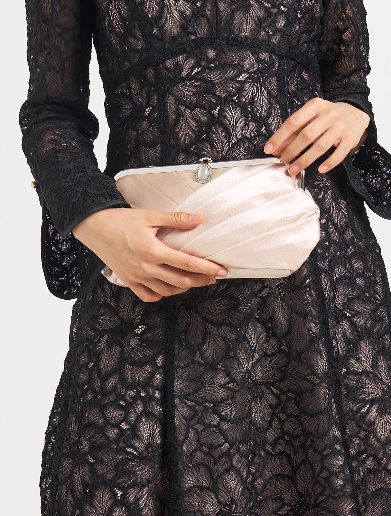 ■ブラックのドレスにベージュのバックを合わせた統一感のある大人な雰囲気のコーディネート。