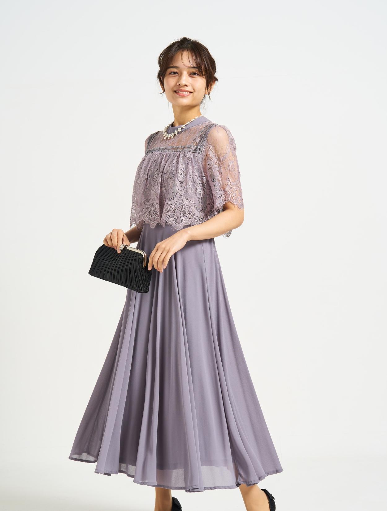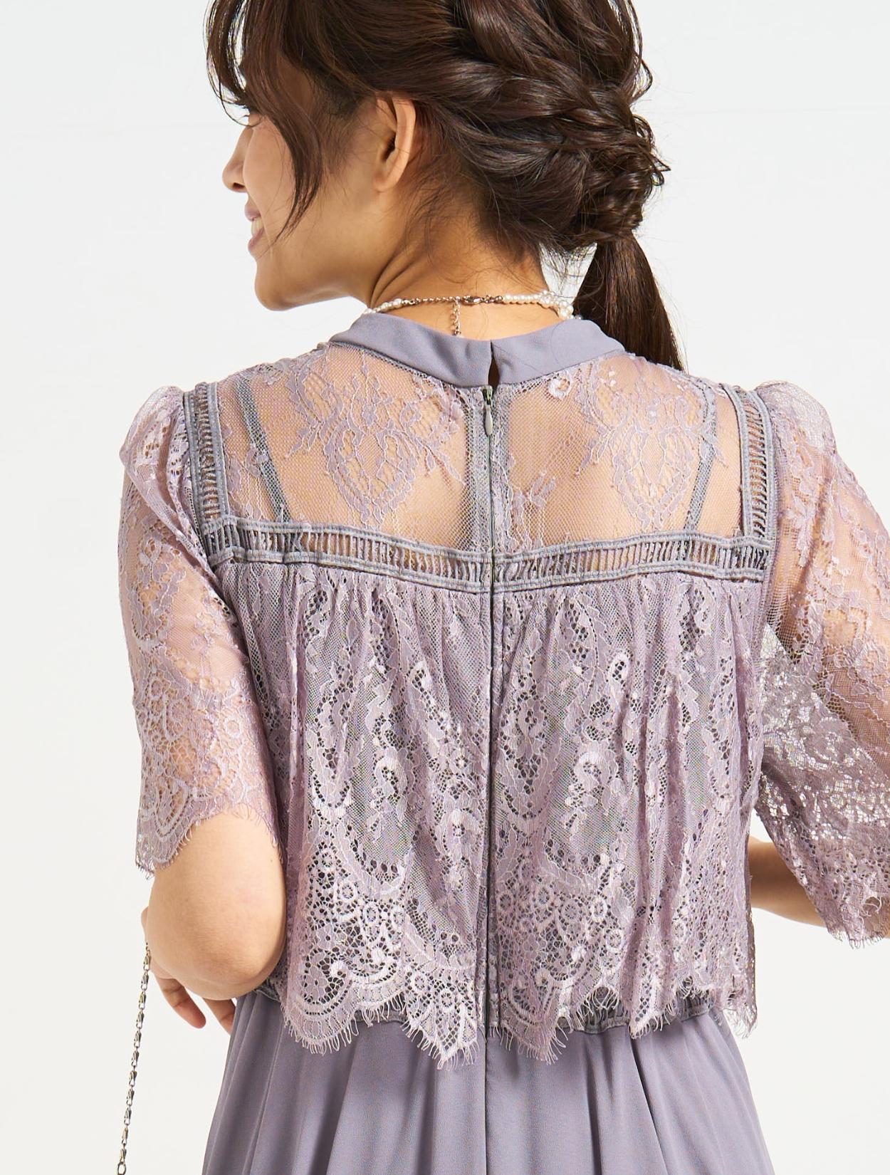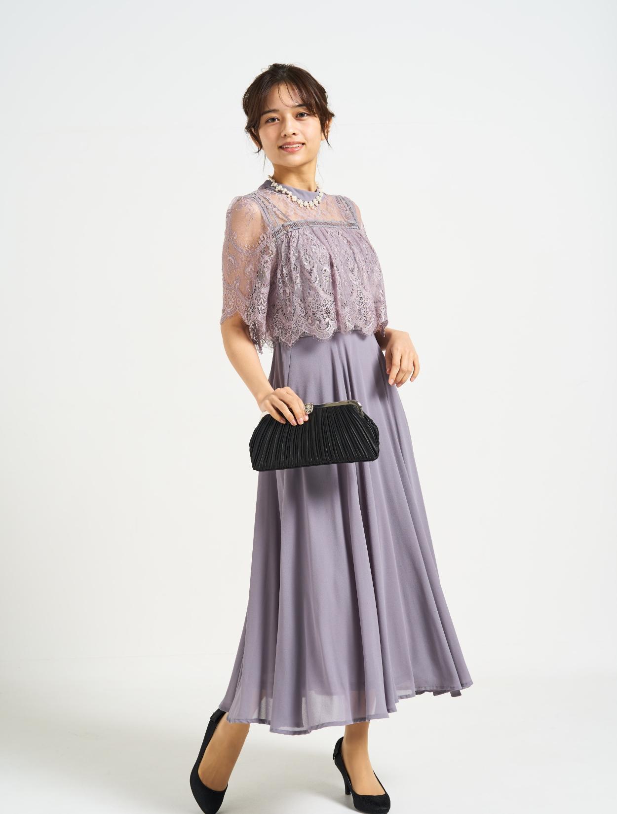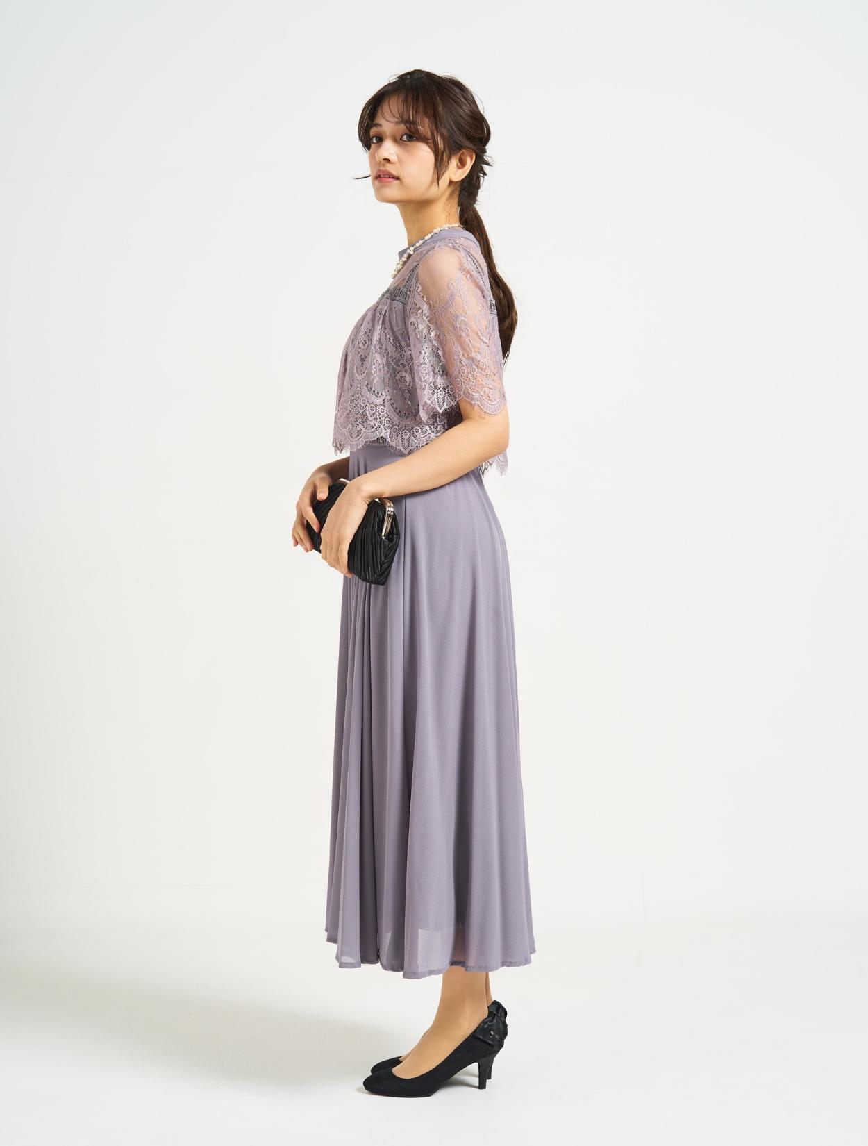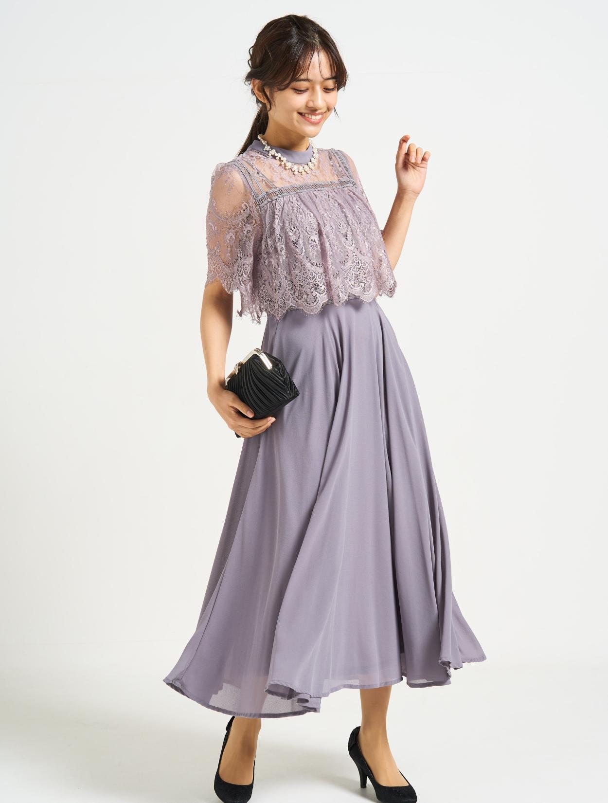 ■スタンドカラーのレースブラウスに分量のあるフレアドレスを合わせた上品な1着。