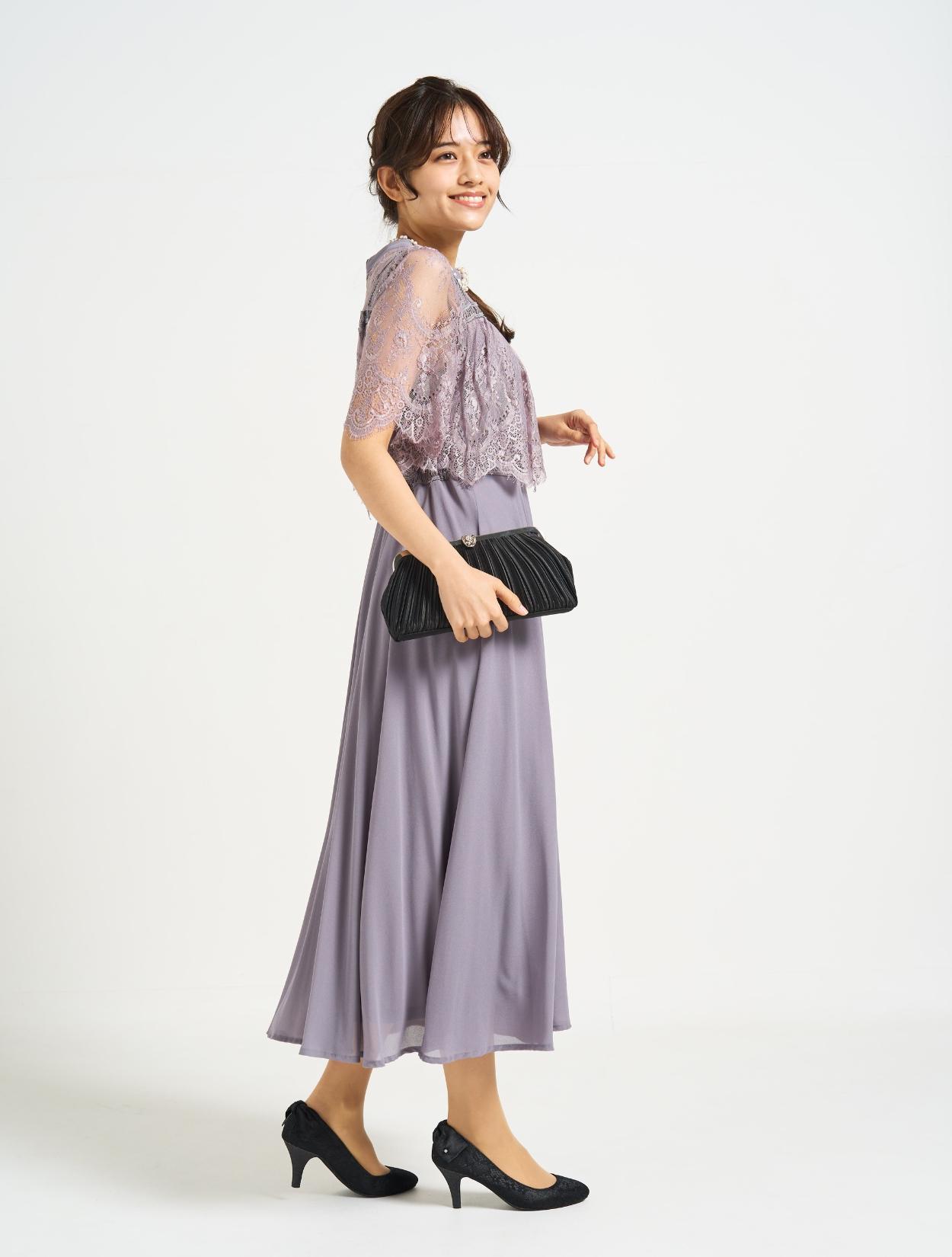 ■グレーのドレスにブラックのバッグを合わせた落ち着いた雰囲気のコーディネート。