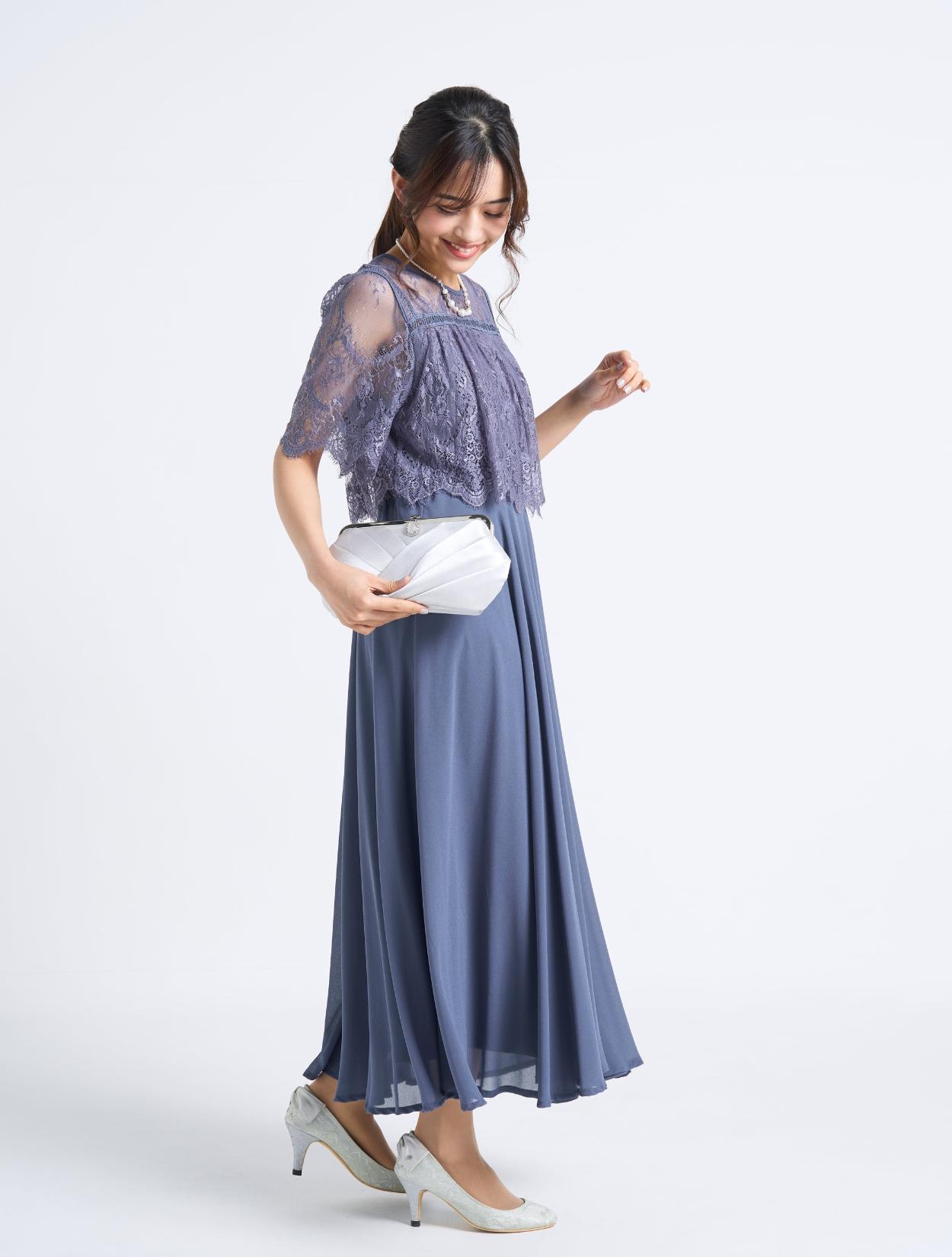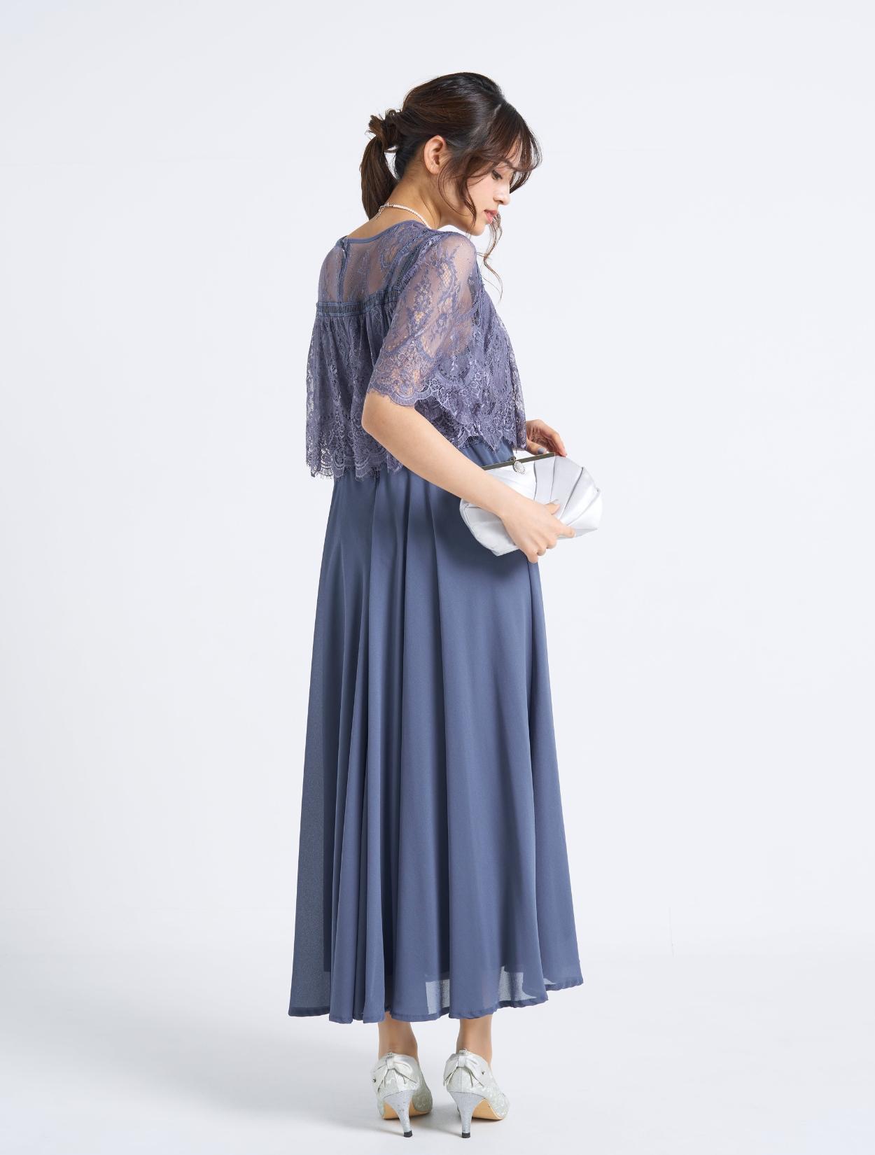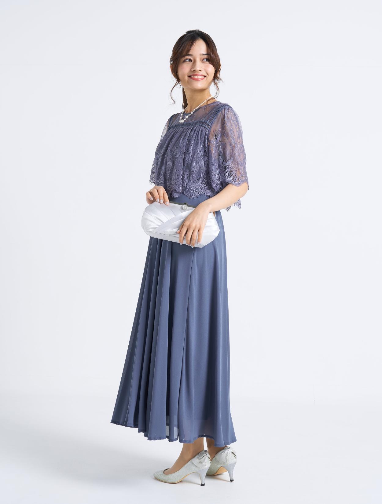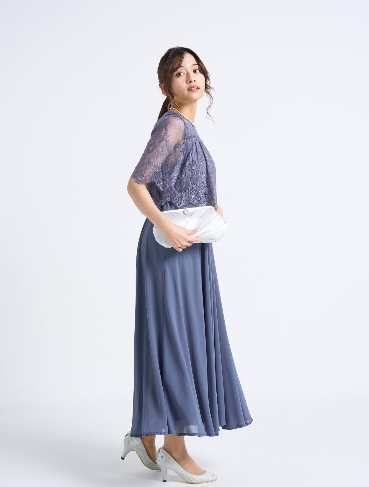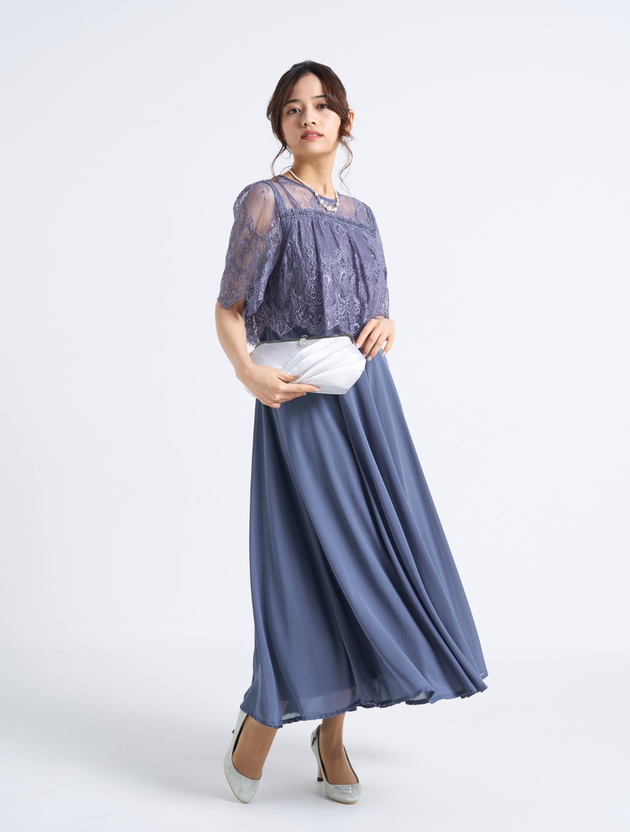 ■クルーネックのレースブラウスに分量のあるフレアドレスを合わせた上品な1着。