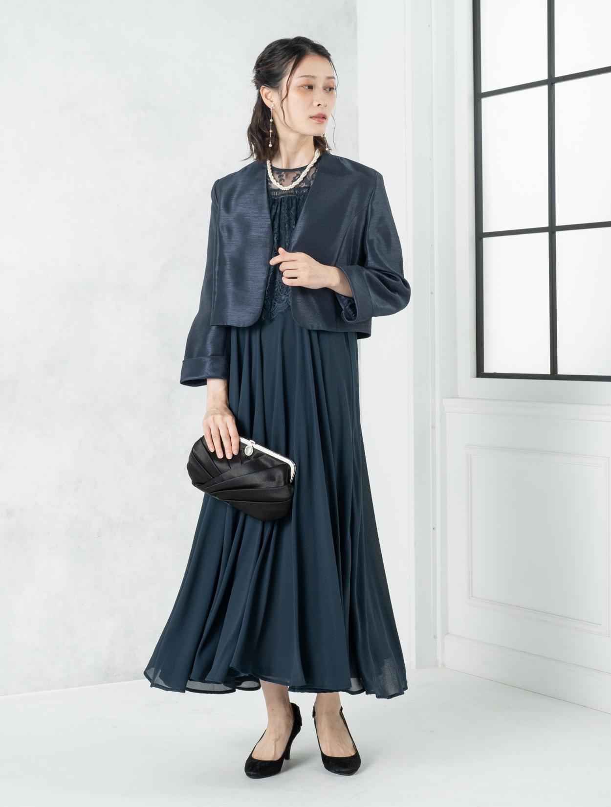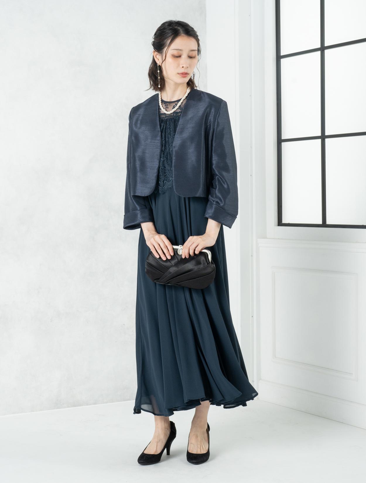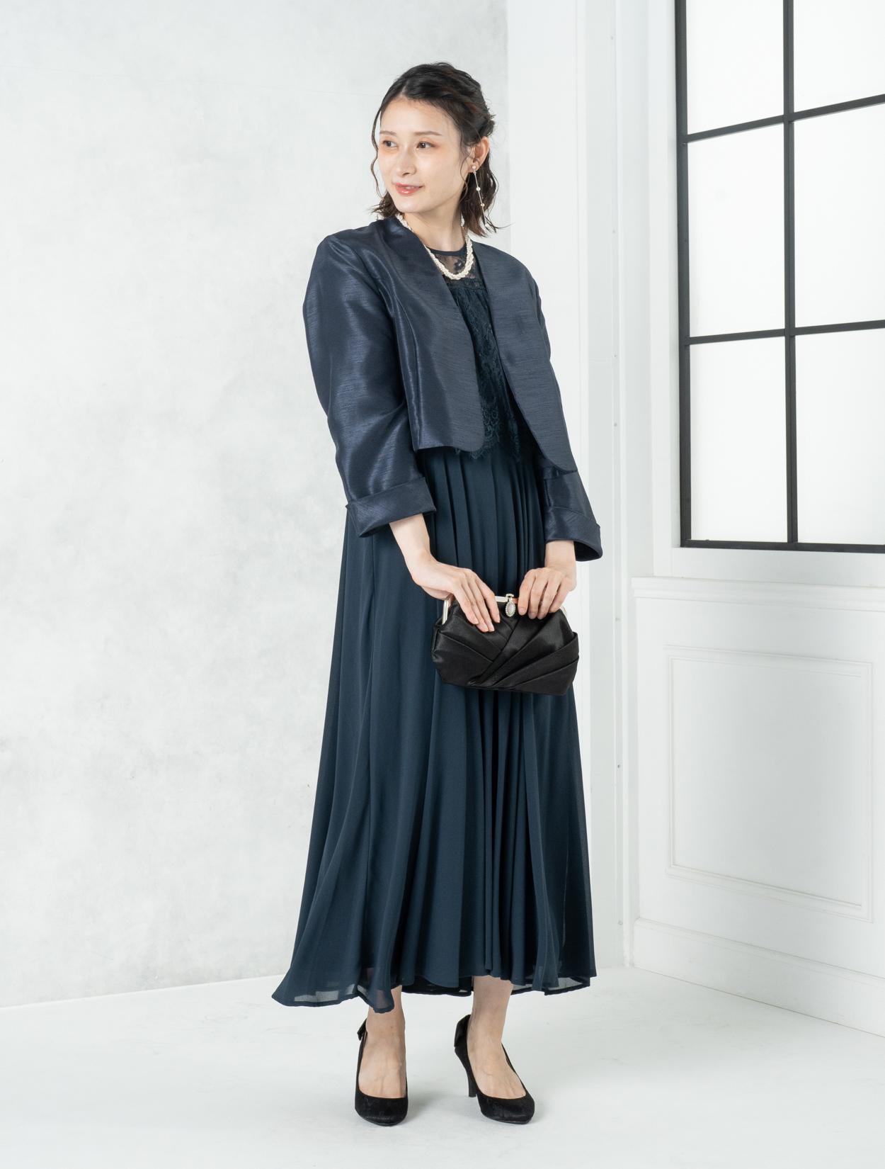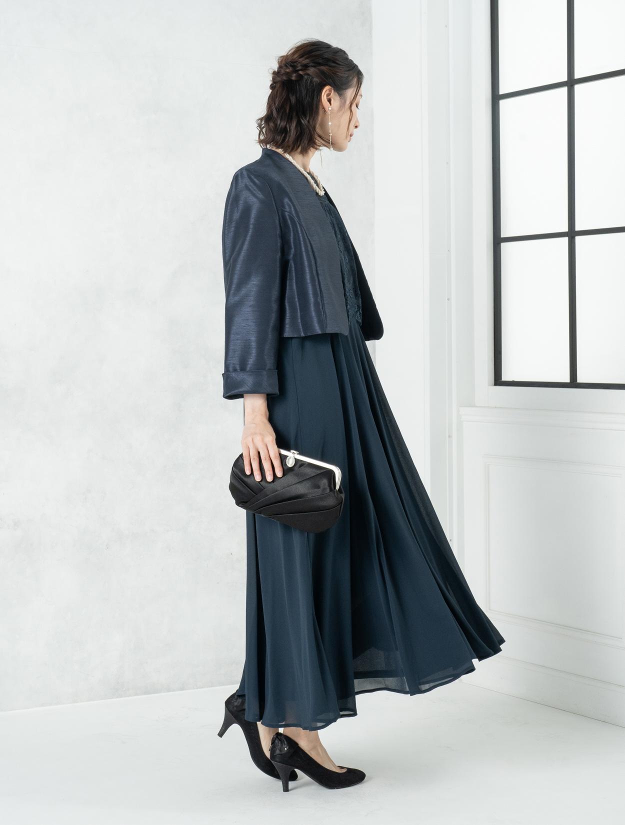 ■ネイビーのドレスにネイビーの羽織とブラックのバッグを合わせた落ち着いた雰囲気のコーディネート。