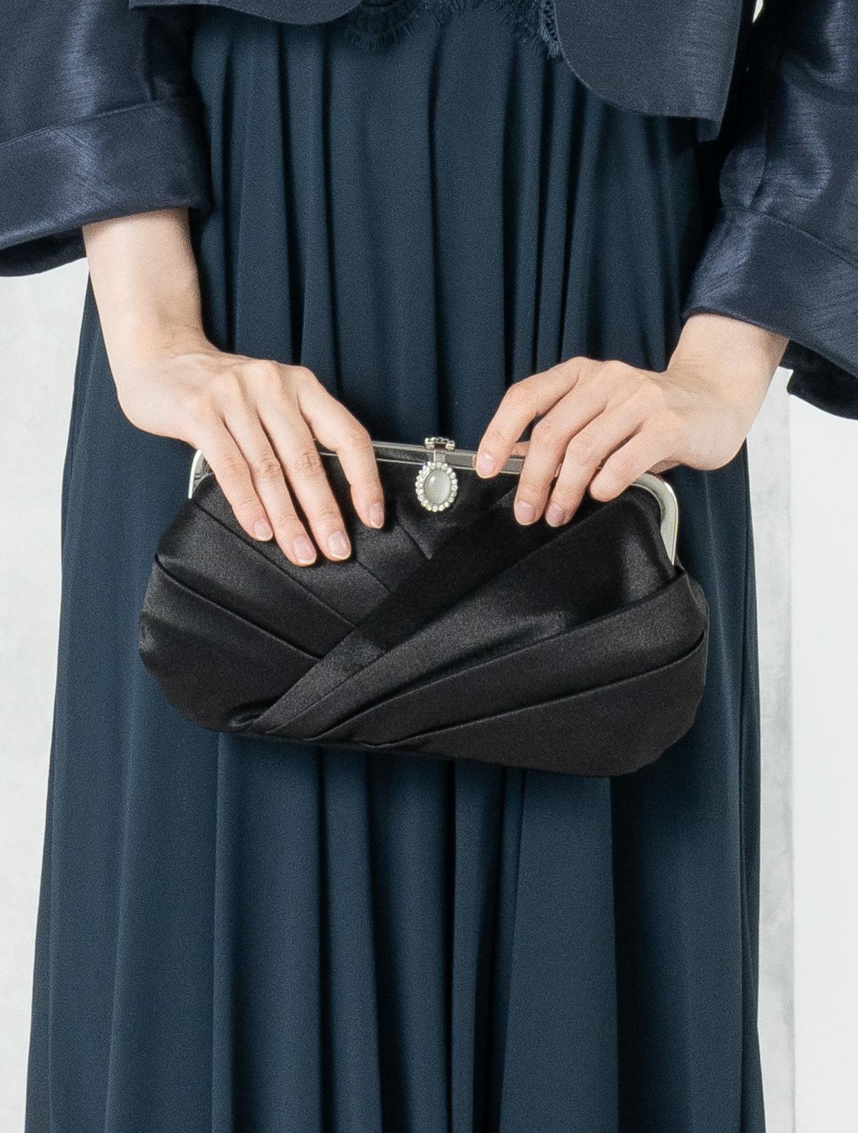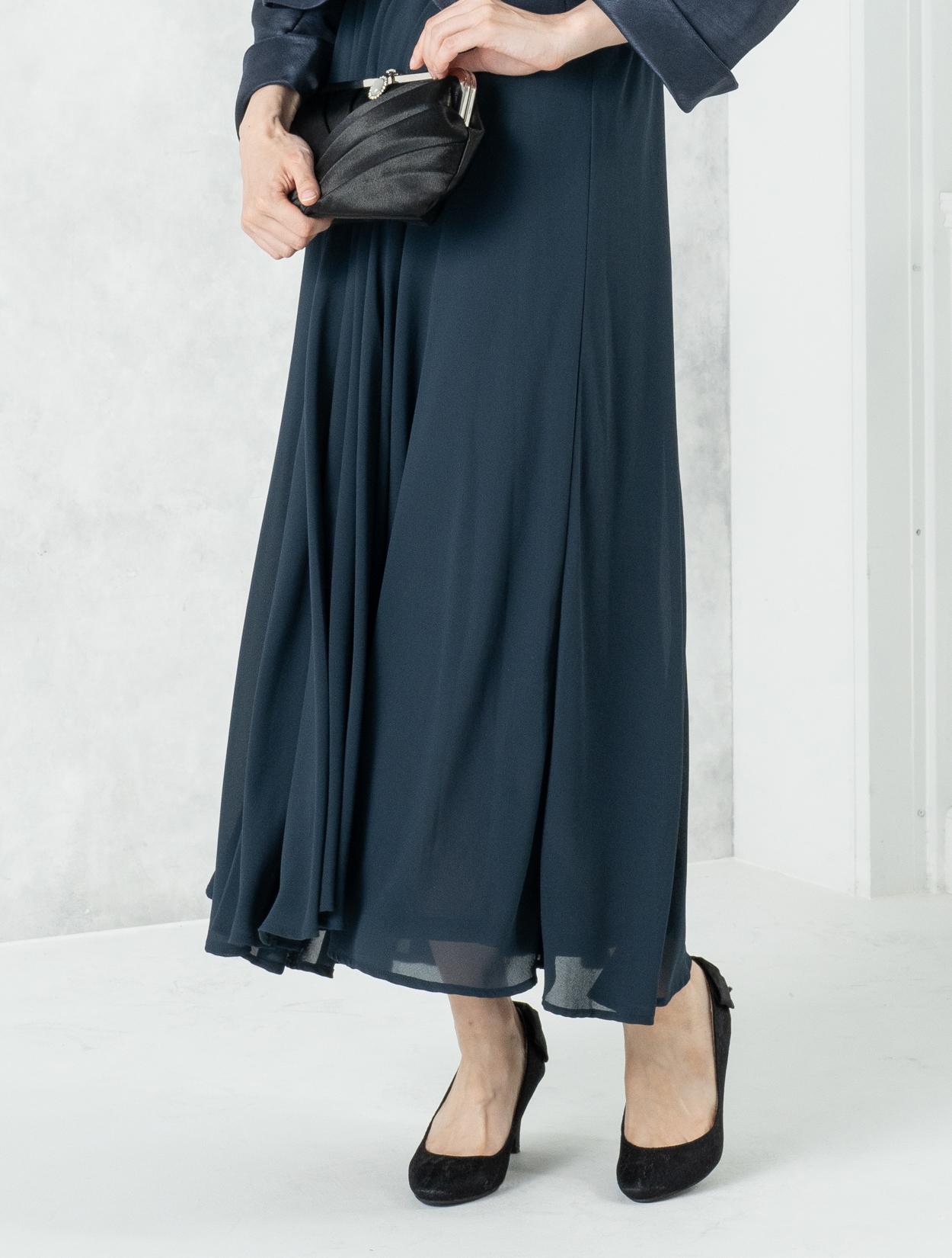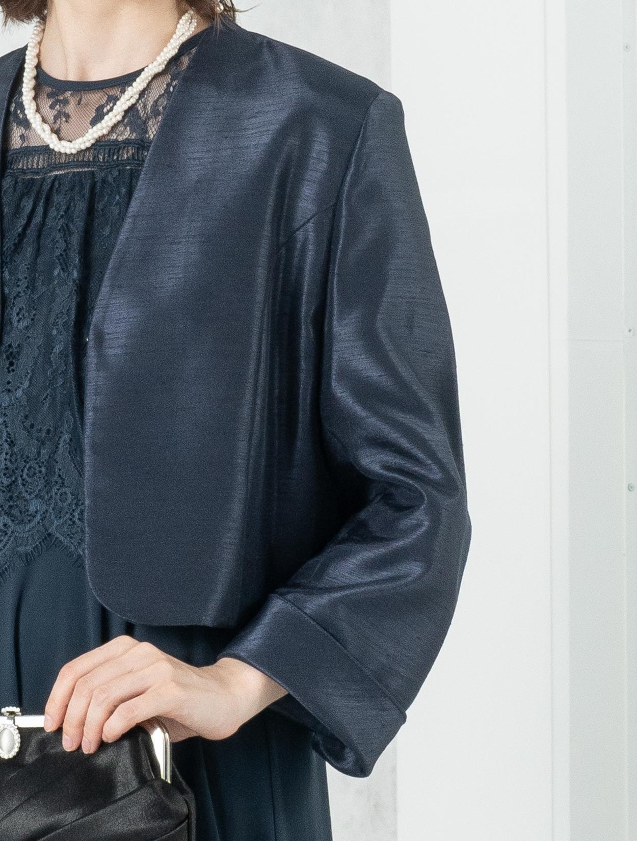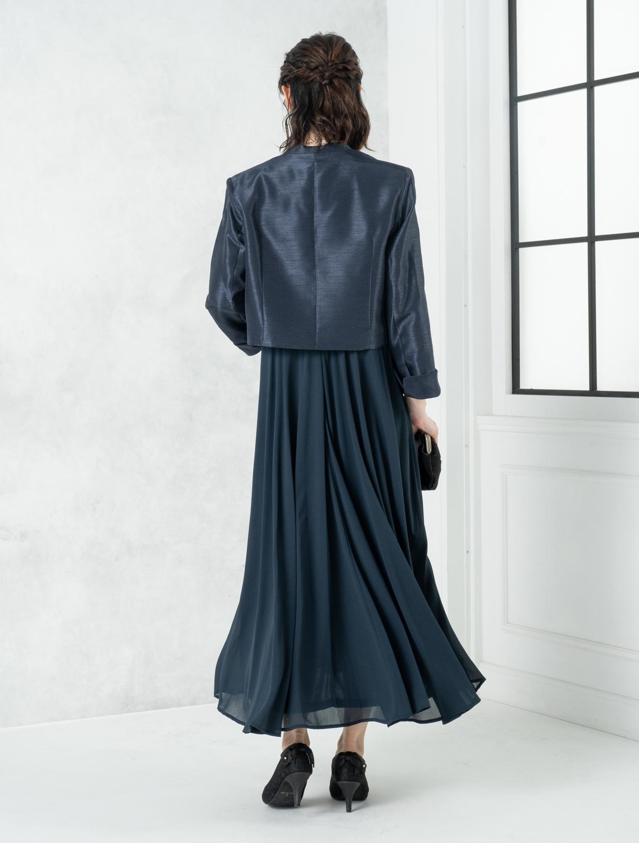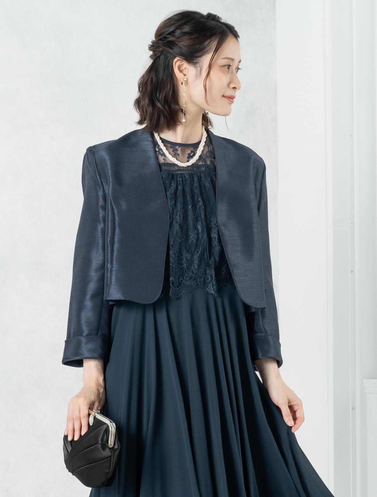 ■ネイビーのドレスにネイビーの羽織とブラックのバッグを合わせた落ち着いた雰囲気のコーディネート。